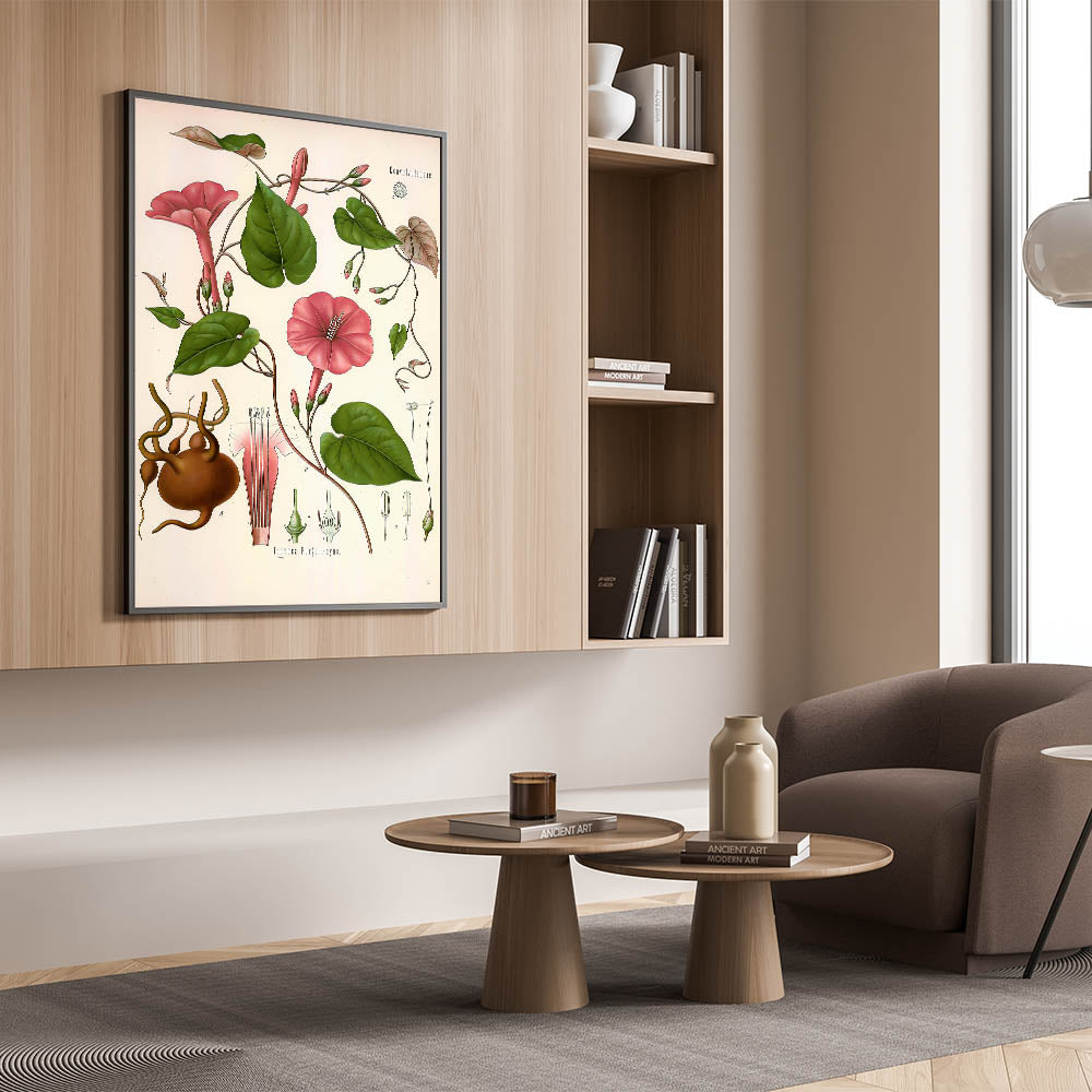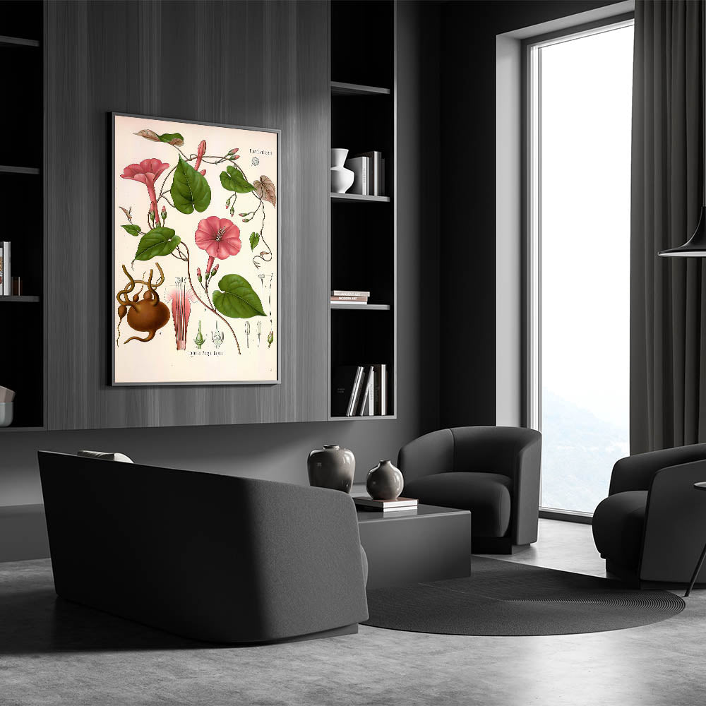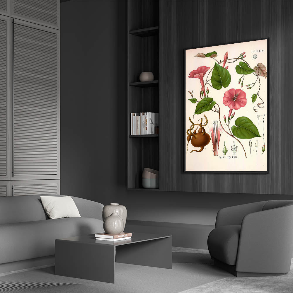 Brighten your space with this vintage botanical illustration of the Ipomoea Purga plant. Featuring vibrant pink blooms and lush green leaves, this artwork captures the delicate beauty of nature with intricate detailing. Ideal for those who appreciate nature-inspired decor and vintage art style, this print brings a touch of elegance and charm to any room.