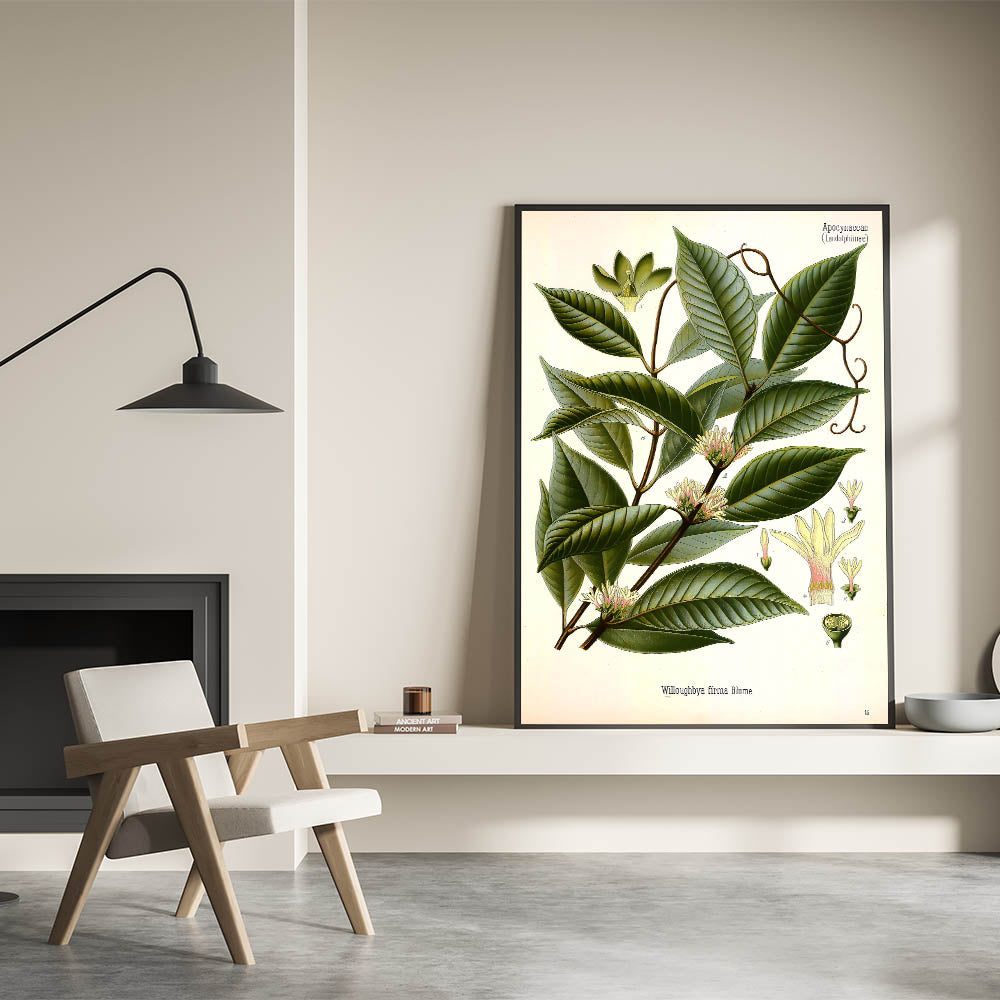 Elevate your decor with this vintage botanical illustration of the Willoughbya firma plant. Featuring glossy green leaves and delicate pale pink flowers, this artwork captures the beauty of nature with intricate details and soft tones. Ideal for those who appreciate nature-inspired decor and vintage art style, this print brings a touch of sophistication to any space.
