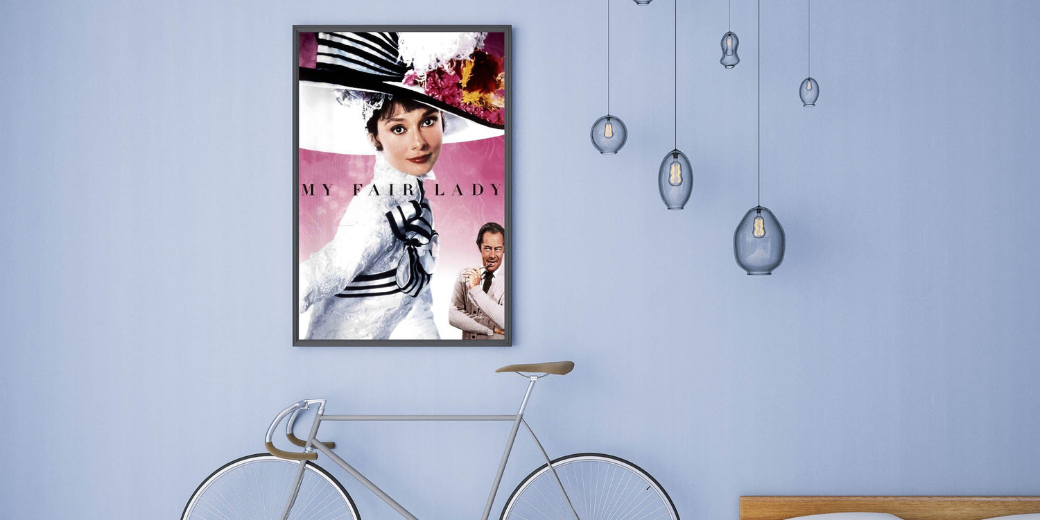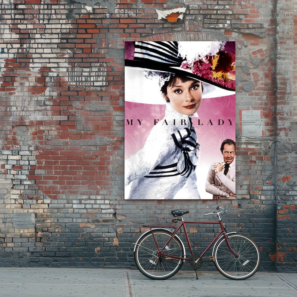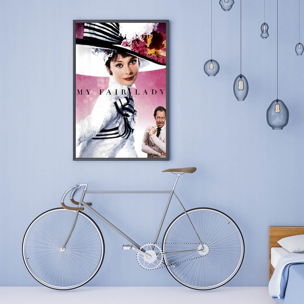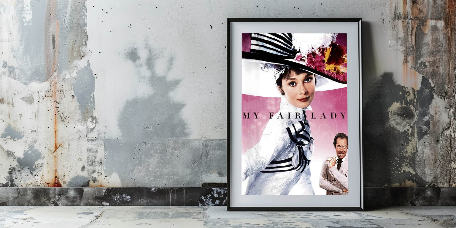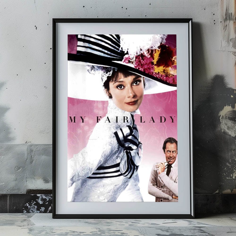 Celebrate the elegance of classic Hollywood with this vintage My Fair Lady movie poster from the 1960s. Featuring the iconic Audrey Hepburn, this stunning retro cinema art captures the charm and sophistication of one of the most beloved musical films of all time. With its delicate pink background, stylish black-and-white attire, and exquisite floral hat, this 1960s film poster is a timeless tribute to mid-century cinema.