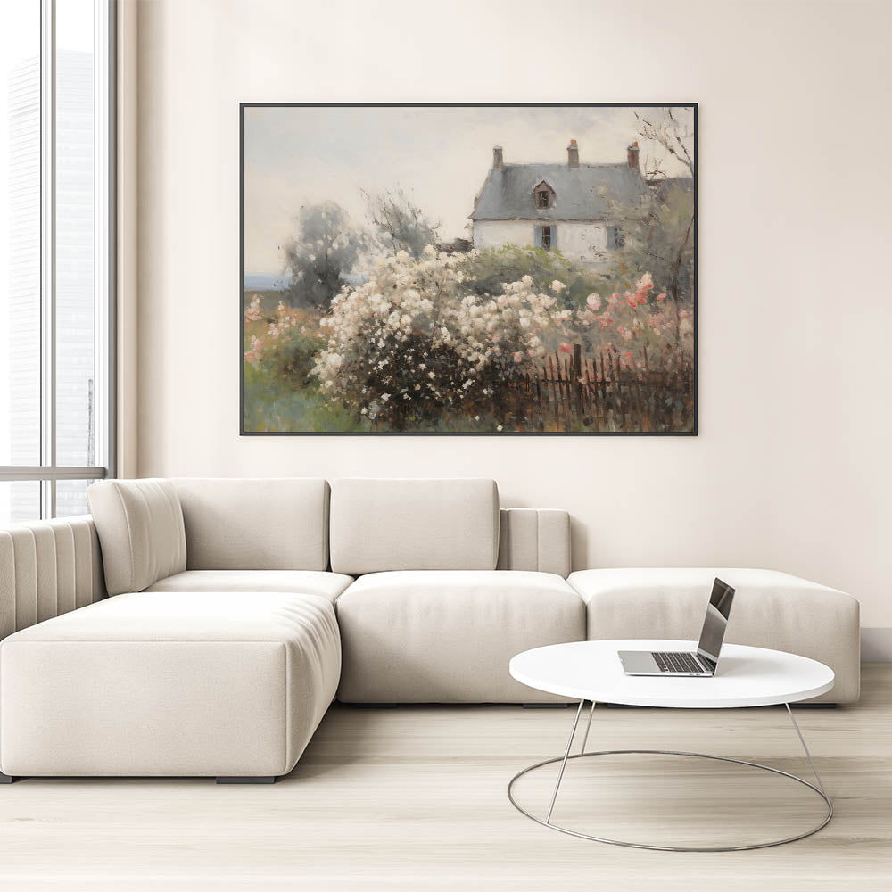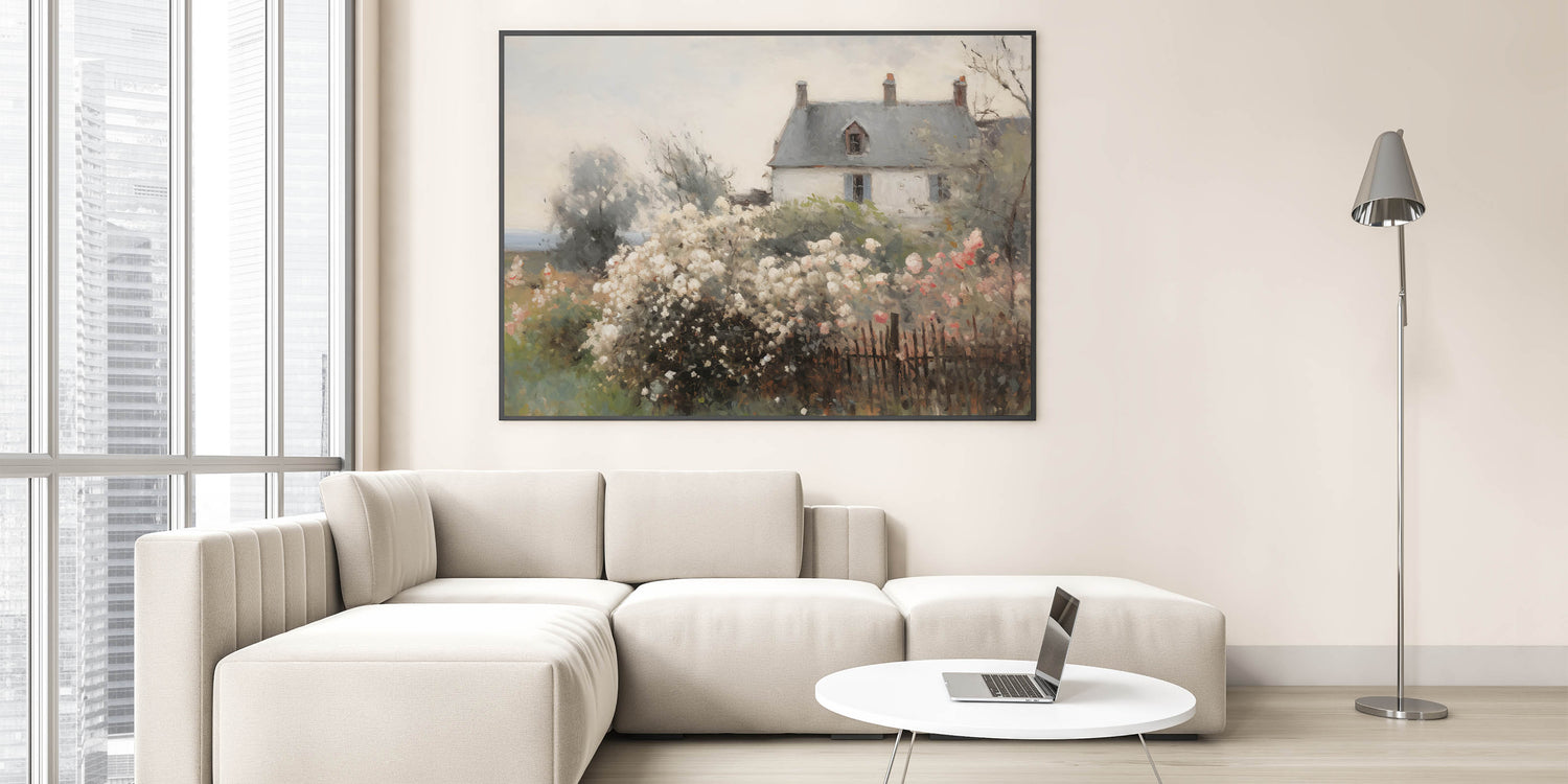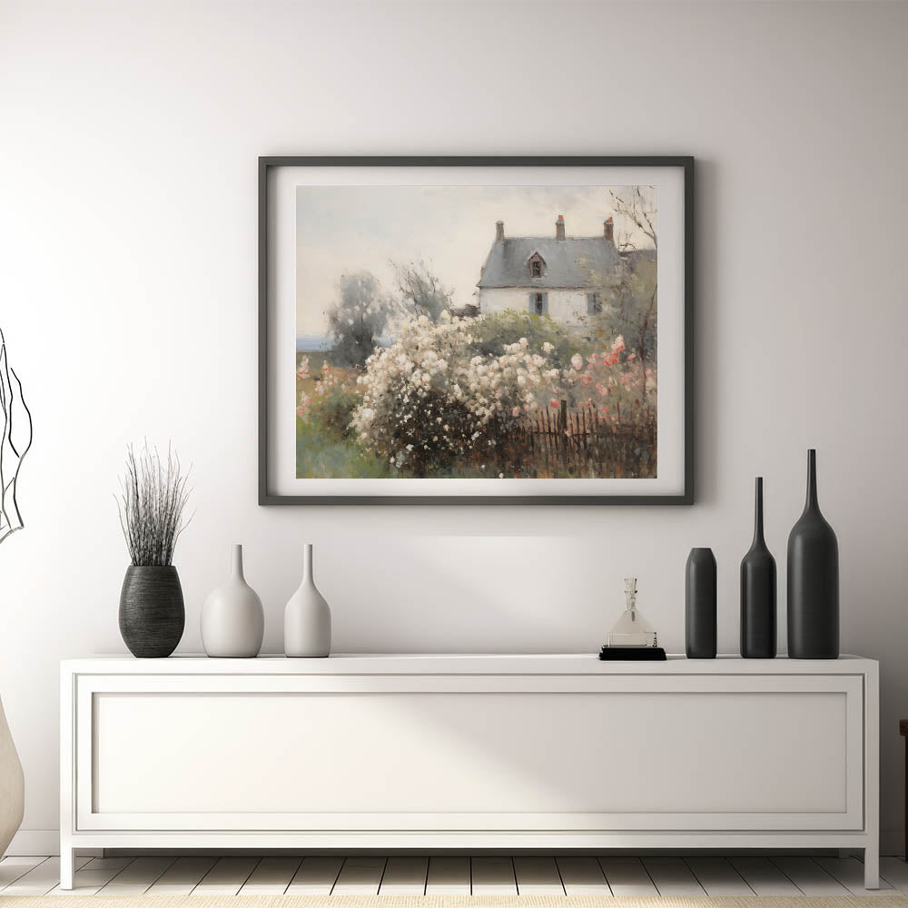 This beautiful vintage landscape art captures the idyllic charm of a cottage surrounded by blooming flowers, set against a soft, dreamy backdrop. The delicate pastel colors of the flowers, paired with the neutral tones of the house, create a peaceful, nostalgic atmosphere. This print is perfect for adding a touch of vintage country charm to your home, evoking feelings of tranquility and timeless elegance.