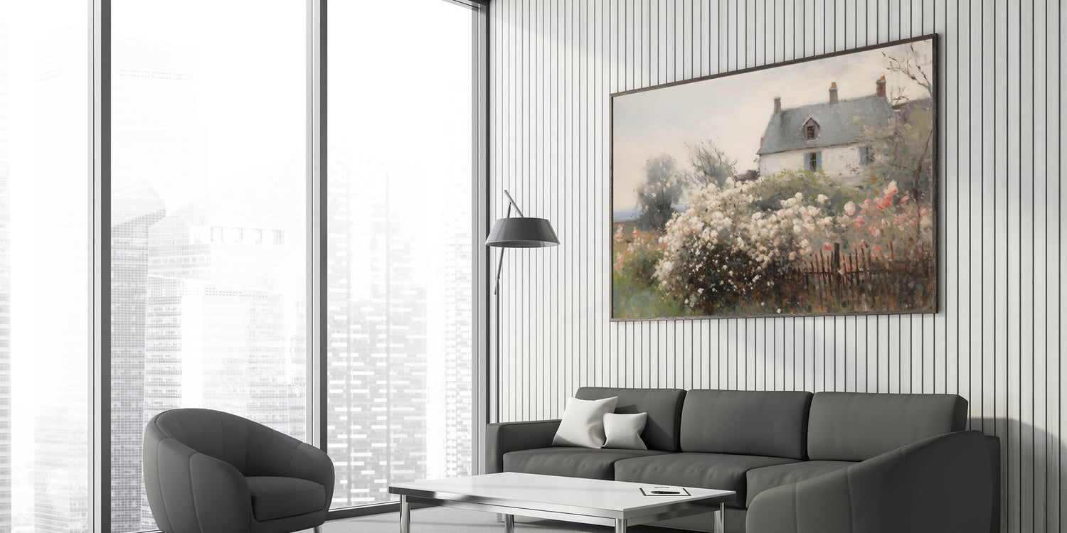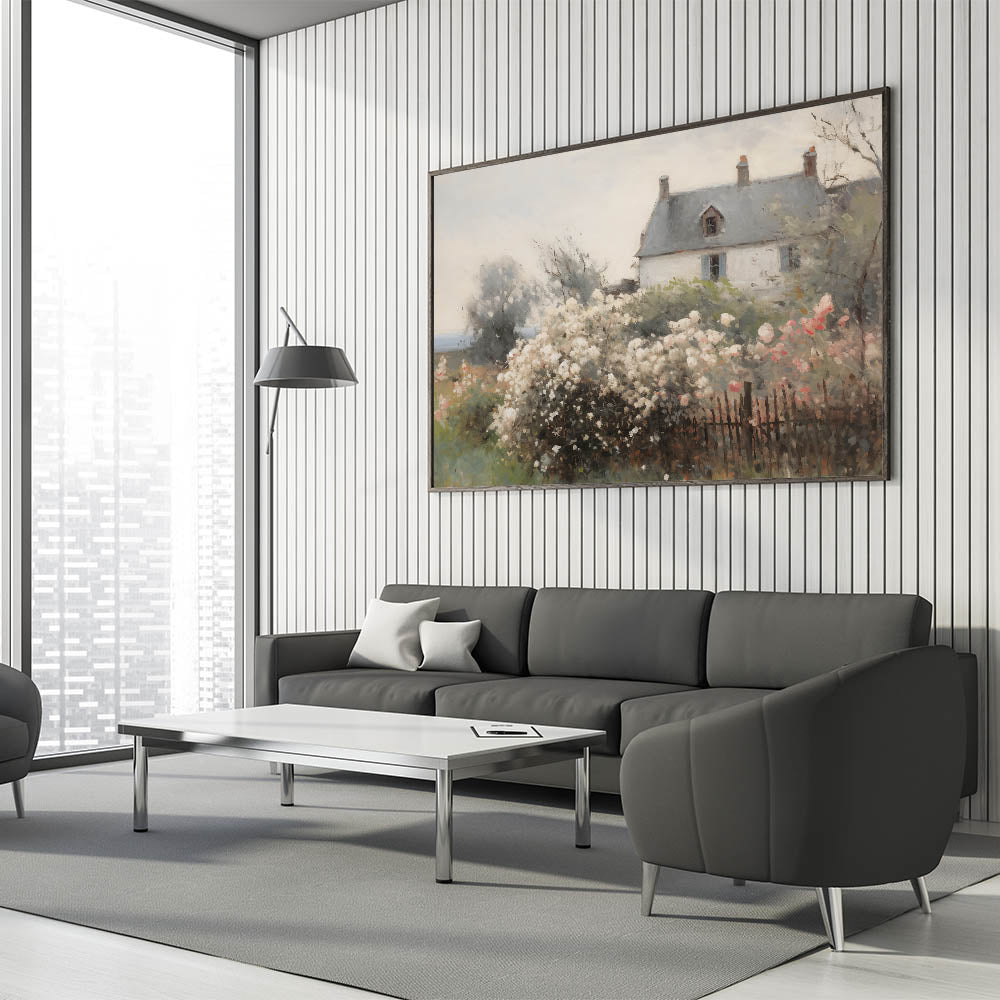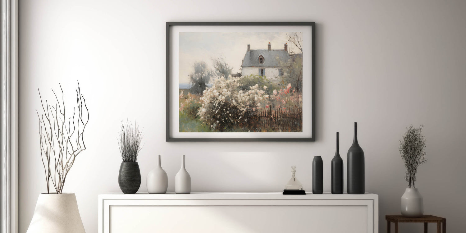 This beautiful vintage landscape art captures the idyllic charm of a cottage surrounded by blooming flowers, set against a soft, dreamy backdrop. The delicate pastel colors of the flowers, paired with the neutral tones of the house, create a peaceful, nostalgic atmosphere. This print is perfect for adding a touch of vintage country charm to your home, evoking feelings of tranquility and timeless elegance.