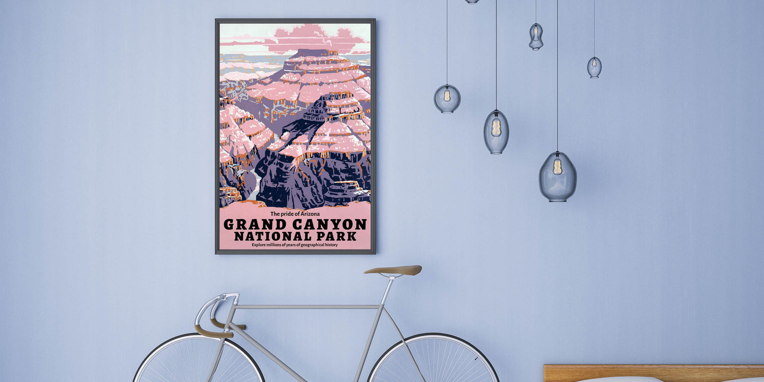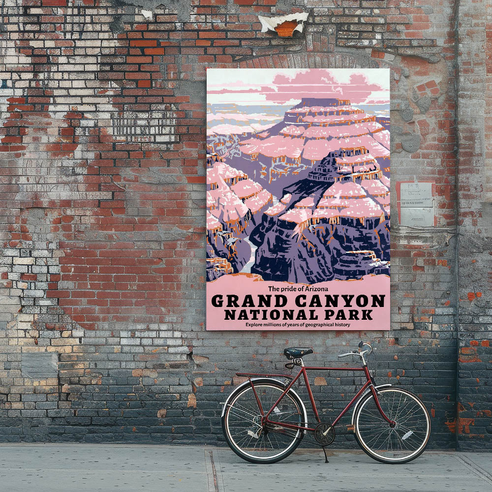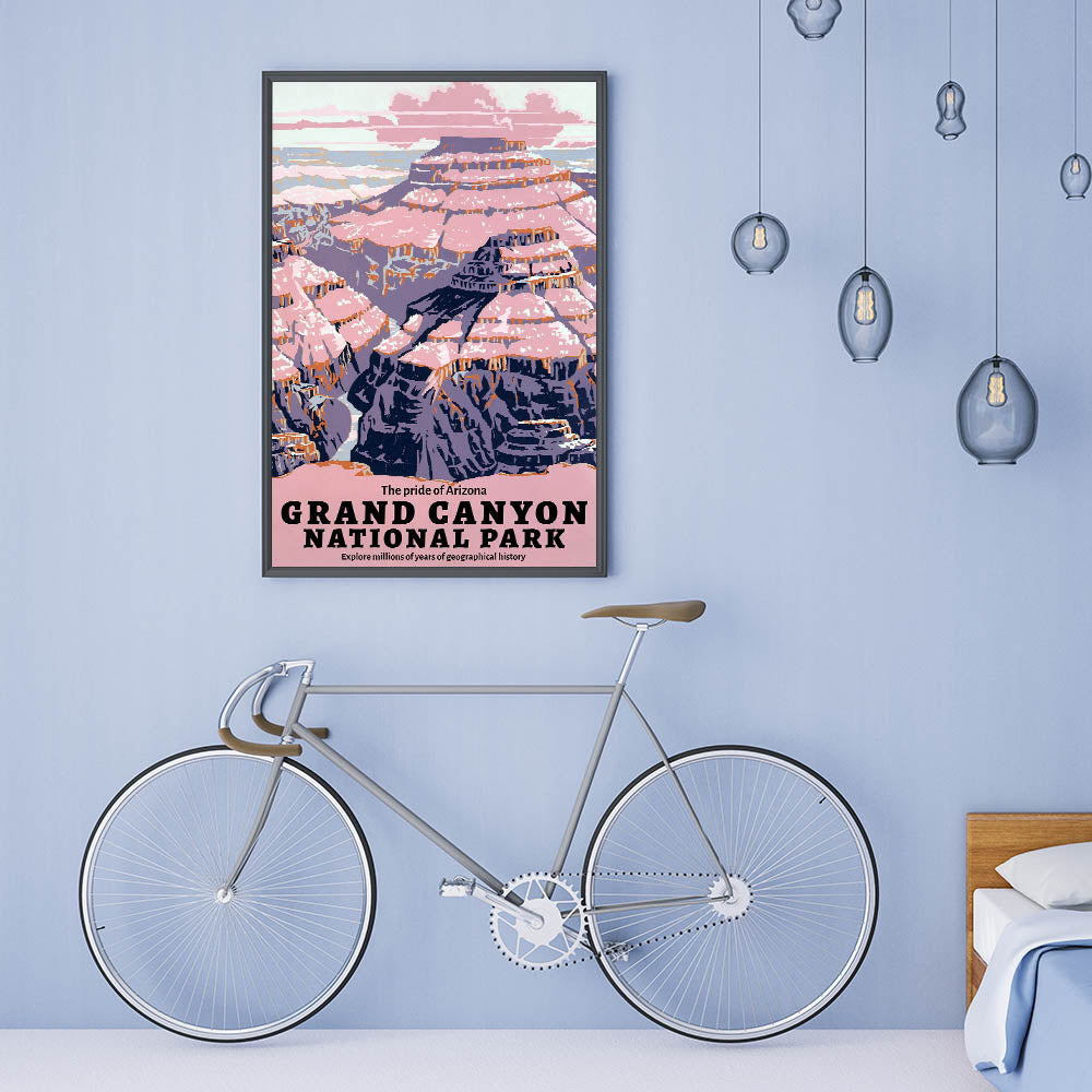 Bring the grandeur of the Grand Canyon into your space with this striking travel print. Its bold colors and intricate design make it a captivating focal point. Order now to bring a piece of America's natural history into your home!