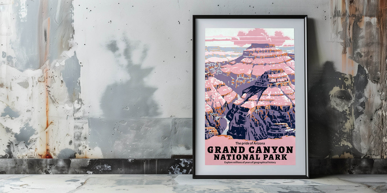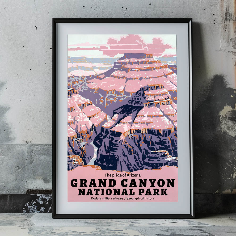 Discover the timeless beauty of the Grand Canyon with this Vintage Travel Poster. Showcasing the awe-inspiring landscape with soft pinks, deep purples, and vibrant oranges, this artwork captures the essence of retro tourism art. The intricate details of the canyon's vastness, combined with its vibrant colors, evoke a sense of adventure and awe. Ideal for nature lovers and those fascinated by the majestic beauty of the American Southwest, this print brings the Grand Canyon to life with stunning clarity and nostalgia.