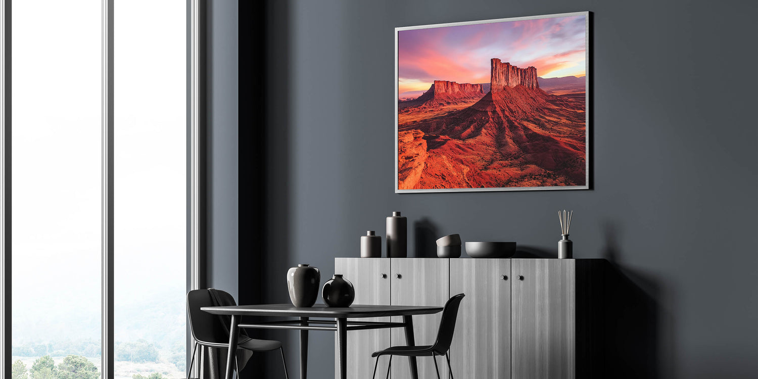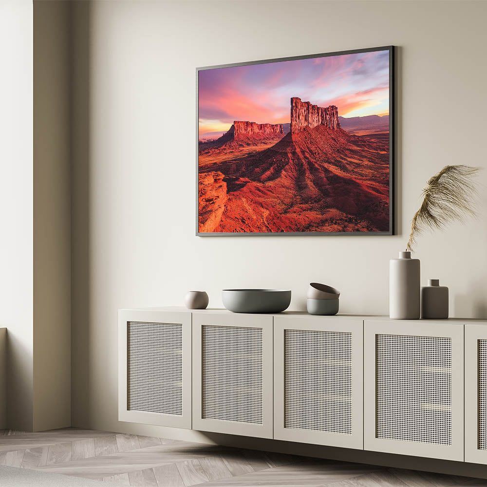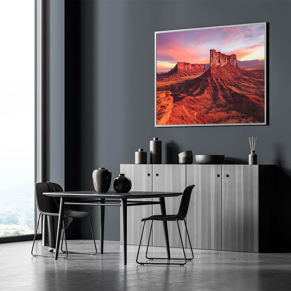 Immerse yourself in the breathtaking beauty of Vivid Monument Valley Wall Art. This artwork captures the iconic sandstone formations of Monument Valley glowing under the hues of a radiant sunrise, blending vibrant reds and soft pink skies. A stunning example of desert scenery prints, it brings warmth and natural elegance to any interior.