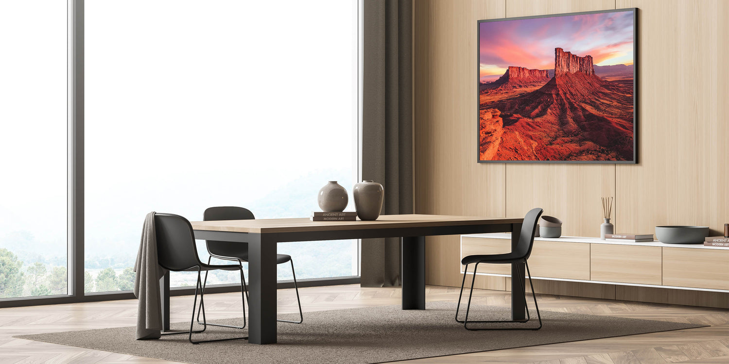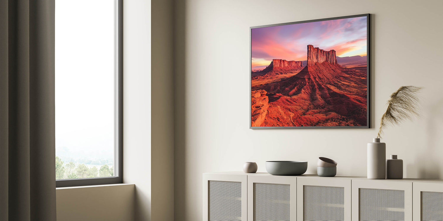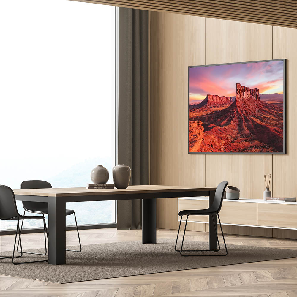 Immerse yourself in the breathtaking beauty of Vivid Monument Valley Wall Art. This artwork captures the iconic sandstone formations of Monument Valley glowing under the hues of a radiant sunrise, blending vibrant reds and soft pink skies. A stunning example of desert scenery prints, it brings warmth and natural elegance to any interior.