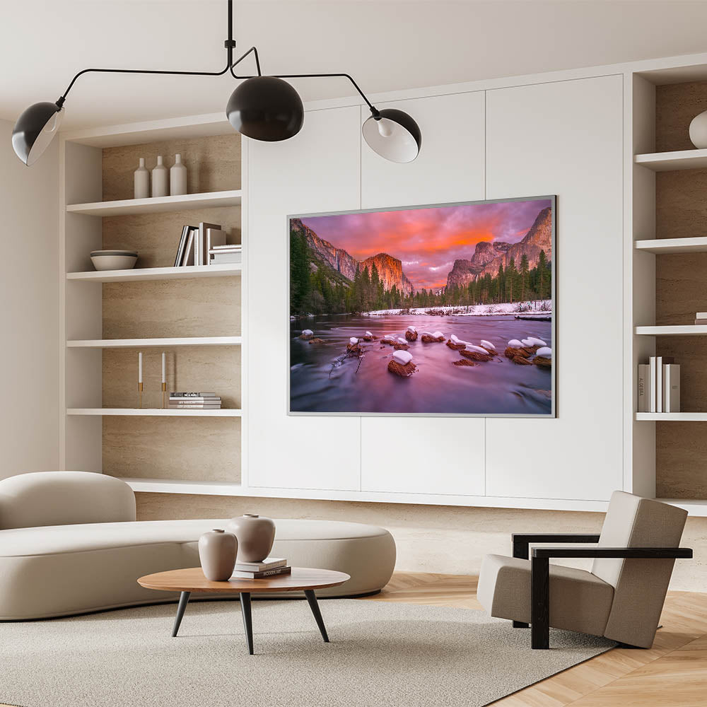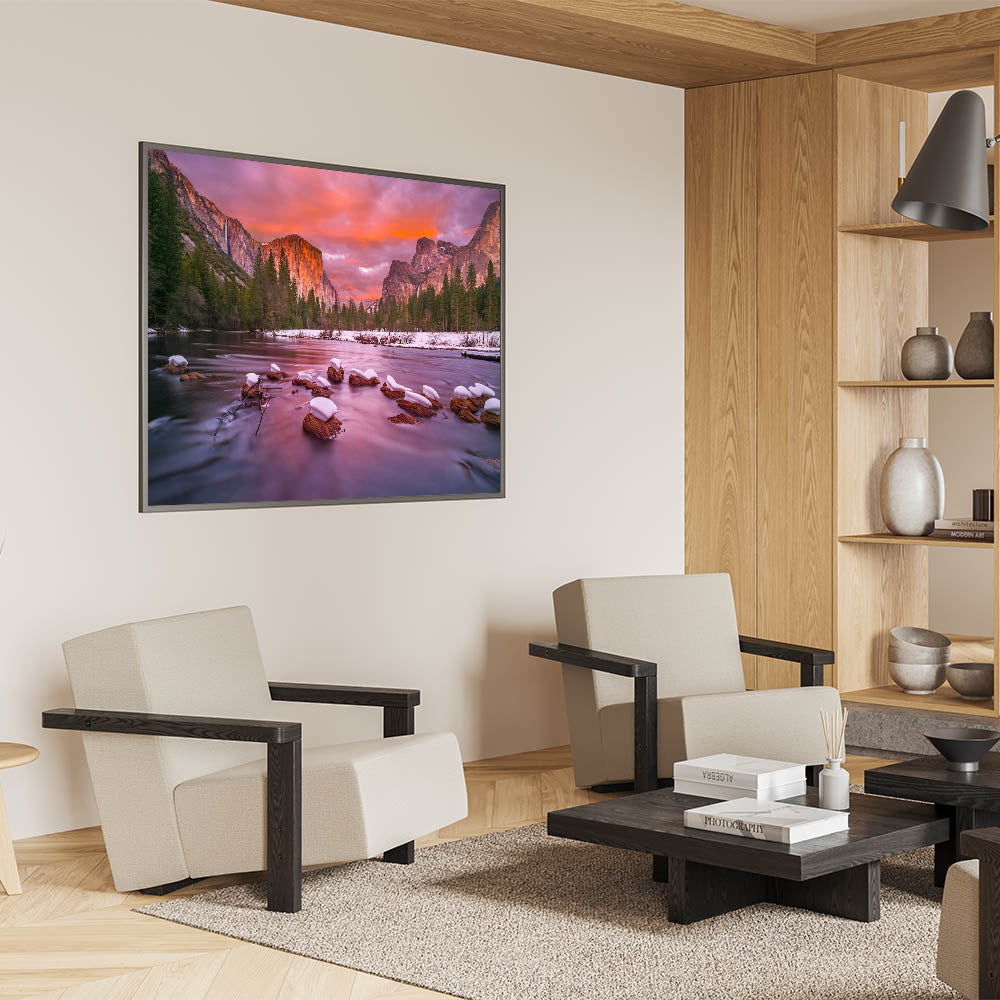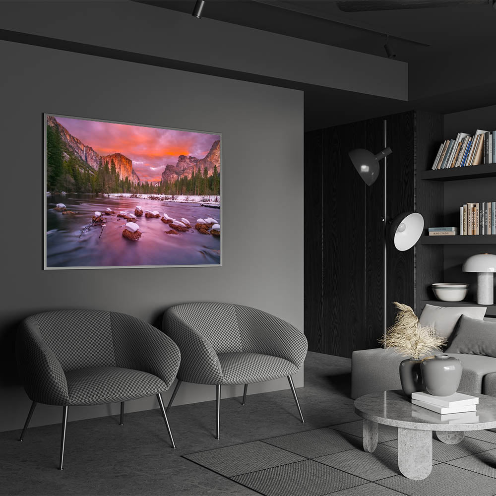 This stunning Yosemite Valley wall decor captures a breathtaking winter sunset with El Capitan and Bridalveil Falls in the distance. The serene river in the foreground, with snow-covered rocks, reflects the soft pink and orange hues of the sunset, creating a calm and peaceful atmosphere. This high-quality wall art perfectly showcases the beauty of Yosemite’s most iconic landmarks during a tranquil winter evening. Ideal for nature lovers, this piece brings the magic of Yosemite National Park indoors.