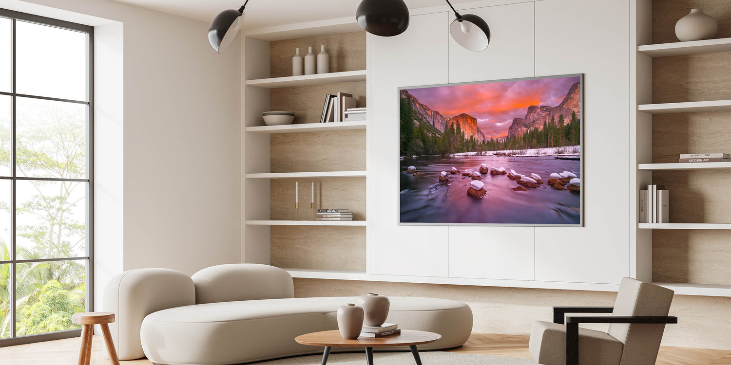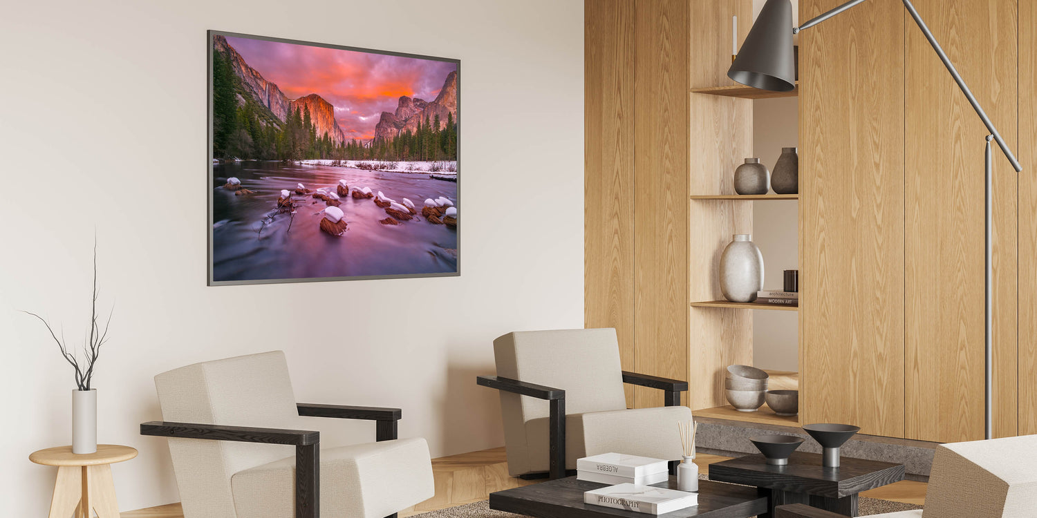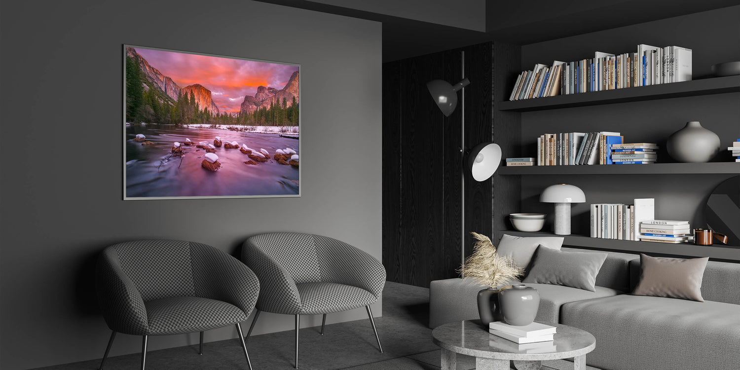 This stunning Yosemite Valley wall decor captures a breathtaking winter sunset with El Capitan and Bridalveil Falls in the distance. The serene river in the foreground, with snow-covered rocks, reflects the soft pink and orange hues of the sunset, creating a calm and peaceful atmosphere. This high-quality wall art perfectly showcases the beauty of Yosemite’s most iconic landmarks during a tranquil winter evening. Ideal for nature lovers, this piece brings the magic of Yosemite National Park indoors.