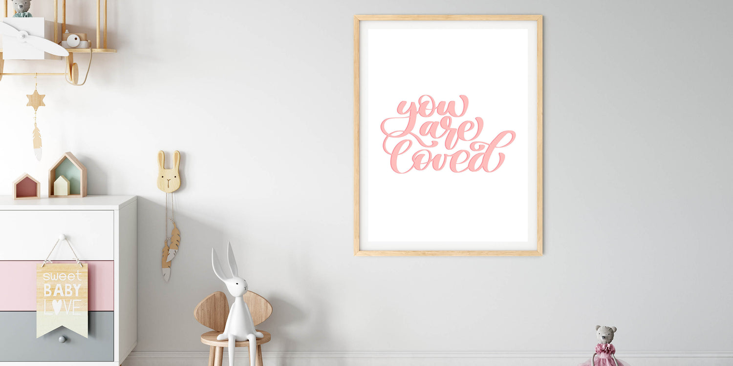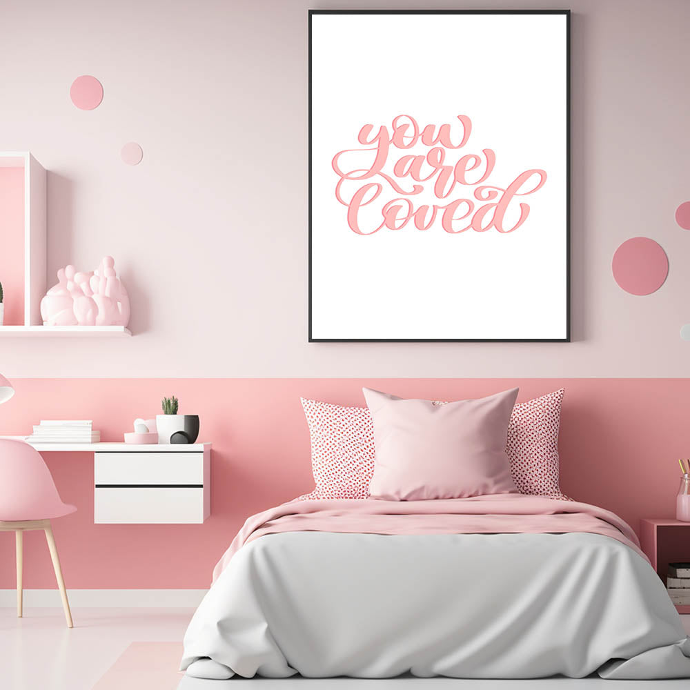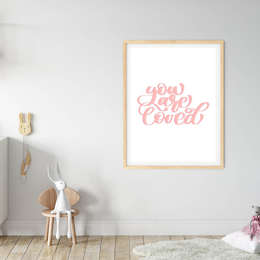 Fill your child's space with warmth and positivity with this "You Are Loved" wall art, perfect for girls' bedrooms, nurseries, and playrooms. Featuring elegant hand-lettering in soft pastel pink against a clean white background, this design adds a soothing and uplifting touch to any decor. Its minimalistic yet stylish look blends effortlessly with modern and classic interiors, making it an ideal choice for any child's space.