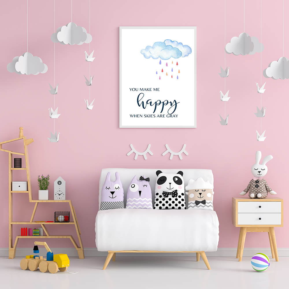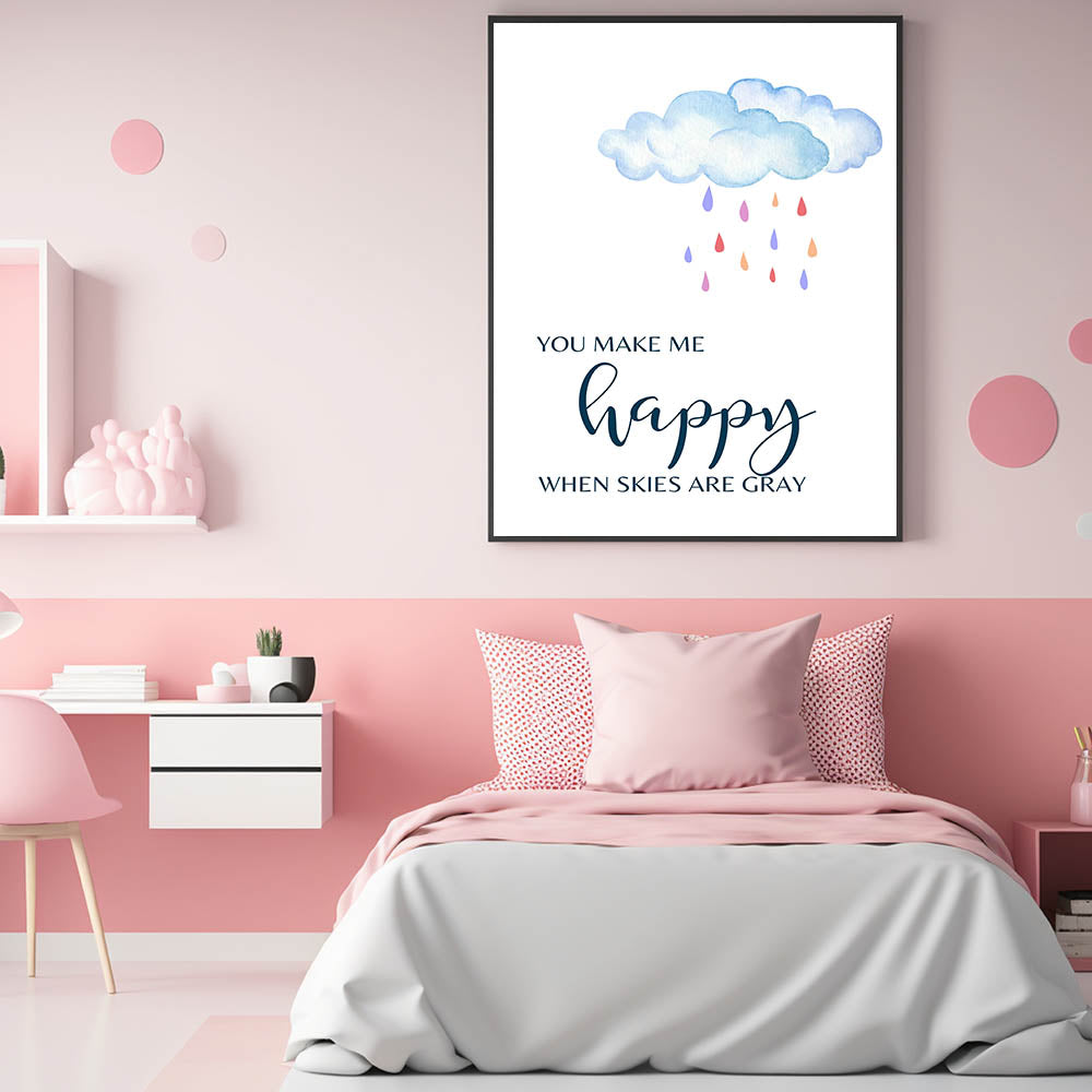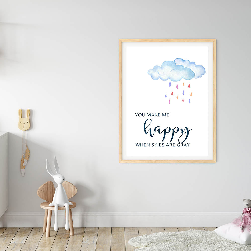 Add a touch of warmth and positivity to your child’s space with this "You Make Me Happy" watercolor print, designed to inspire joy and comfort in any nursery, playroom, or kids' bedroom. Featuring a soft blue cloud with colorful raindrops in shades of pink, lilac, and orange, this children's wall décor piece brings a dreamy and uplifting atmosphere.