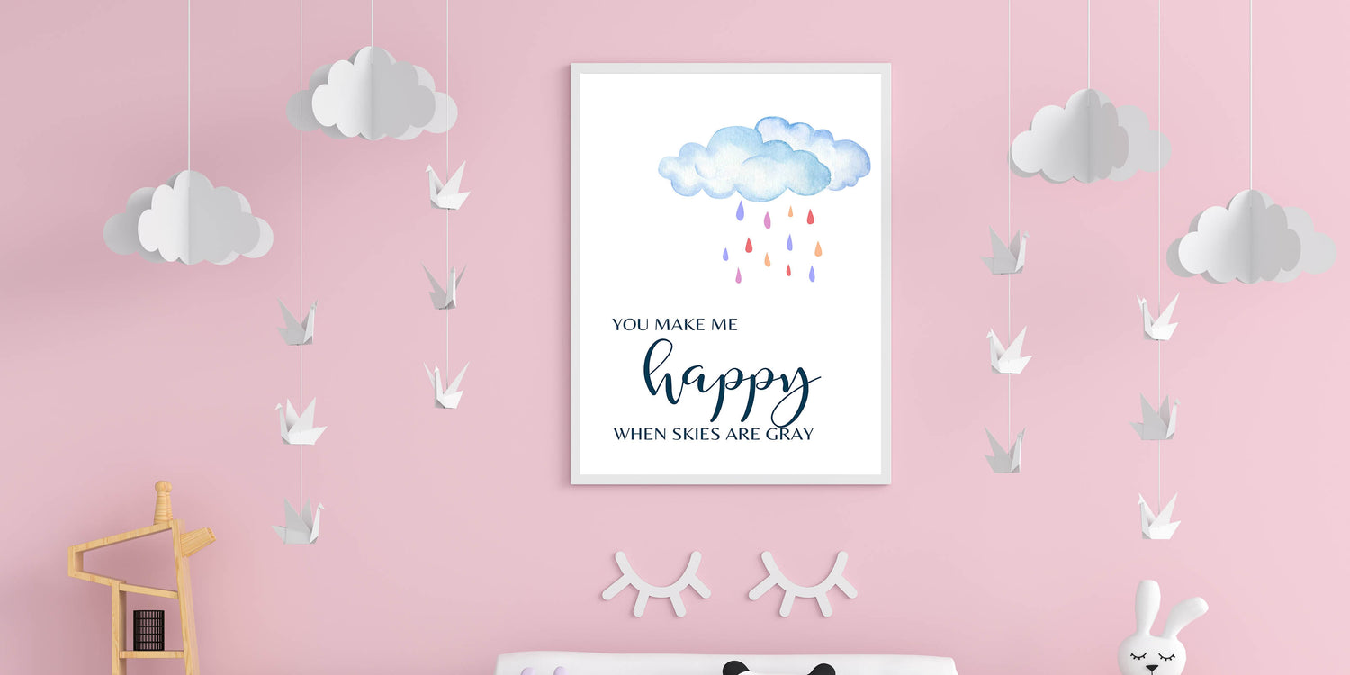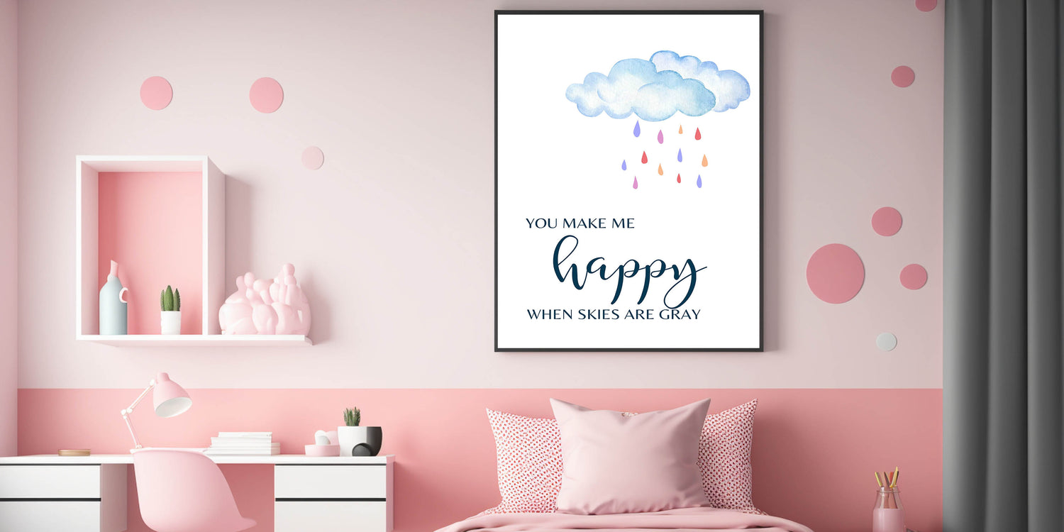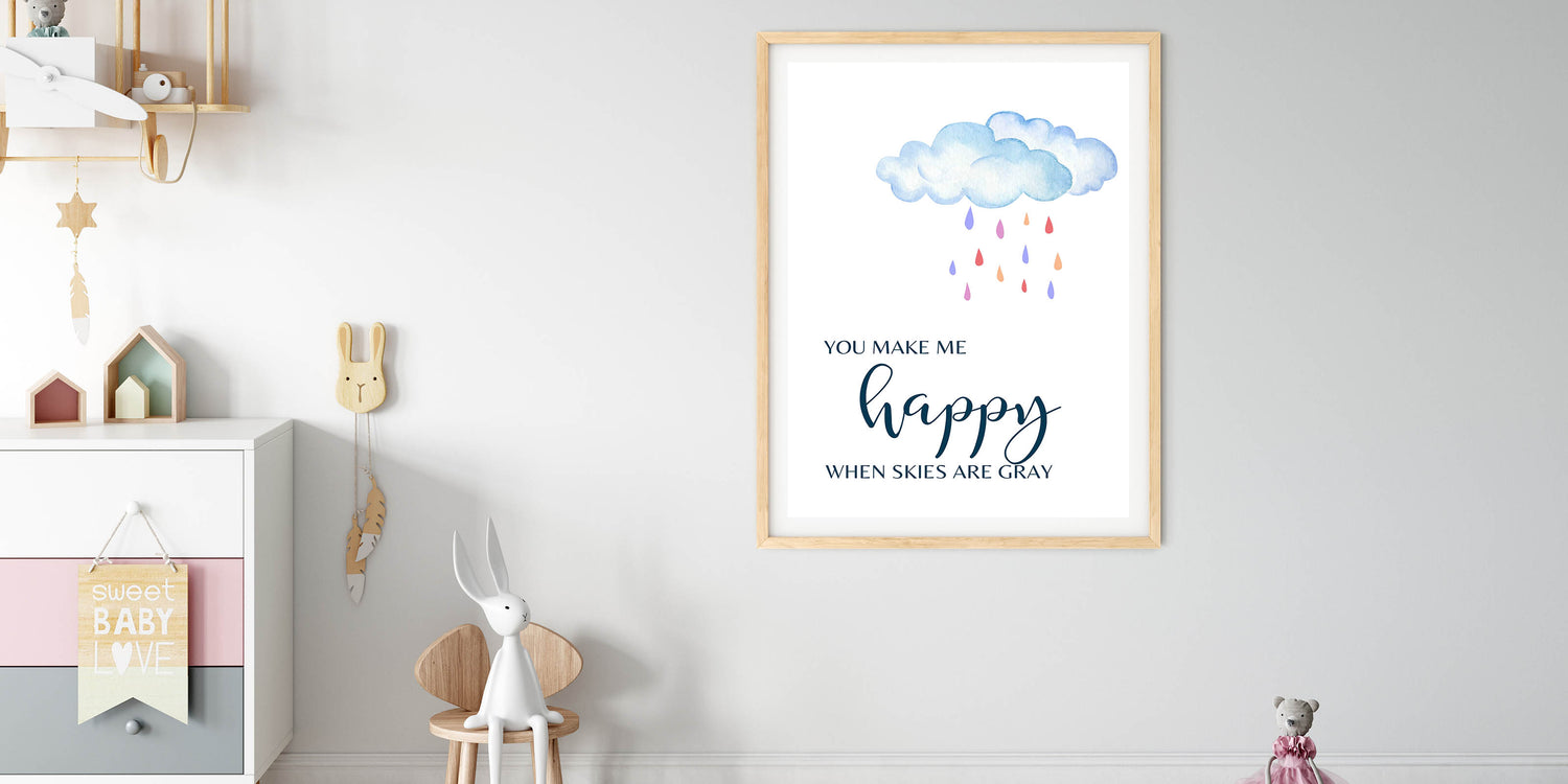 Add a touch of warmth and positivity to your child’s space with this "You Make Me Happy" watercolor print, designed to inspire joy and comfort in any nursery, playroom, or kids' bedroom. Featuring a soft blue cloud with colorful raindrops in shades of pink, lilac, and orange, this children's wall décor piece brings a dreamy and uplifting atmosphere.