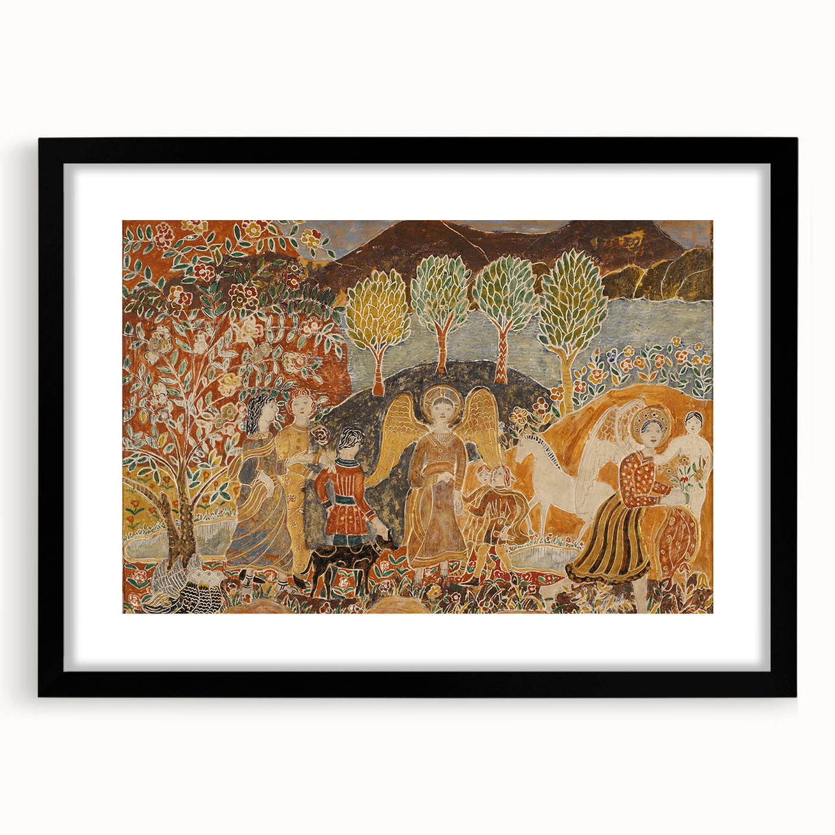Add a delightful and expressive art piece to your home with this angelic garden scene. Its lively color palette and detailed composition make it a captivating focal point, bringing a touch of storybook charm to your space.