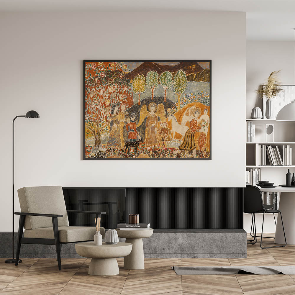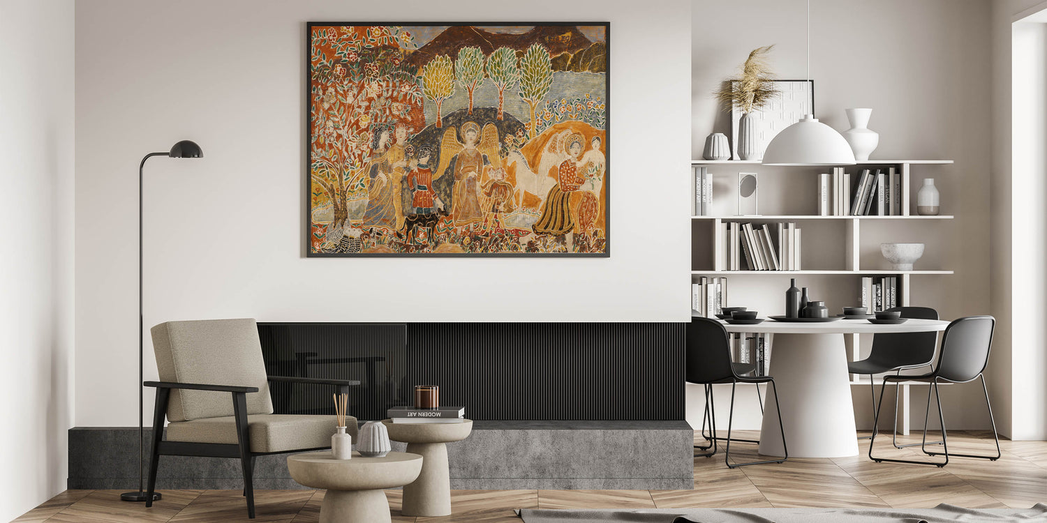 Bring a touch of enchantment to your decor with "Angelic Garden Scene," a vibrant artwork that blends rich colors, intricate floral designs, and ethereal figures. This modern wall art piece captures a whimsical scene featuring angels, surrounded by blooming flowers and lush greenery. Perfect for those who appreciate unique modern art, this piece adds a sense of warmth and charm to any room, making it an eye-catching choice for trendy home decor.