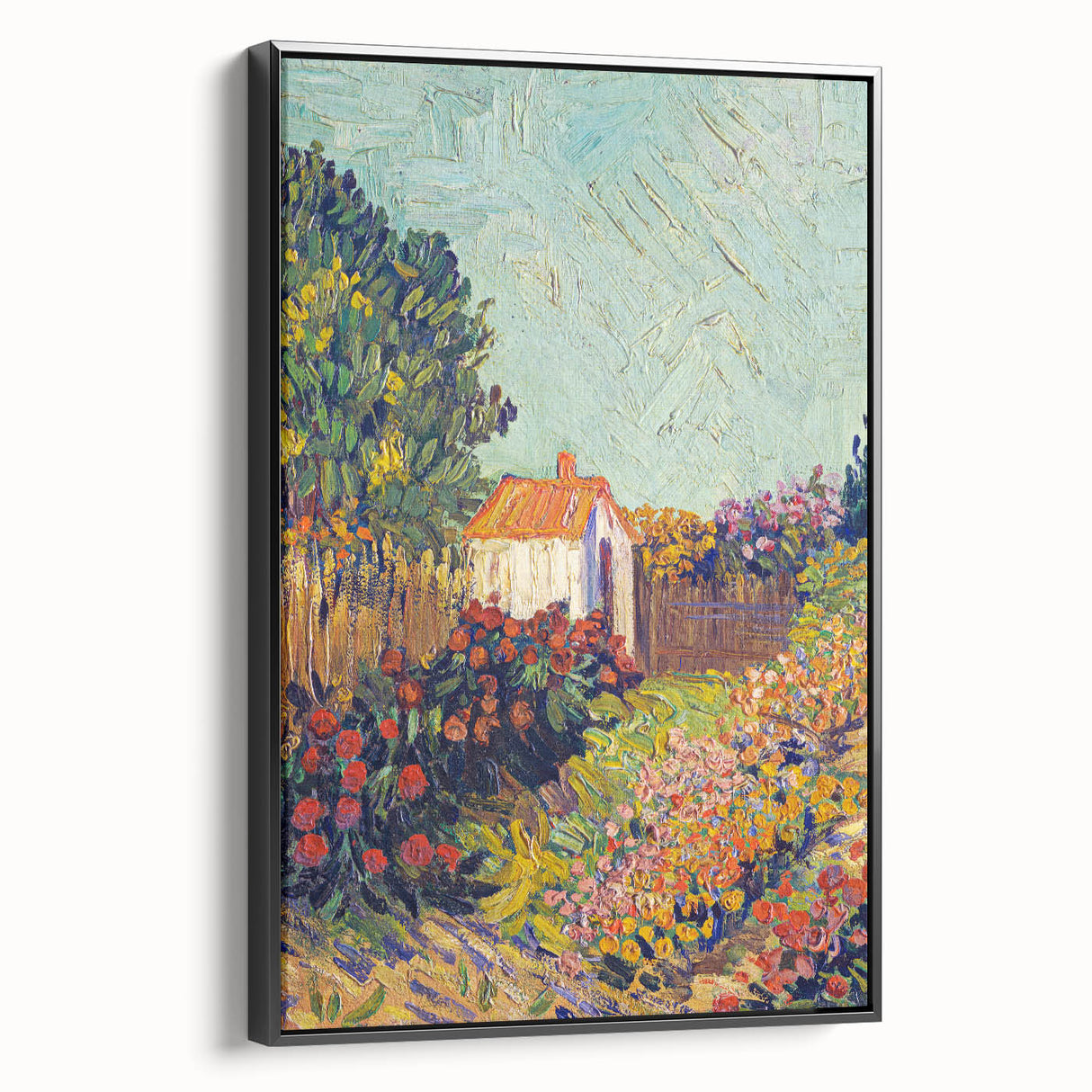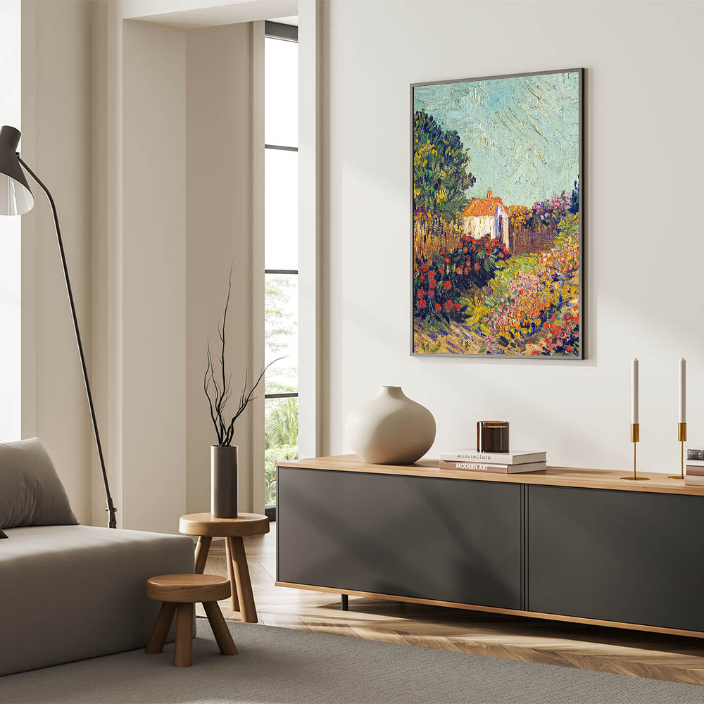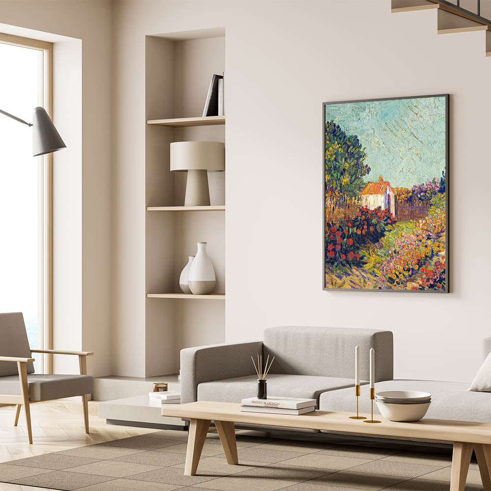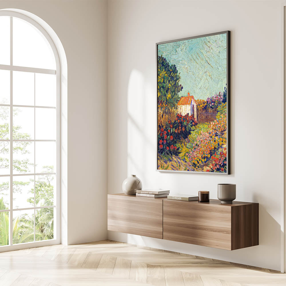 Bring the vibrant beauty of Van Gogh's Impressionist landscapes into your home with this colorful garden scene. This artwork, filled with lush greenery, blooming flowers, and a quaint cottage, captures the essence of nature's serenity through Van Gogh's bold brushstrokes and dynamic use of color. The bright tones of red, yellow, and green evoke a lively, joyful atmosphere that will invigorate any room.