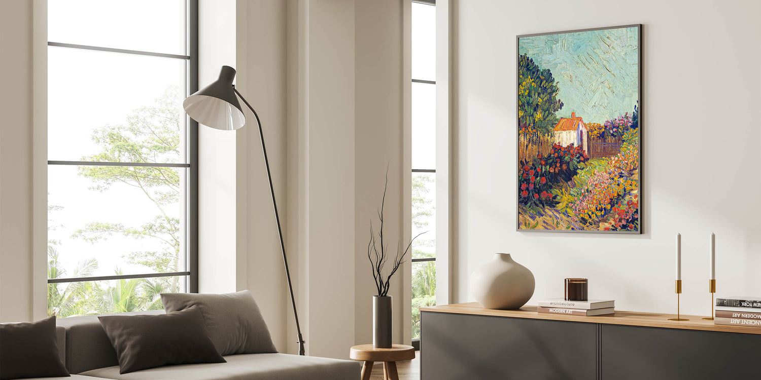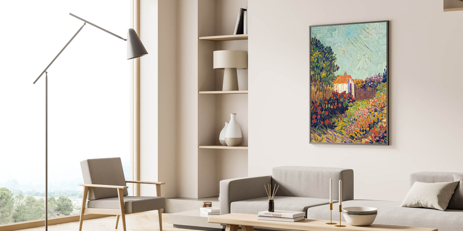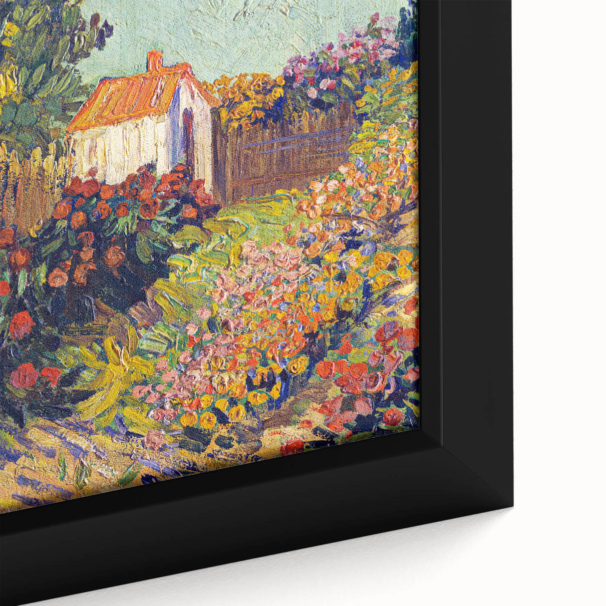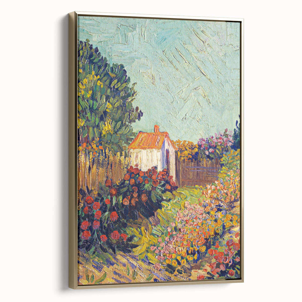 Bring the vibrant beauty of Van Gogh's Impressionist landscapes into your home with this colorful garden scene. This artwork, filled with lush greenery, blooming flowers, and a quaint cottage, captures the essence of nature's serenity through Van Gogh's bold brushstrokes and dynamic use of color. The bright tones of red, yellow, and green evoke a lively, joyful atmosphere that will invigorate any room.