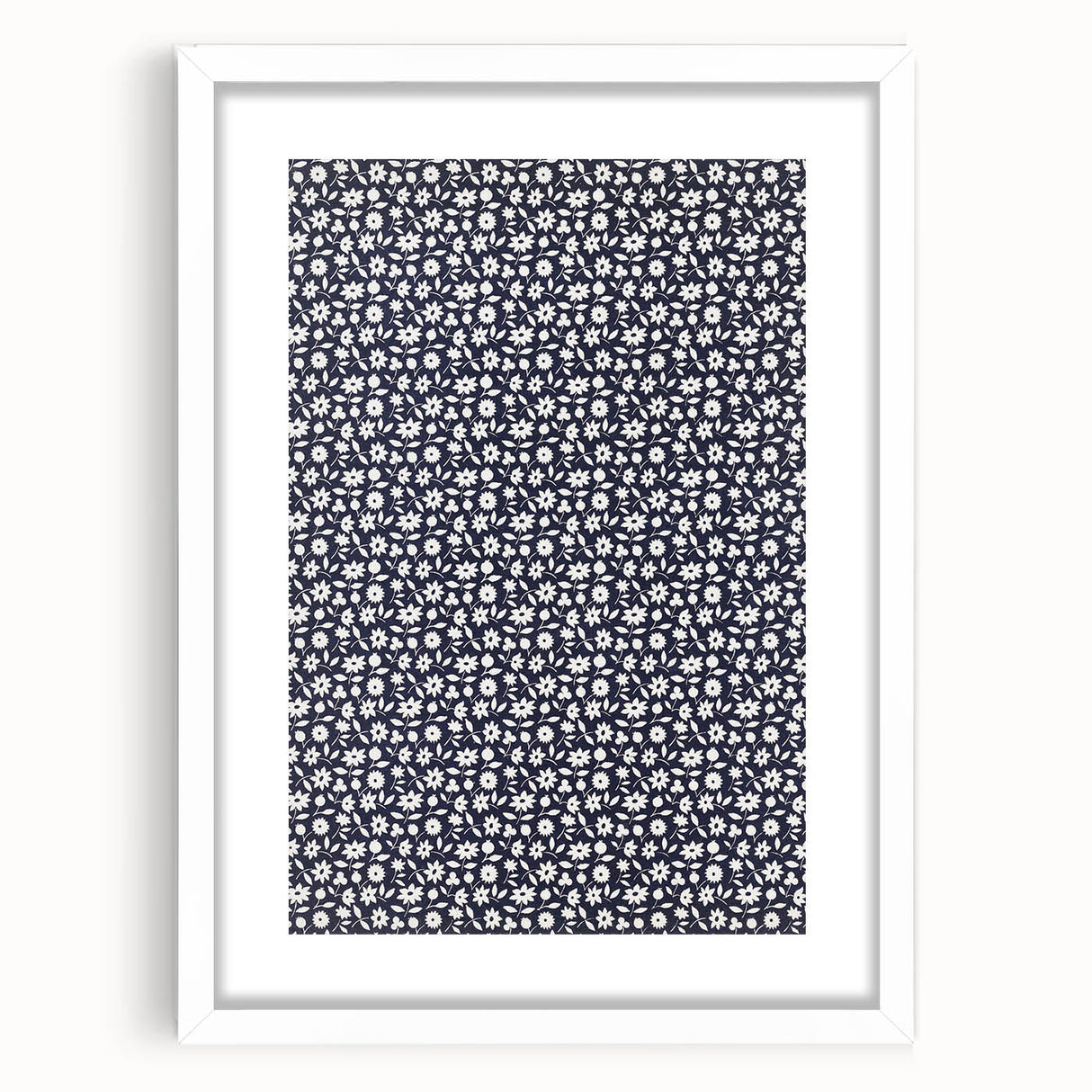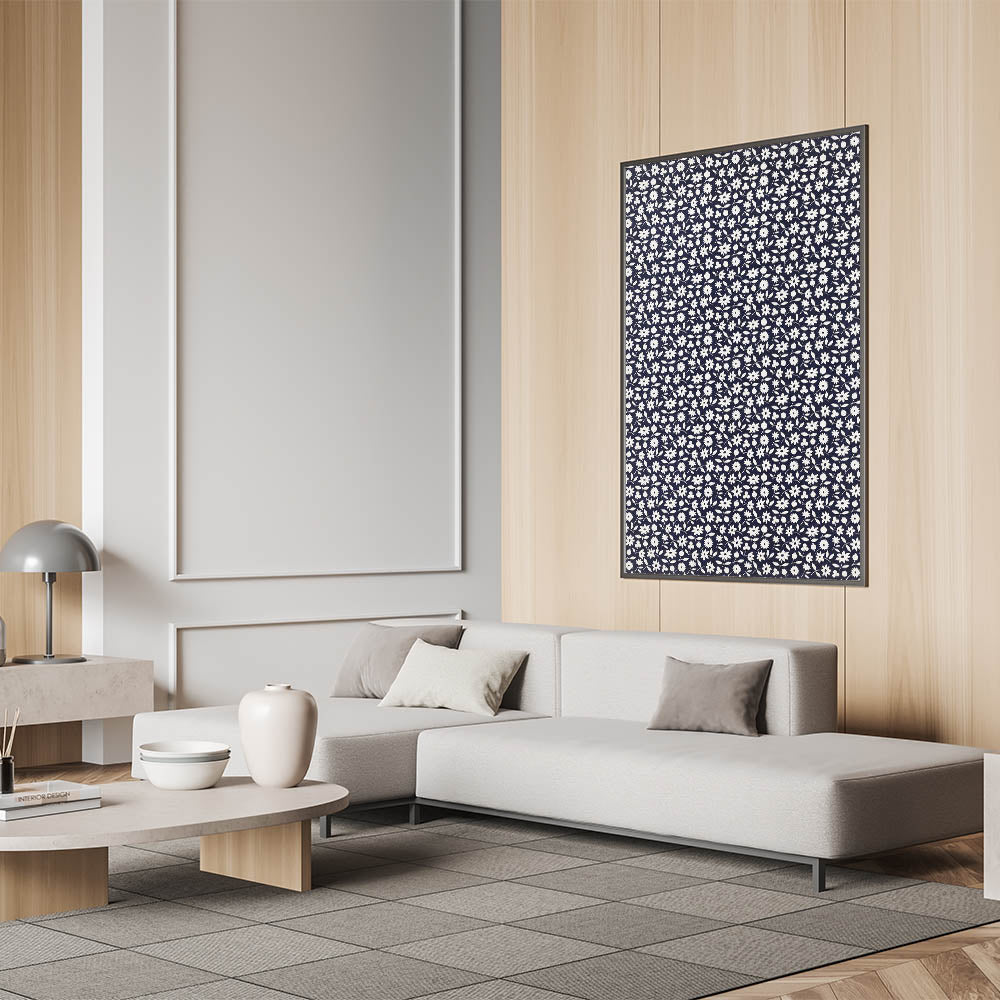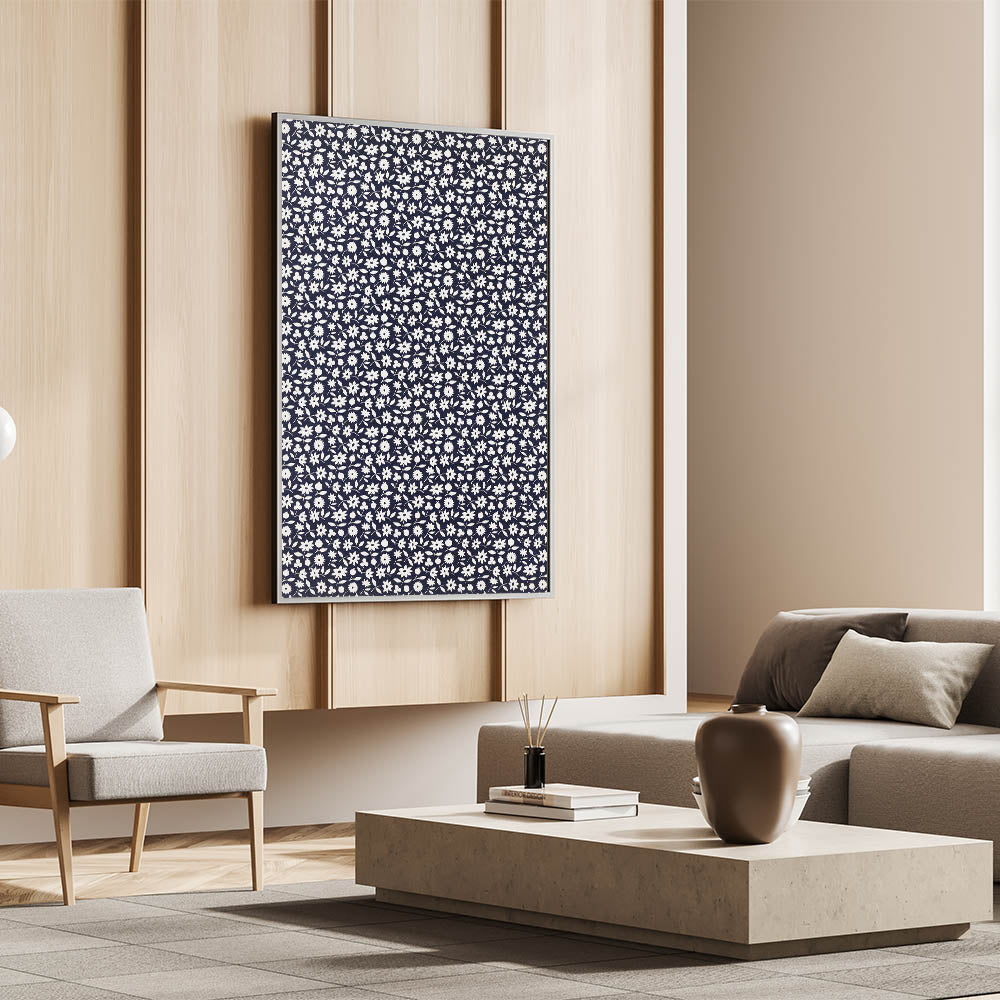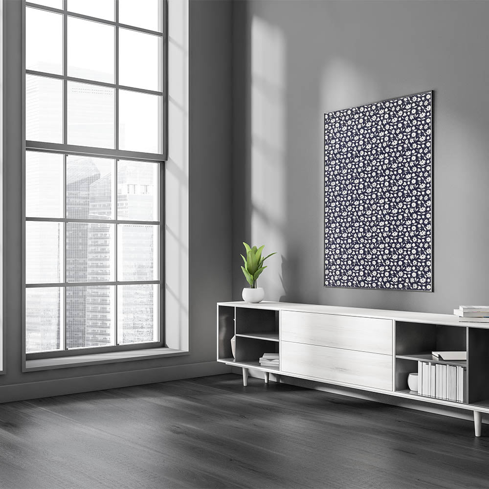 Bring a touch of sophistication to your space with this Art Deco-inspired floral pattern in a timeless palette of white and deep navy. The intricate white flowers are delicately arranged on a rich navy background, creating a harmonious balance of contrast and elegance. This pattern evokes the classic style of Art Deco, making it a perfect addition for those who appreciate vintage-inspired decor with a modern twist. Ideal for use as wall art, this piece can enhance bedrooms, living rooms, or even office spaces with its subtle yet captivating floral charm.