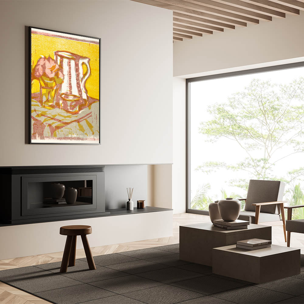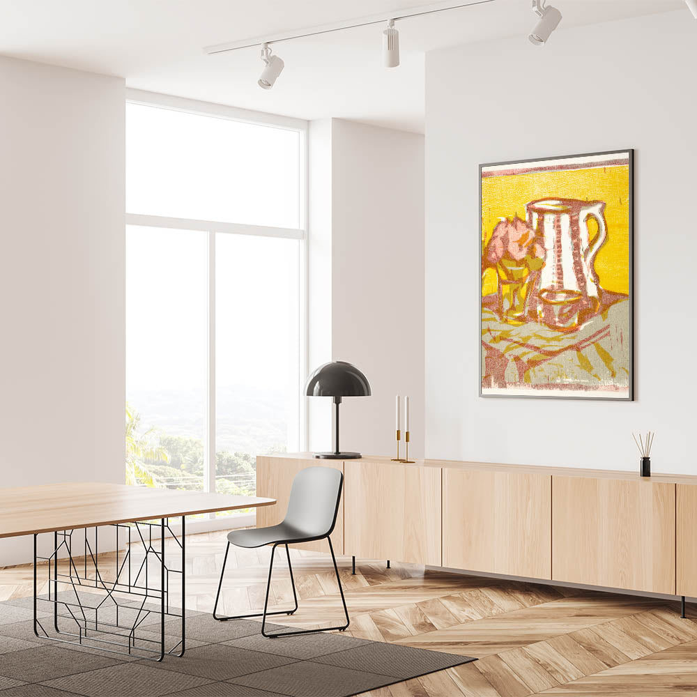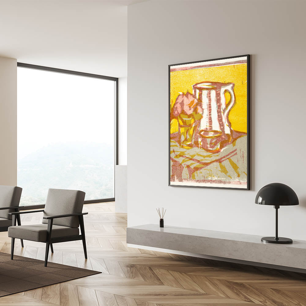 Transform your space with the timeless charm of Expressionist Art in Still Life with Pitcher and Flowers by Ernst Ludwig Kirchner. This artwork features a delightful composition of a simple pitcher and a vase of flowers, rendered in bold hues of yellow, pink, and beige. The painting’s textured brushstrokes and minimalist forms reflect Modern Expressionism, creating a vibrant yet tranquil atmosphere.