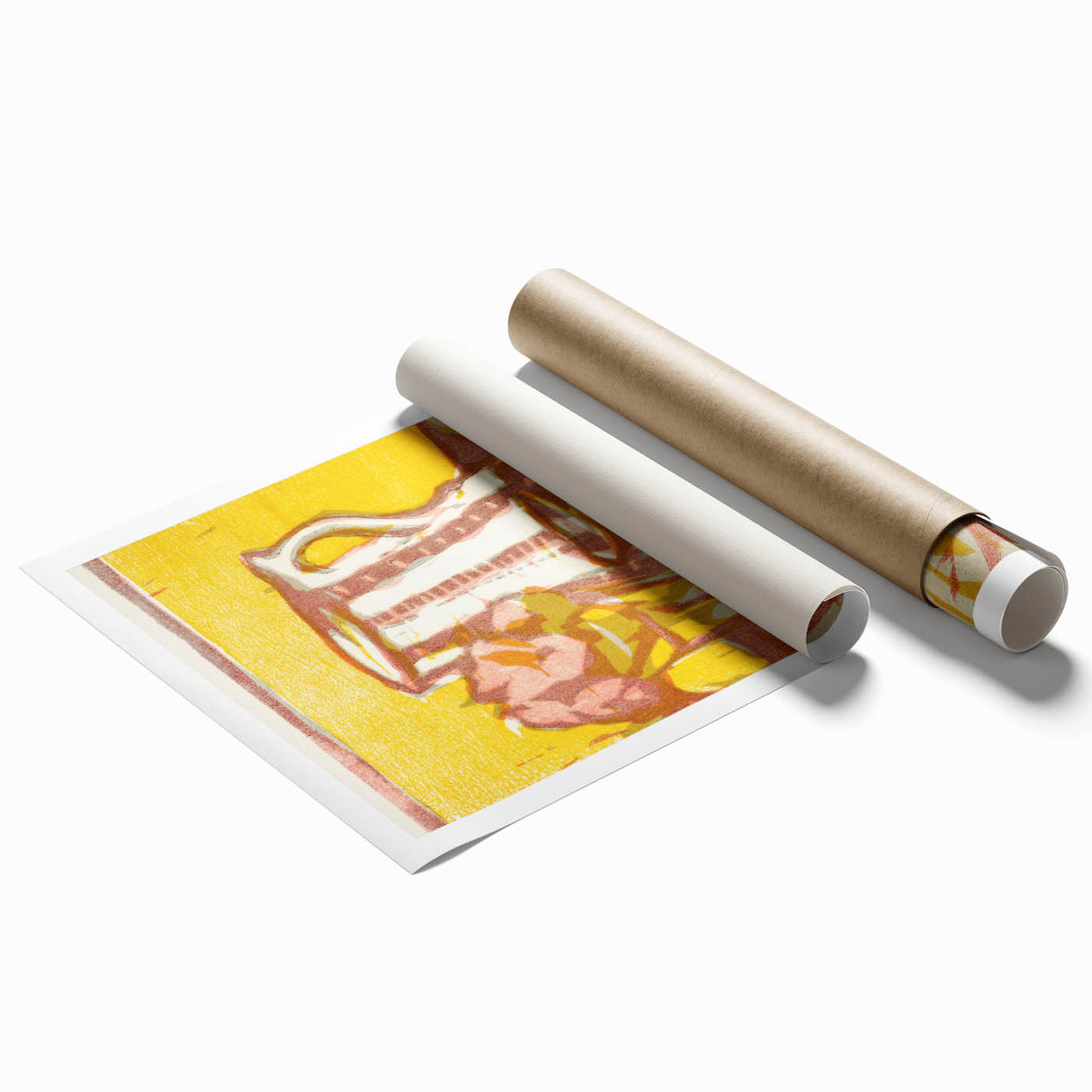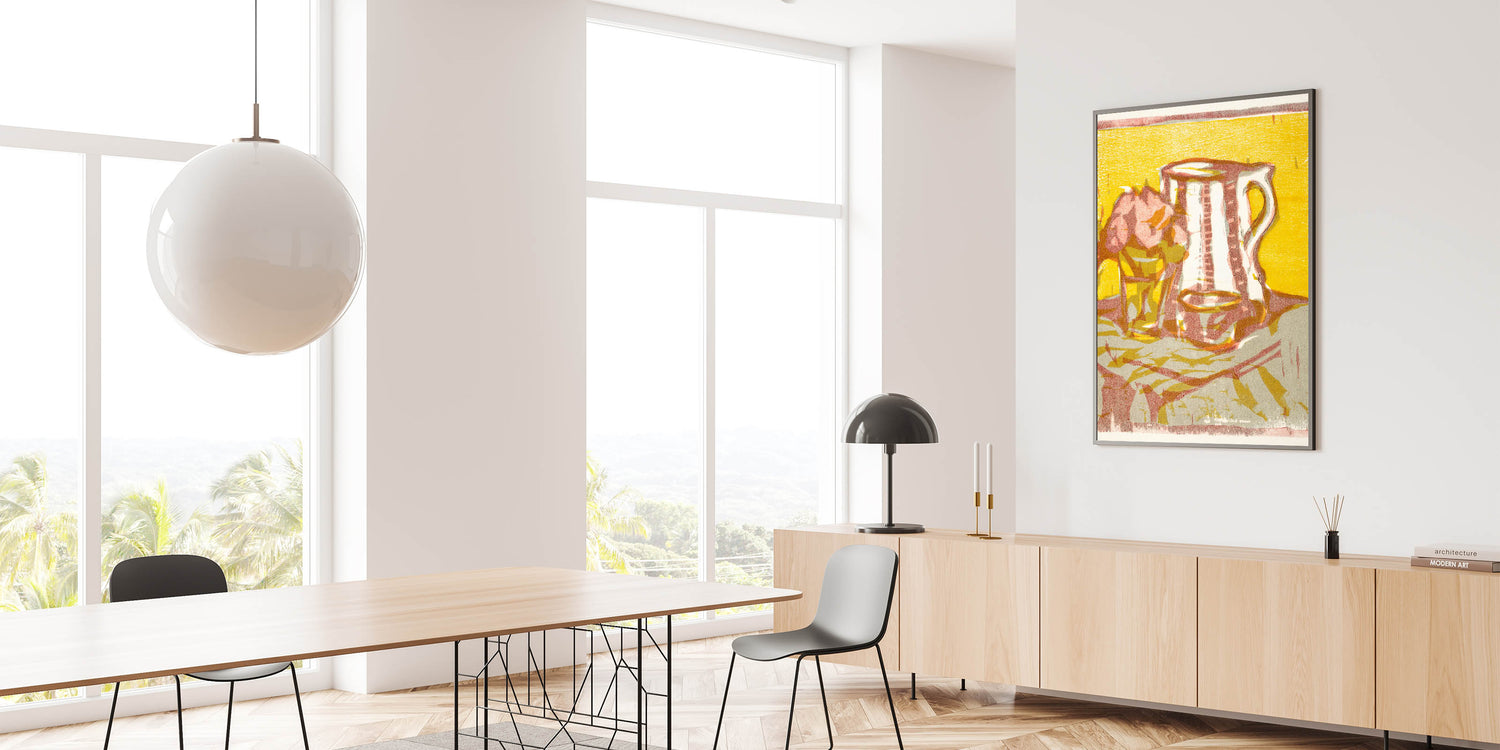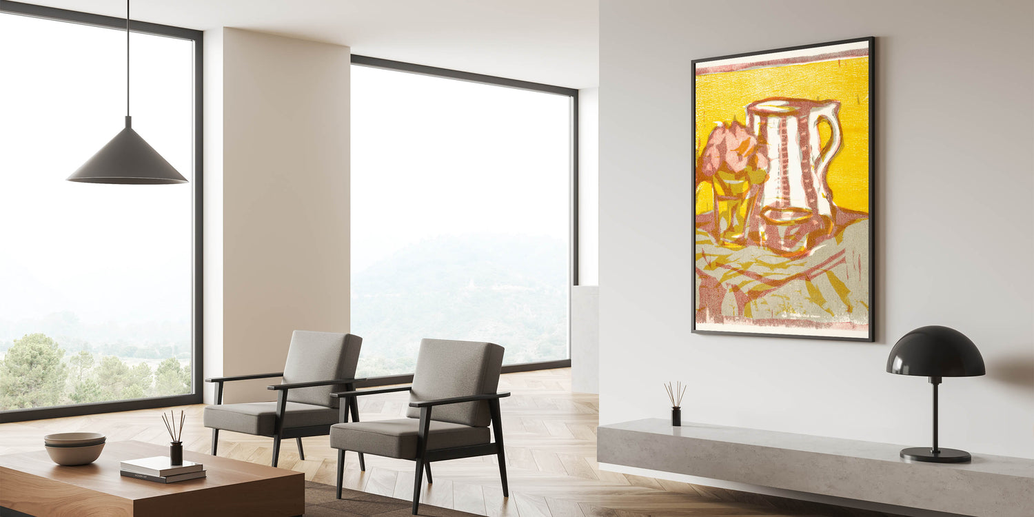 Transform your space with the timeless charm of Expressionist Art in Still Life with Pitcher and Flowers by Ernst Ludwig Kirchner. This artwork features a delightful composition of a simple pitcher and a vase of flowers, rendered in bold hues of yellow, pink, and beige. The painting’s textured brushstrokes and minimalist forms reflect Modern Expressionism, creating a vibrant yet tranquil atmosphere.