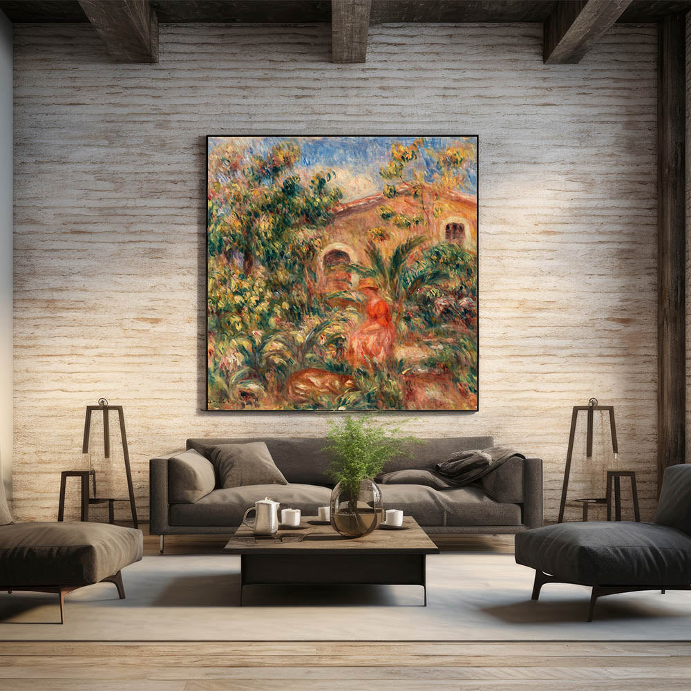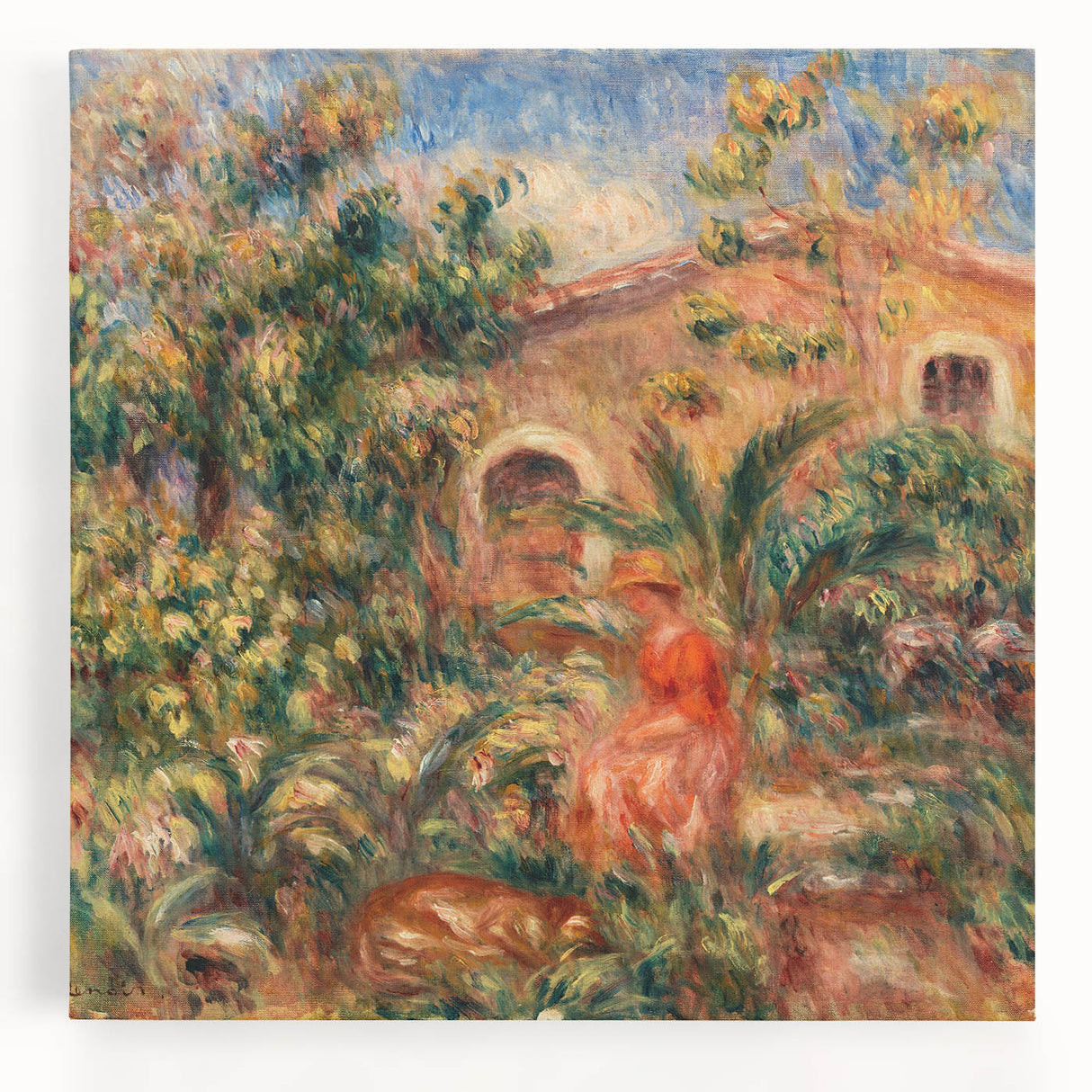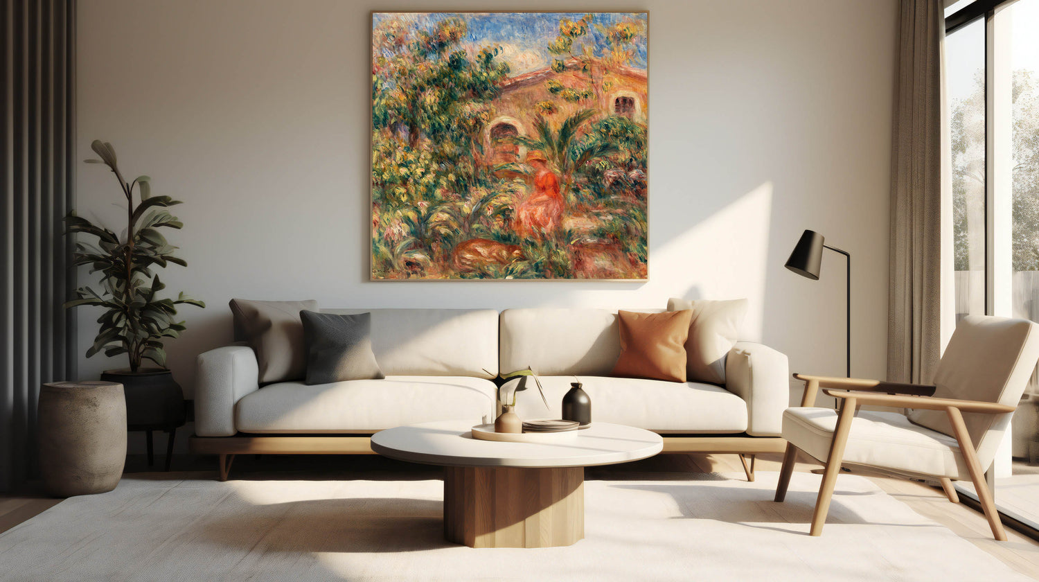Bring the warmth of the French countryside into your home with Pierre-Auguste Renoir’s "Farmhouse". This Impressionist masterpiece captures a serene garden scene bathed in soft, earthy tones. Renoir’s lush brushstrokes bring to life the vibrant greenery and delicate flowers surrounding the farmhouse, evoking the tranquility of rural life. In the foreground, a figure dressed in red adds a captivating touch, blending seamlessly into the surrounding landscape.