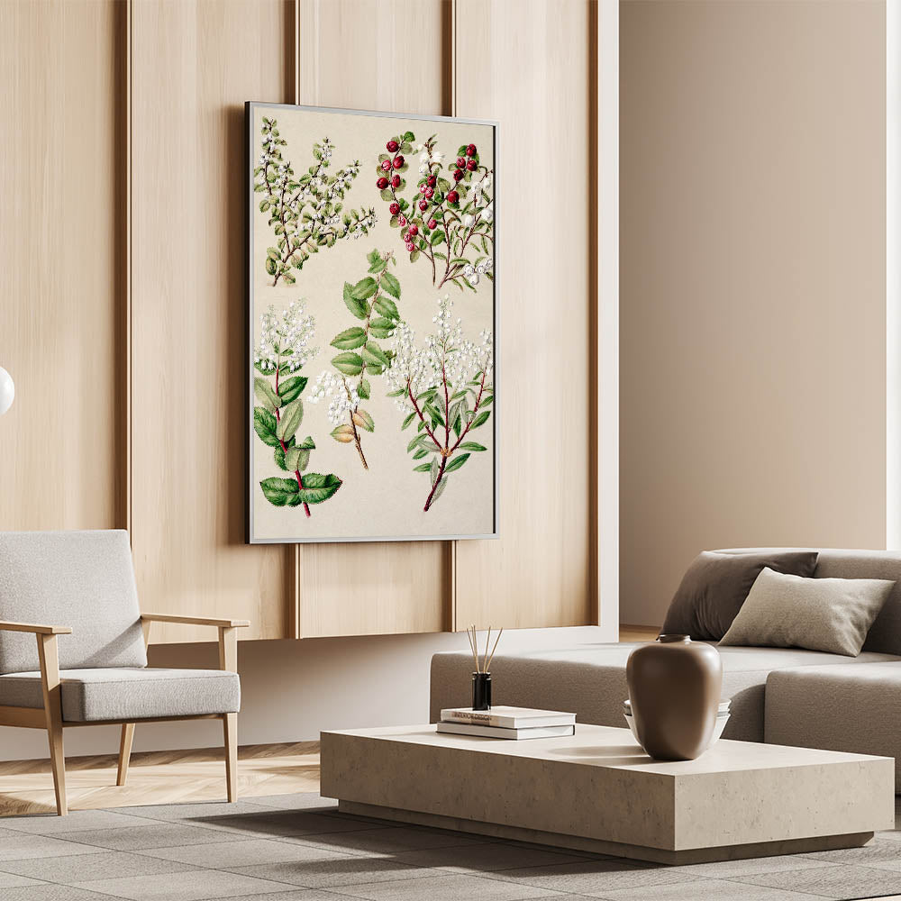 Add timeless beauty to your space with this detailed realism art print, featuring an antique botanical illustration of various Gaultheria species. The artwork showcases delicate white flowers, vibrant green leaves, and bright red berries, highlighting the intricate charm of nature. This fine art realism piece is perfect for nature enthusiasts or those seeking elegant decor that blends sophistication with a touch of history.