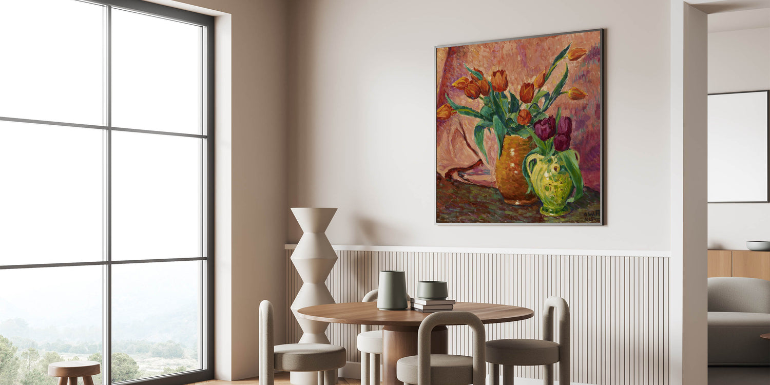 Bring the beauty of nature indoors with this Modern Wall Art piece, showcasing a vibrant still life of red and purple tulips in two beautiful vases. The rich colors of the flowers are complemented by a warm, earthy background, making this Contemporary Art piece perfect for those who appreciate Stylish Wall Art with a touch of elegance and warmth.