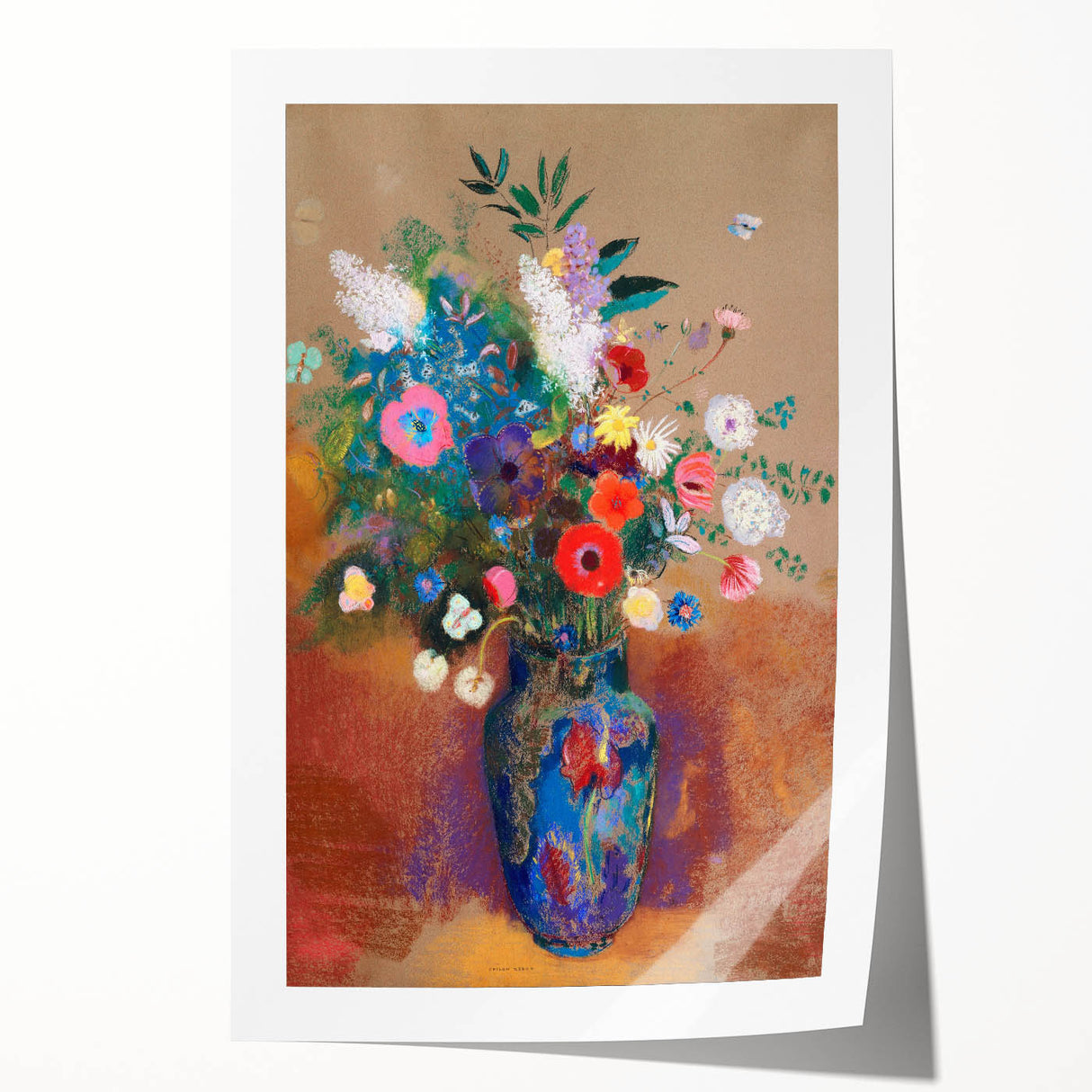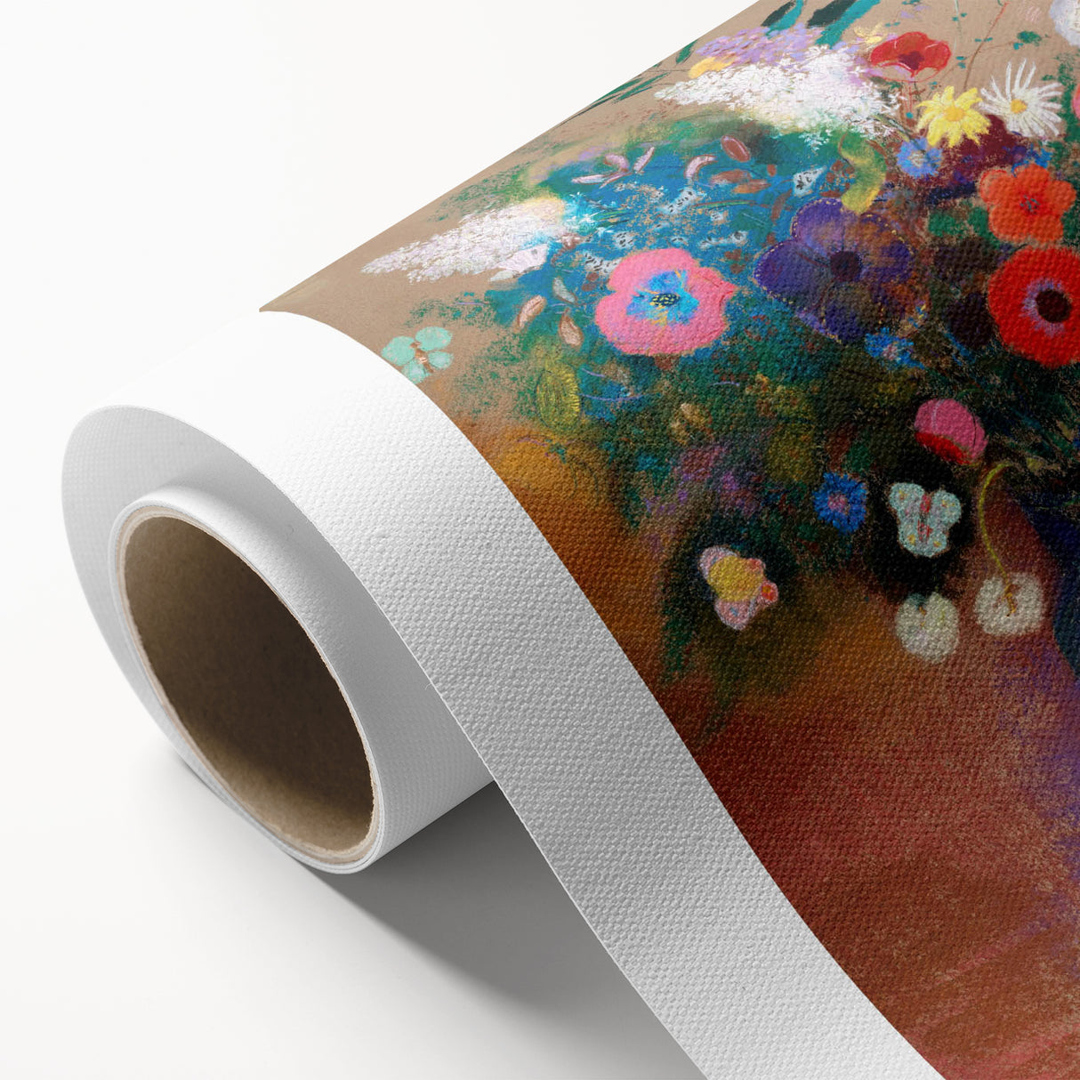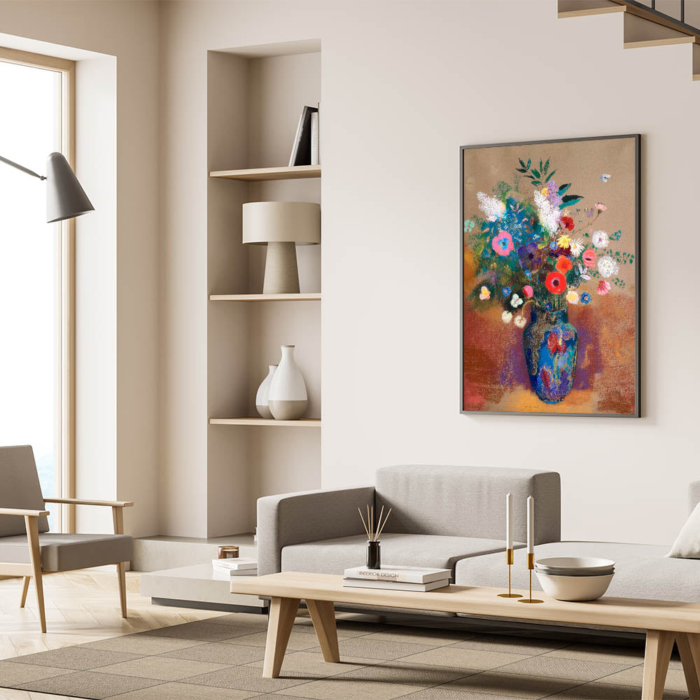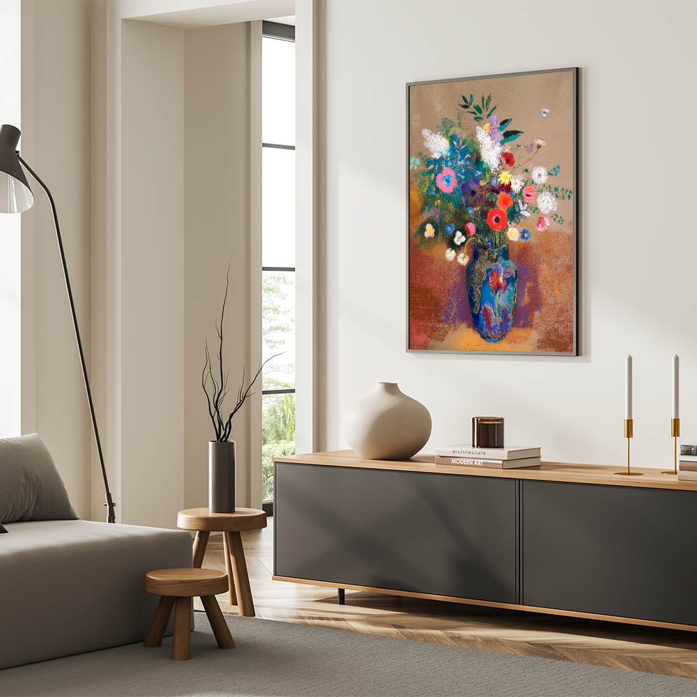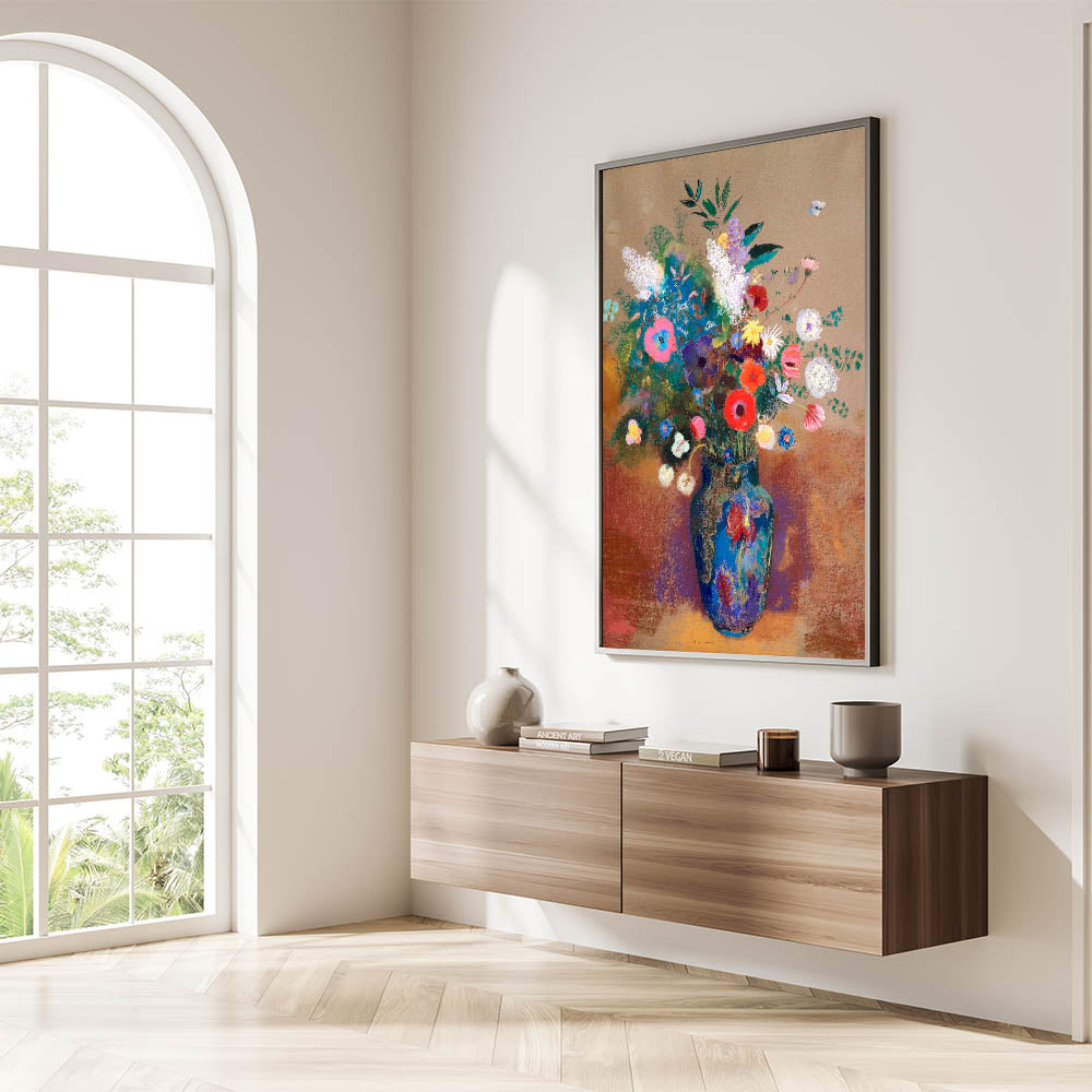 Brighten up your space with this vibrant floral wall art, capturing a stunning bouquet of flowers in an elegant vase. Created in Odilon Redon’s signature style, this artwork features an array of colorful flowers in hues of blue, red, purple, and pink, set against a warm, earthy background. Perfect for trendy home decor, this unique modern art piece brings warmth, elegance, and a touch of nature indoors, making it ideal for anyone who loves the charm of floral designs.