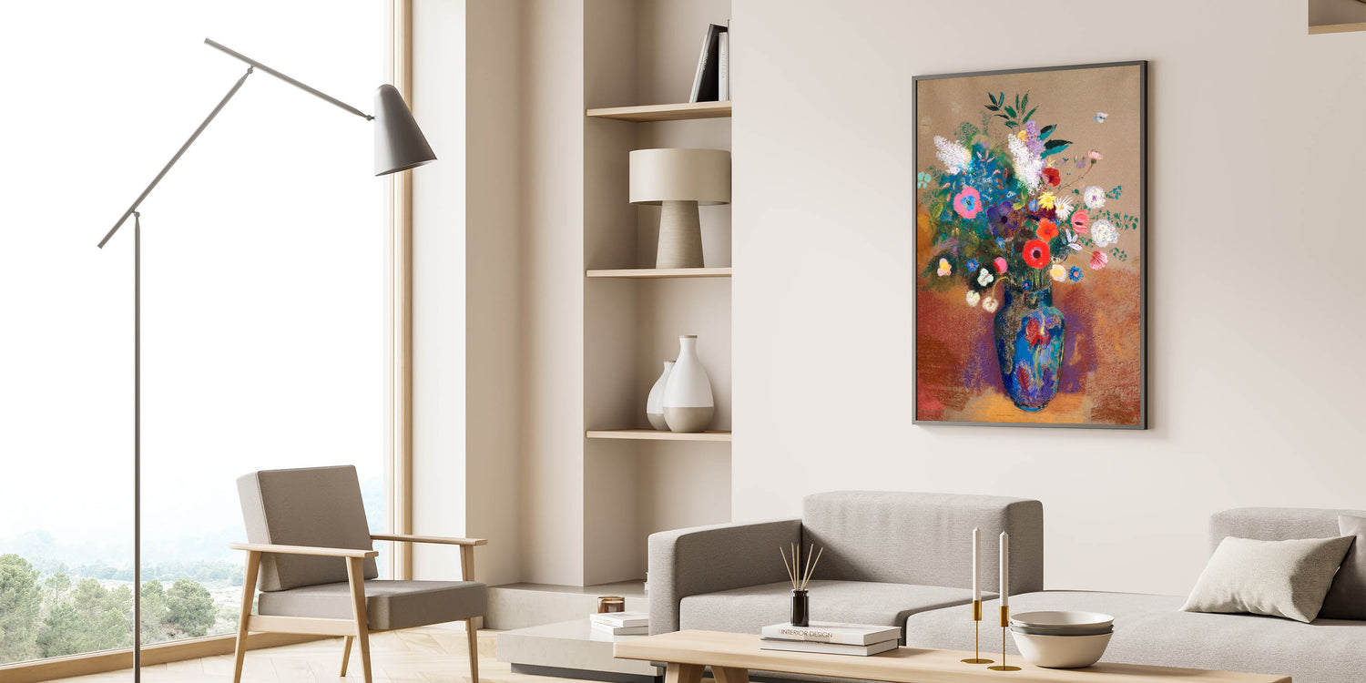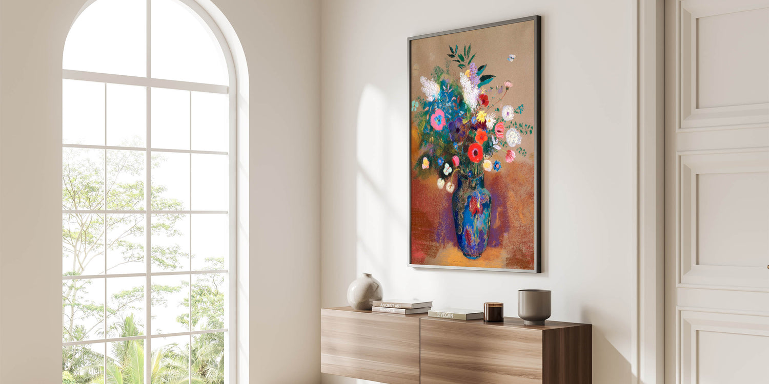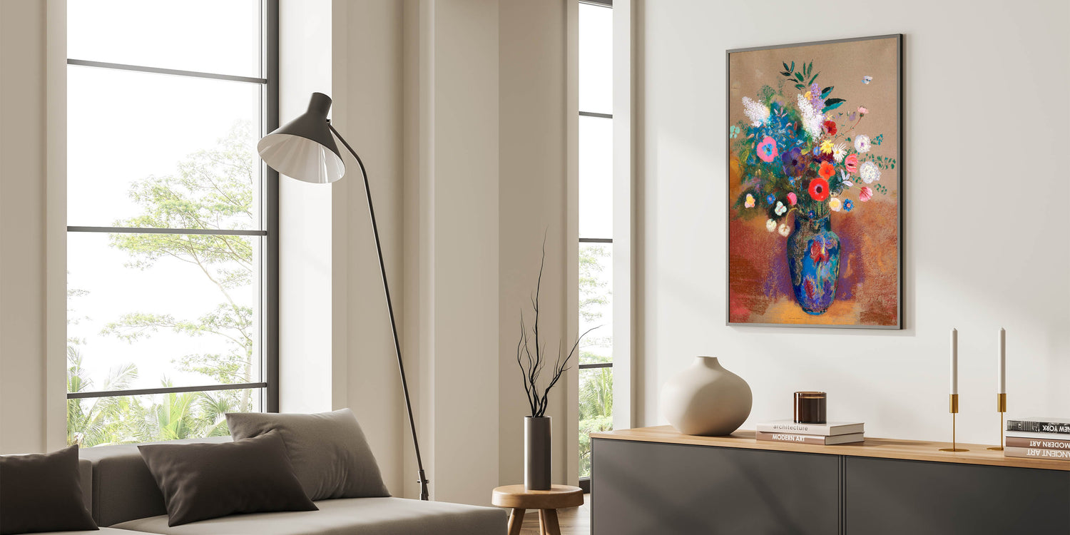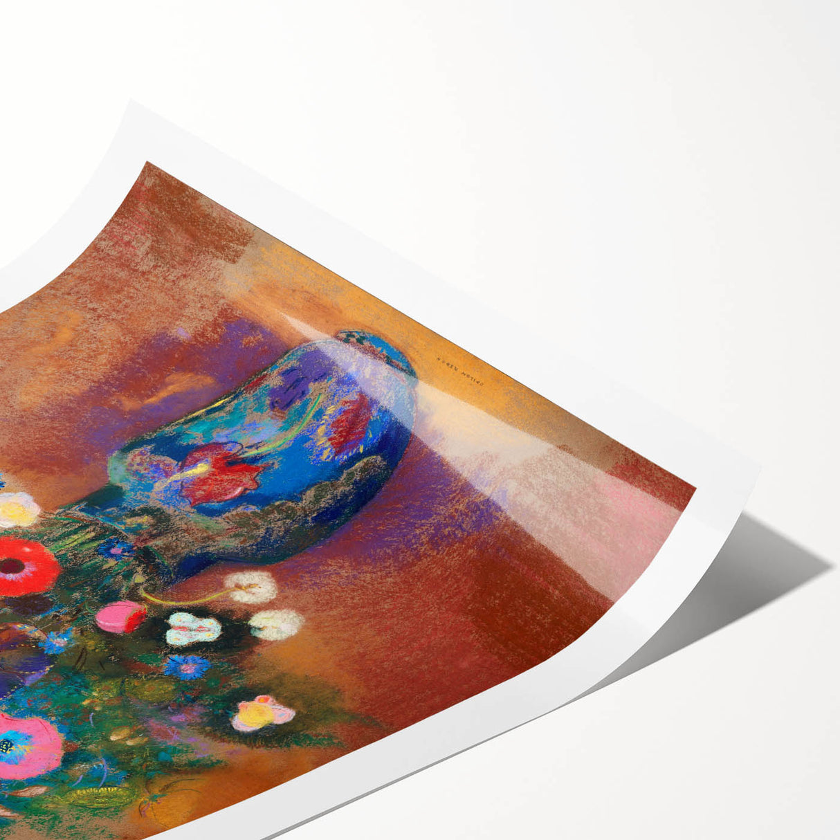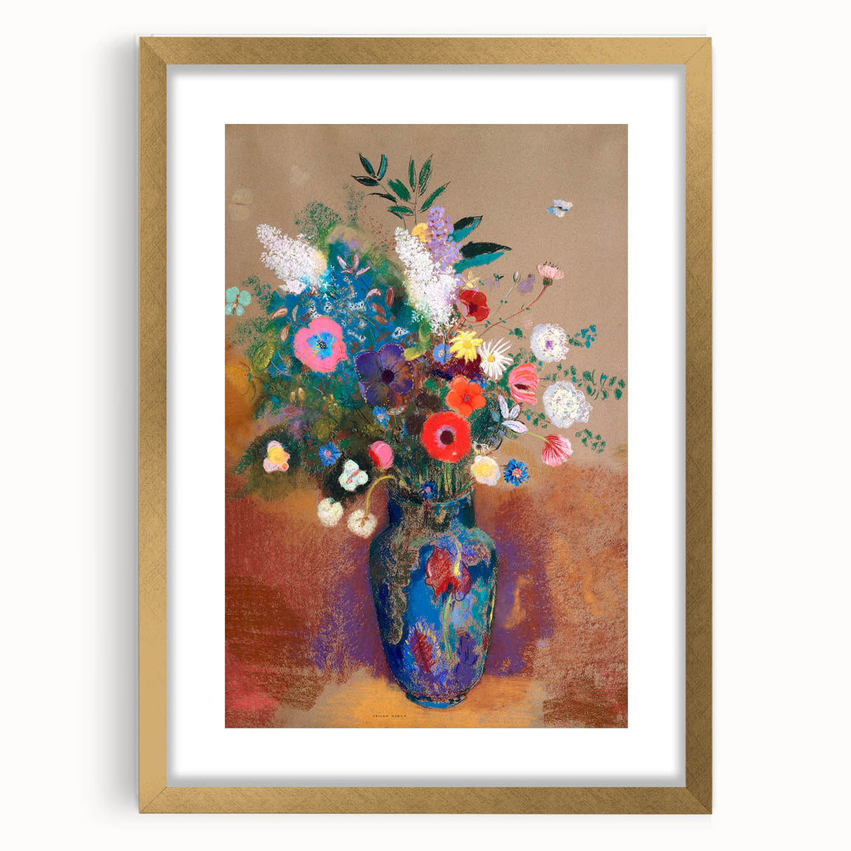 Brighten up your space with this vibrant floral wall art, capturing a stunning bouquet of flowers in an elegant vase. Created in Odilon Redon’s signature style, this artwork features an array of colorful flowers in hues of blue, red, purple, and pink, set against a warm, earthy background. Perfect for trendy home decor, this unique modern art piece brings warmth, elegance, and a touch of nature indoors, making it ideal for anyone who loves the charm of floral designs.