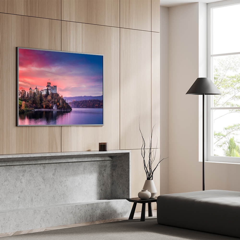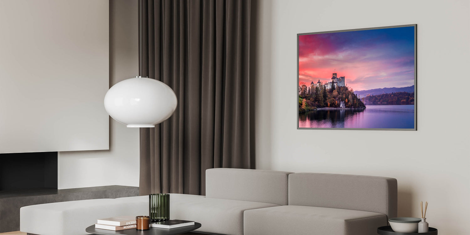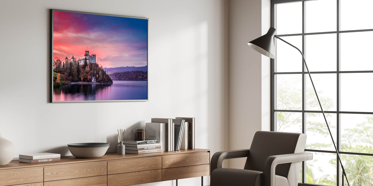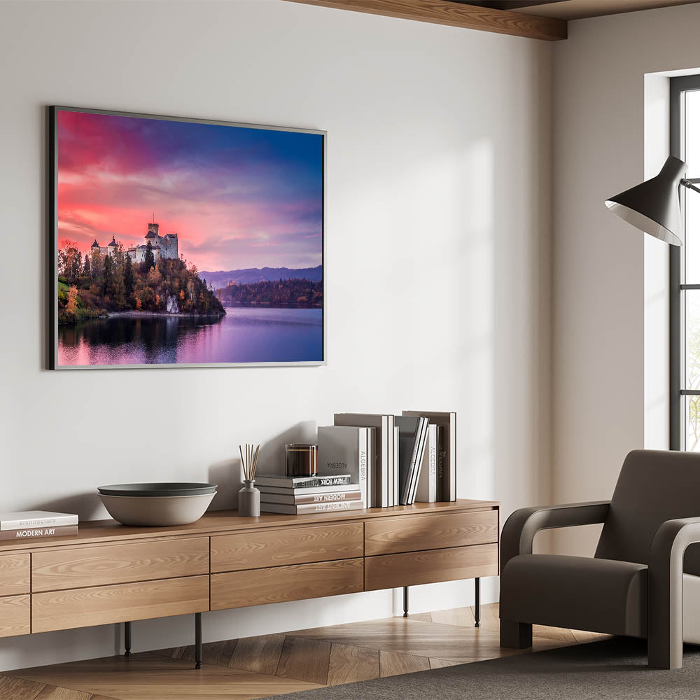 Bring the timeless beauty of Poland into your home with this stunning artwork featuring the majestic Niedzica Castle at sunset. The soft pink and purple hues of the sky reflect on the calm waters, perfectly framing the historic castle perched on the cliffside. This captivating piece is ideal for those who appreciate the rich history and breathtaking landscapes of Poland.