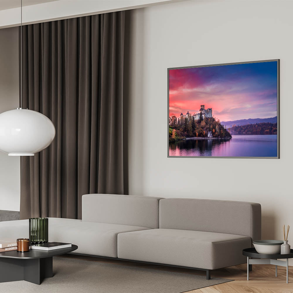 Enhance your space with this striking portrayal of Niedzica Castle at sunset. This artwork captures the elegance of Polish architecture and the serene beauty of the surrounding landscape, making it the perfect addition to any home or office.