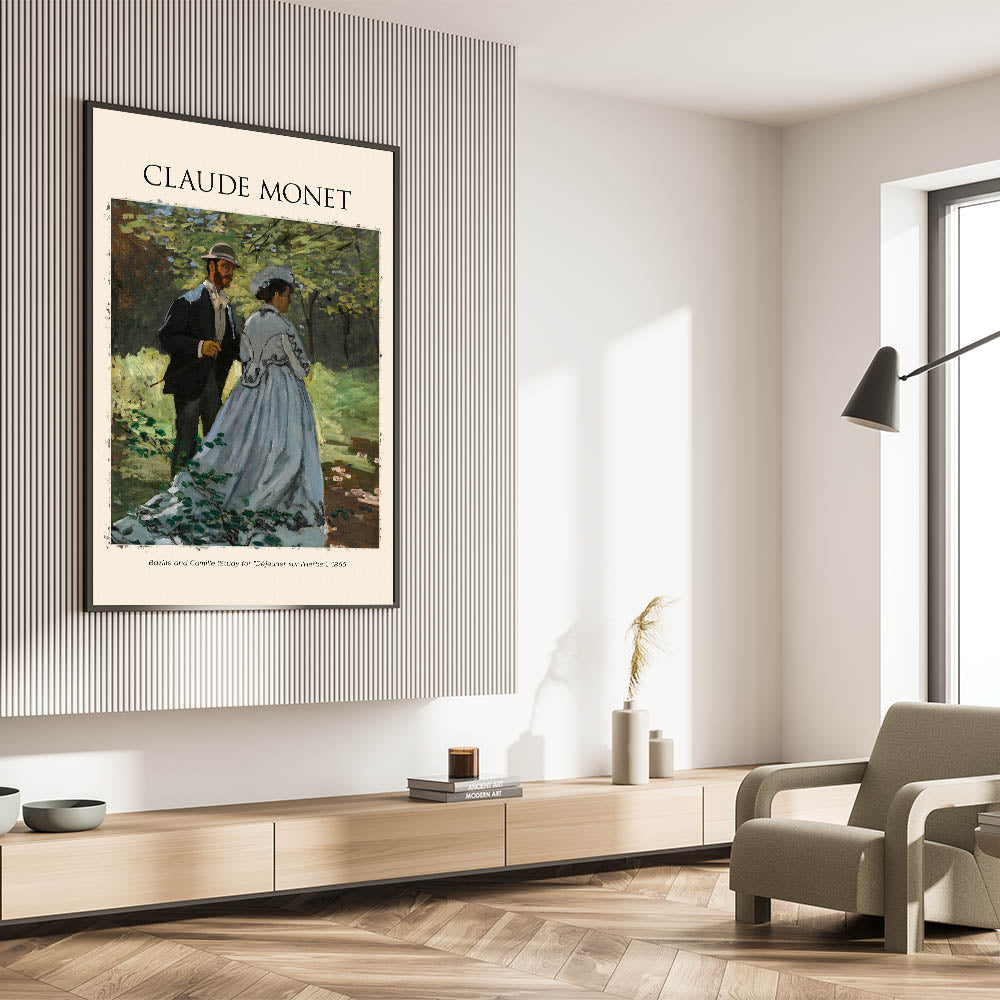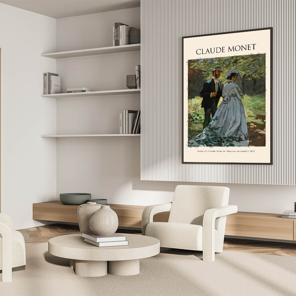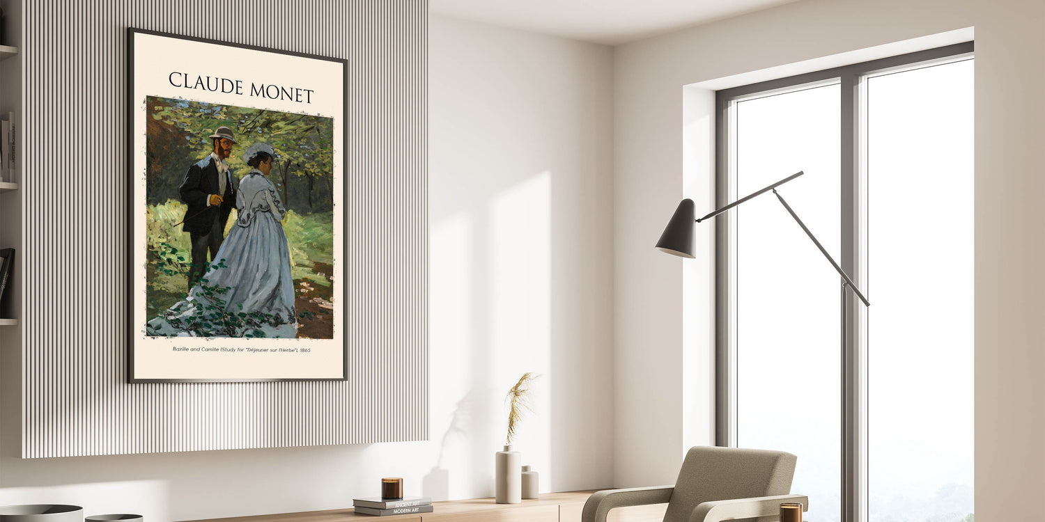 Capture the elegance of Claude Monet's early work with "Bazille and Camille (Study for 'Déjeuner sur l'Herbe'), 1865." This stunning piece portrays two figures, Bazille and Camille, in a peaceful outdoor setting. With Monet's expert brushwork and a muted color palette, this Impressionist study demonstrates his focus on light, shadow, and the subtleties of human interaction within nature. This iconic artwork makes an exquisite addition to any space, embodying the refinement of the Impressionist movement.