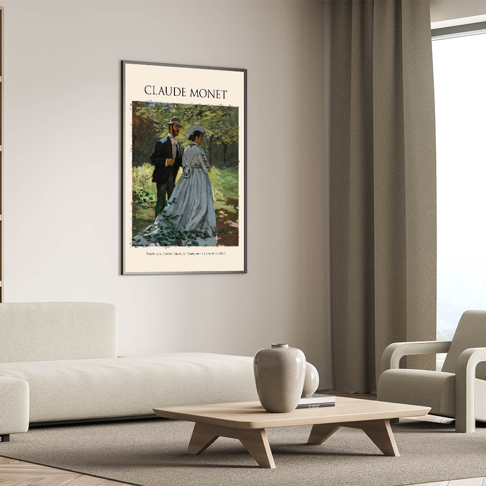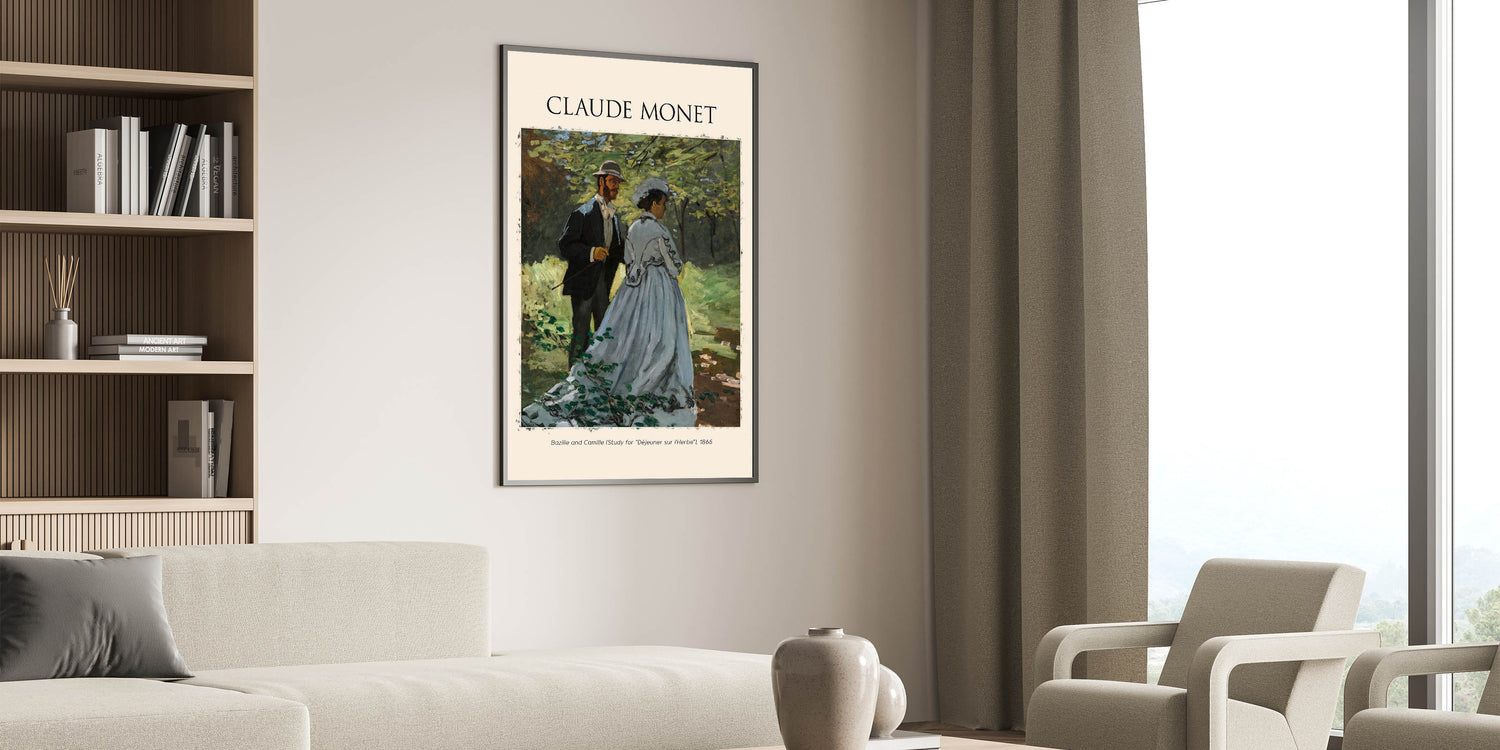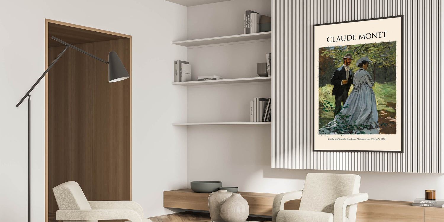 Capture the elegance of Claude Monet's early work with "Bazille and Camille (Study for 'Déjeuner sur l'Herbe'), 1865." This stunning piece portrays two figures, Bazille and Camille, in a peaceful outdoor setting. With Monet's expert brushwork and a muted color palette, this Impressionist study demonstrates his focus on light, shadow, and the subtleties of human interaction within nature. This iconic artwork makes an exquisite addition to any space, embodying the refinement of the Impressionist movement.
