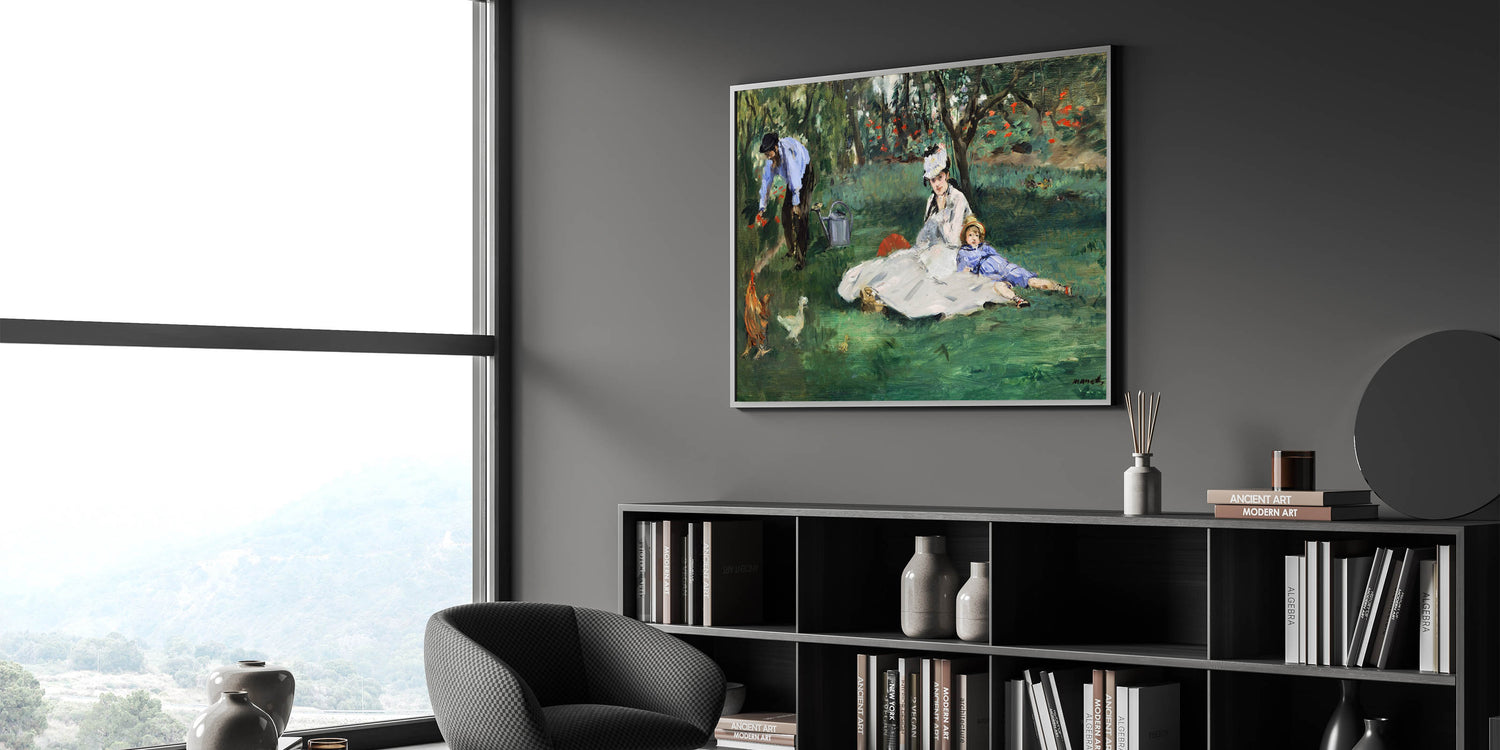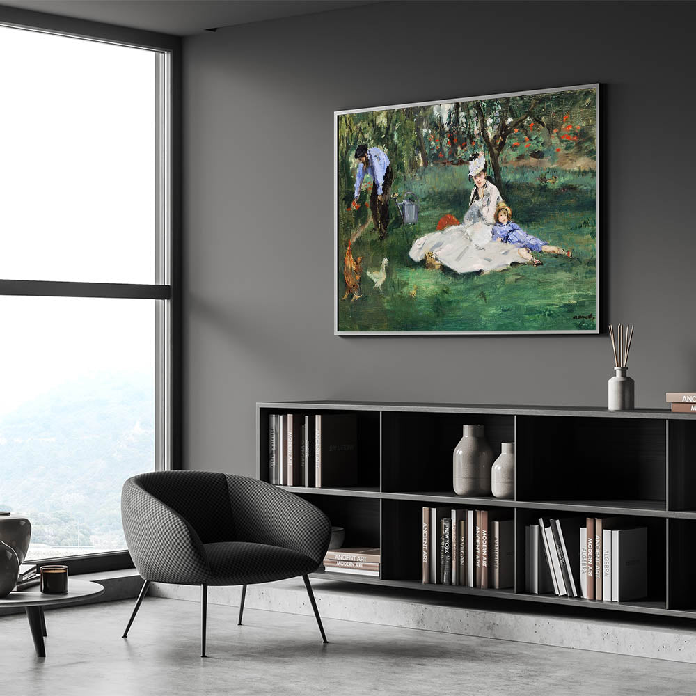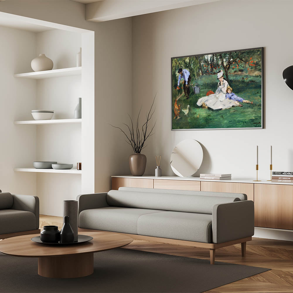 Bring a moment of familial warmth and serenity into your home with Claude Monet's "The Monet Family in the Garden, 1874." This beautiful painting captures an idyllic day spent in the garden, with Madame Monet and their child lounging in the grass while Monet tends to the flowers. The lush greenery and colorful blooms are rendered in Monet’s signature Impressionist style, creating a peaceful and intimate atmosphere. Perfect for art lovers looking to add a touch of elegance and familial warmth to their décor.