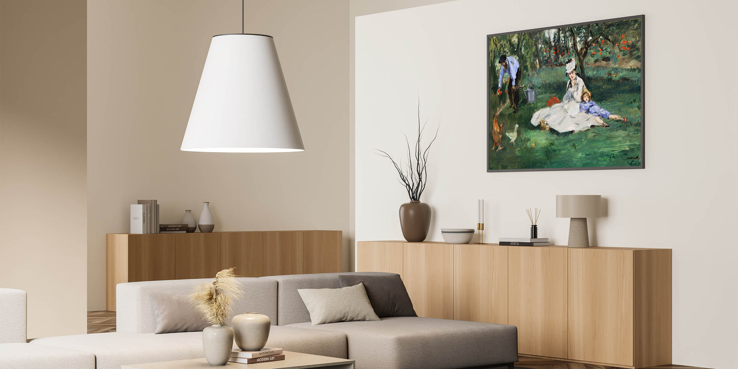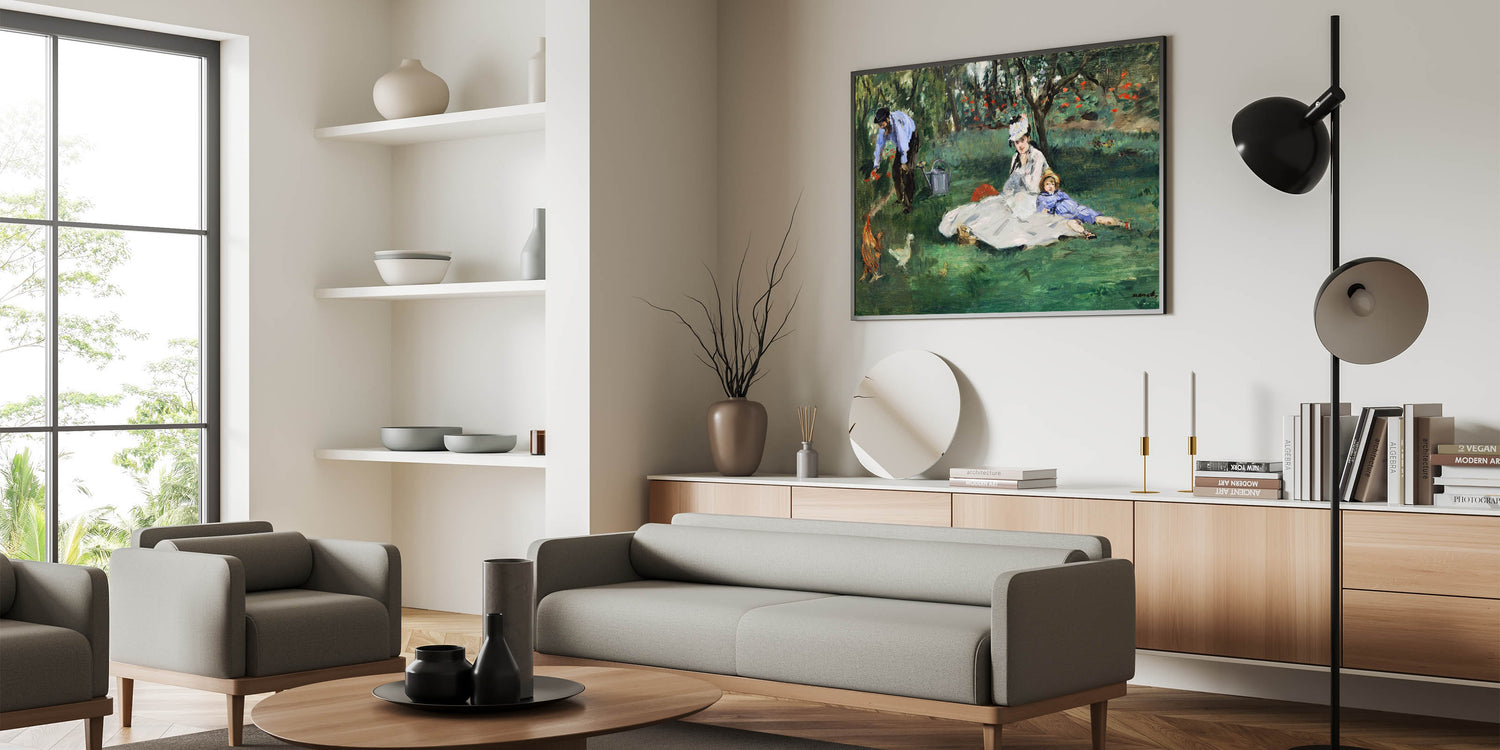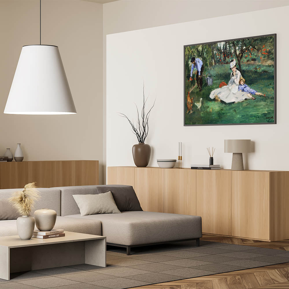 Bring a moment of familial warmth and serenity into your home with Claude Monet's "The Monet Family in the Garden, 1874." This beautiful painting captures an idyllic day spent in the garden, with Madame Monet and their child lounging in the grass while Monet tends to the flowers. The lush greenery and colorful blooms are rendered in Monet’s signature Impressionist style, creating a peaceful and intimate atmosphere. Perfect for art lovers looking to add a touch of elegance and familial warmth to their décor.