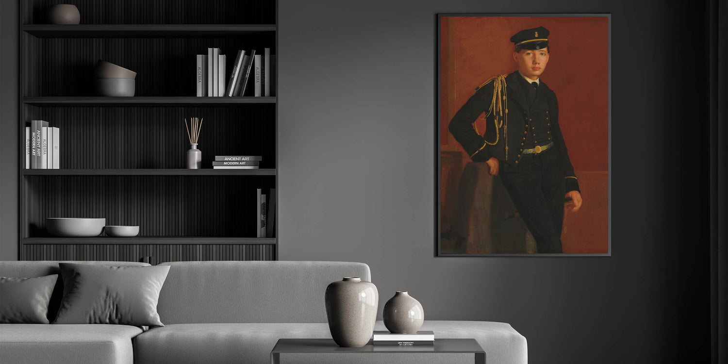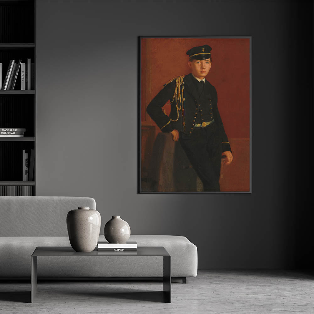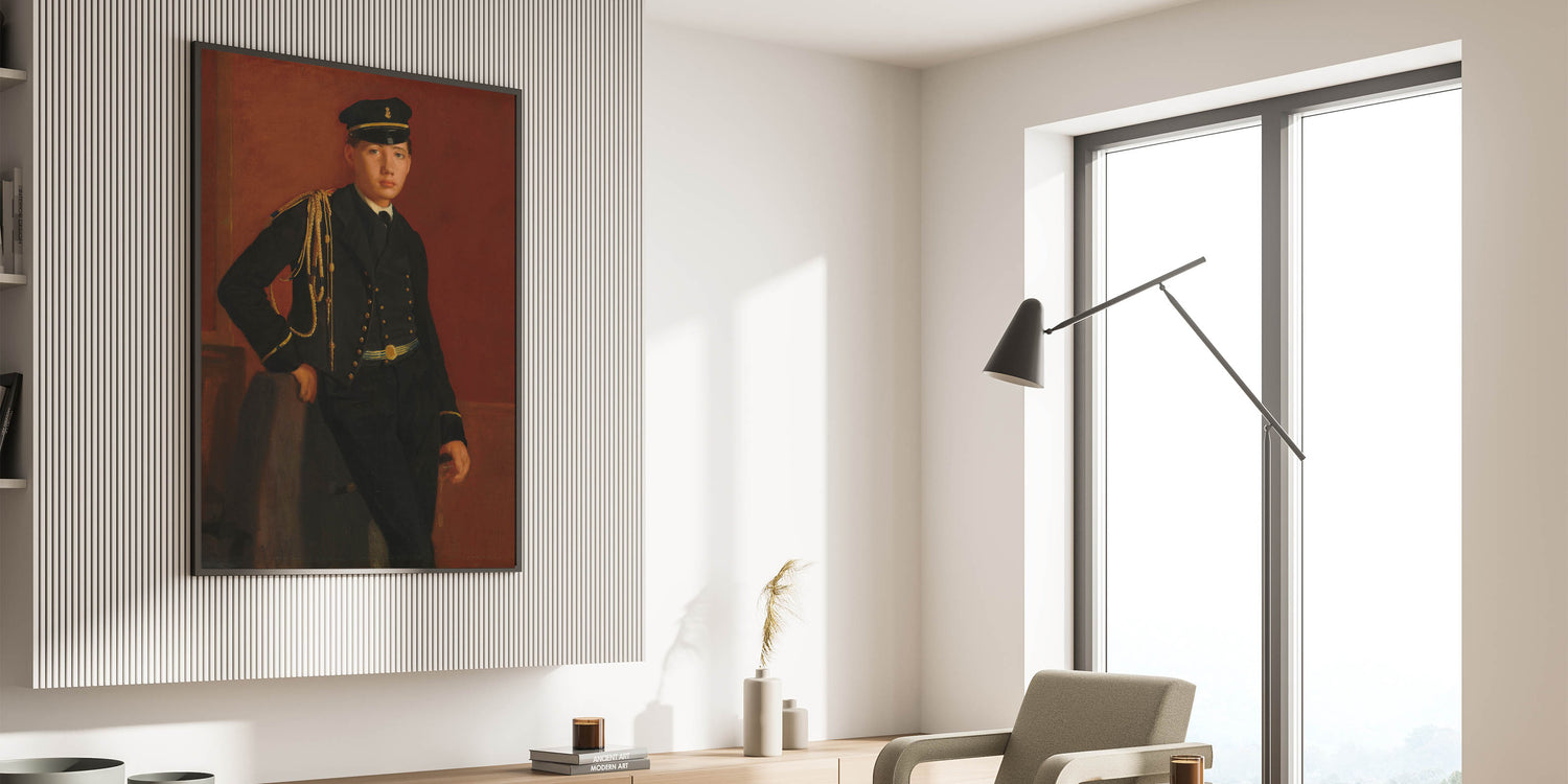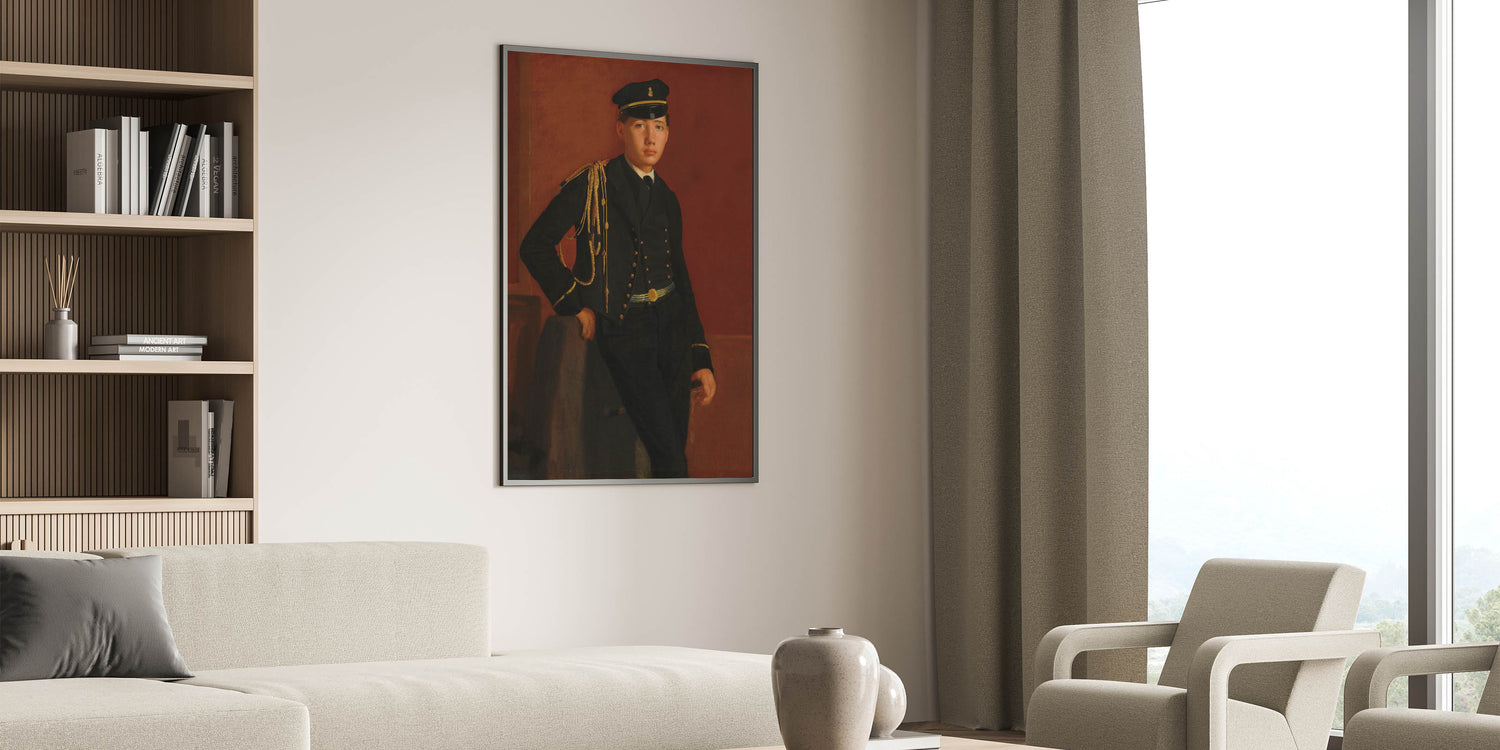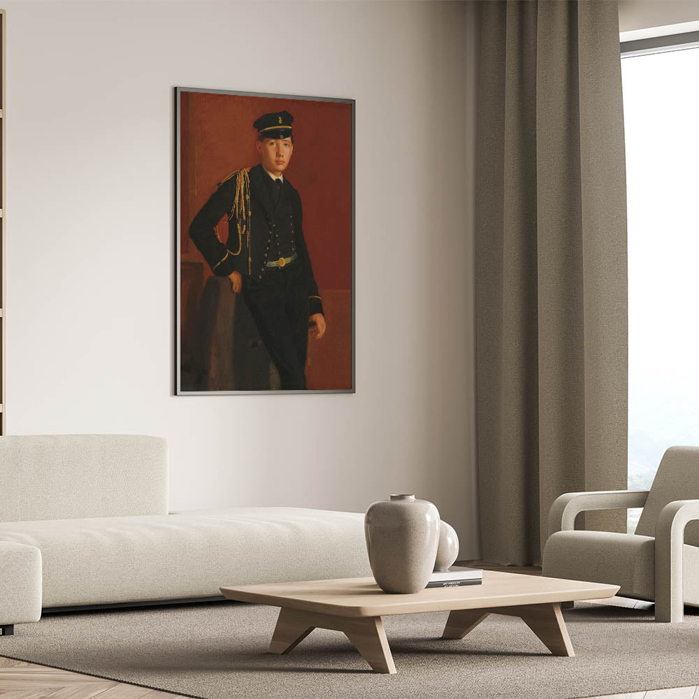 This striking portrait from the Famous Edgar Degas paintings collection showcases a young man in formal uniform, a rare depiction of an individual in Degas’ oeuvre. Known for his focus on movement and dancers, this portrait demonstrates Degas' versatility in capturing human form and expression with precision and depth. The dark tones of the uniform contrast beautifully with the rich red background, making this piece a powerful representation of French Impressionist wall art.