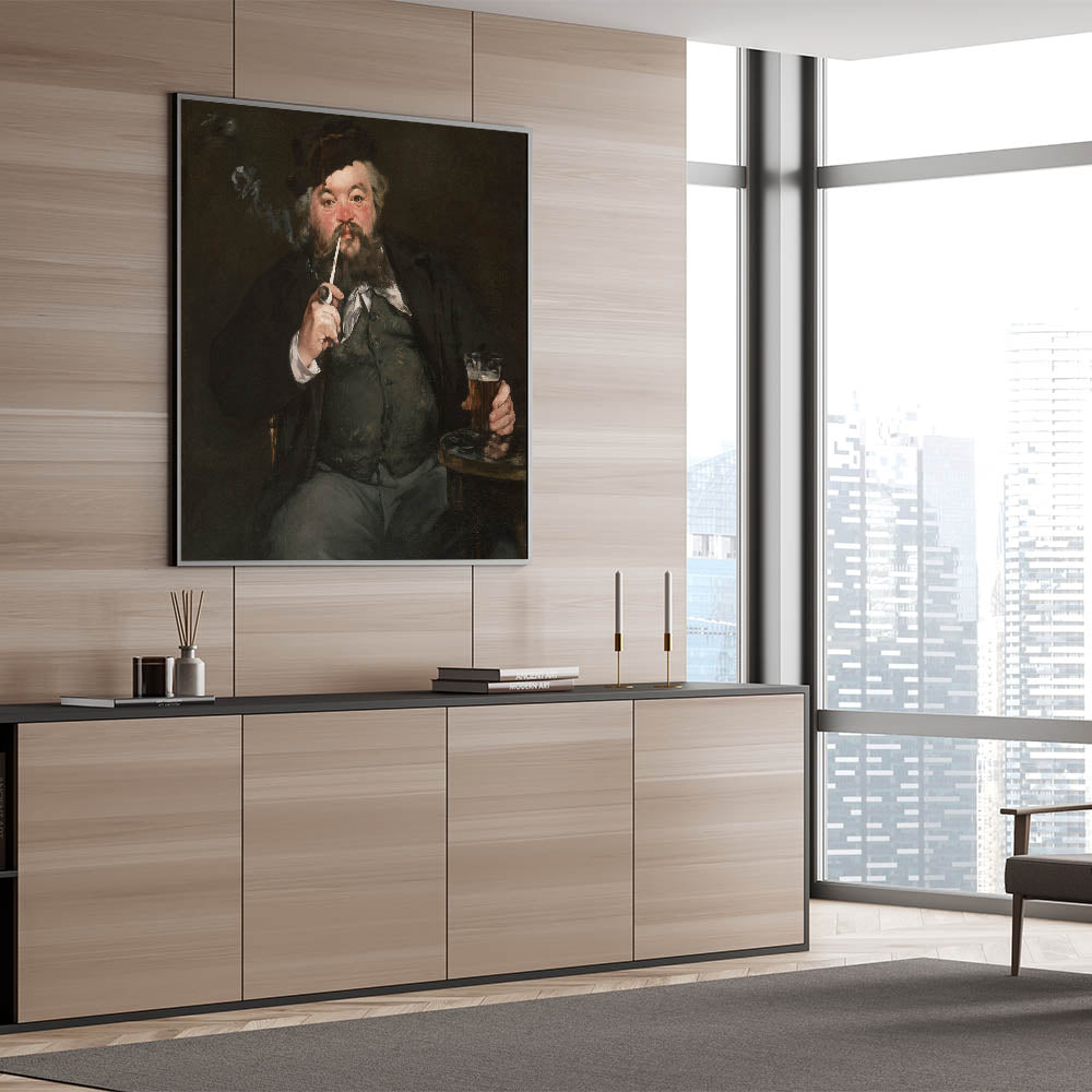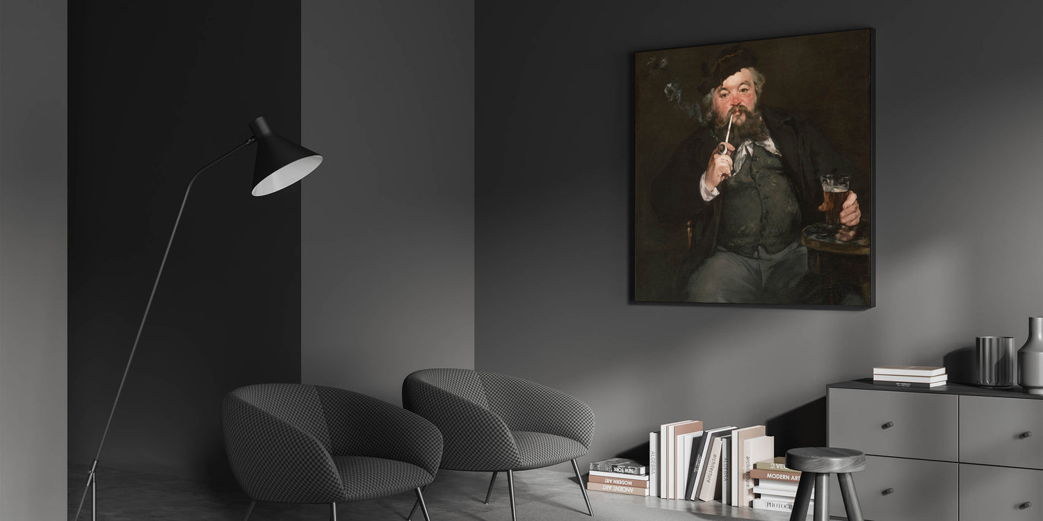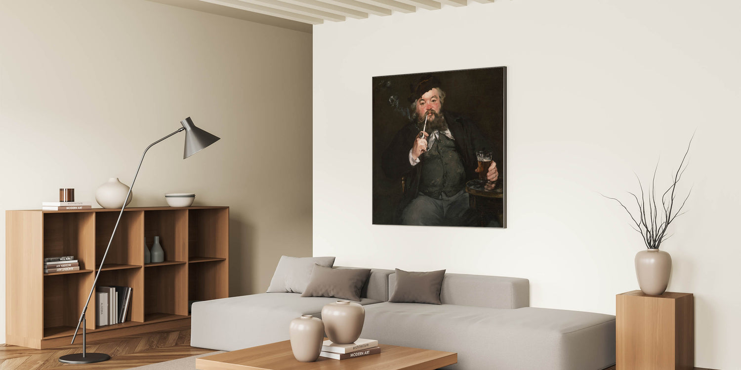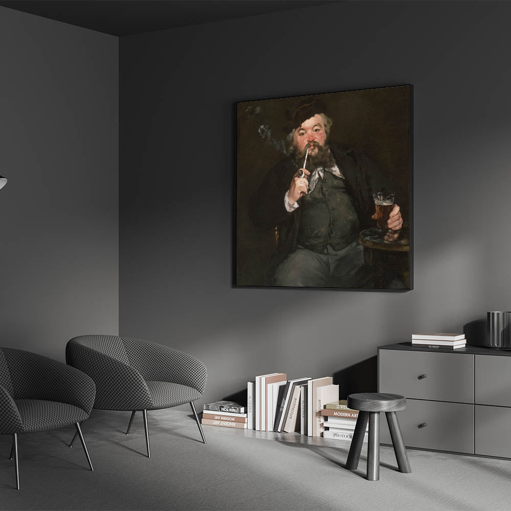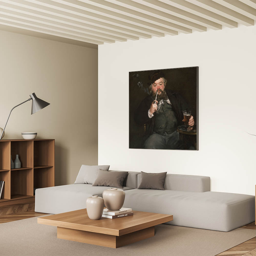 This striking reproduction of Édouard Manet’s famous portrait captures the bold and expressive style that made him a key figure in the French Impressionist movement. Featuring a man in a relaxed pose, smoking a pipe and enjoying a drink, Manet’s ability to capture the complexity of human character shines through in this artwork. The dark, moody tones contrast with the subject’s rosy cheeks and the rich textures of his clothing, creating an image that feels both intimate and powerful.