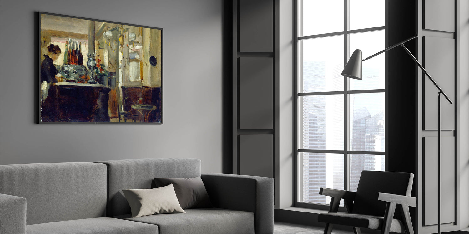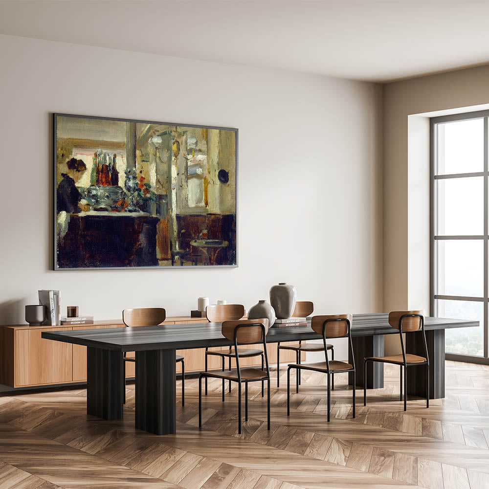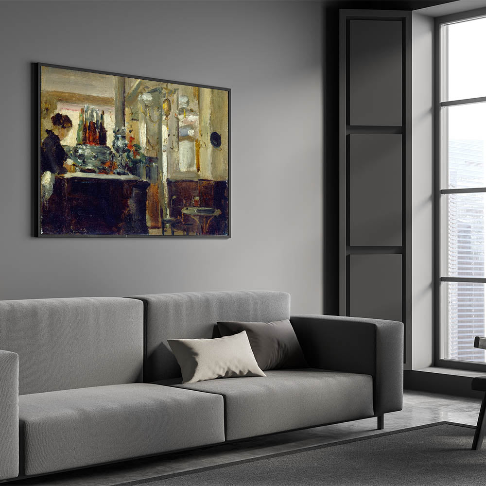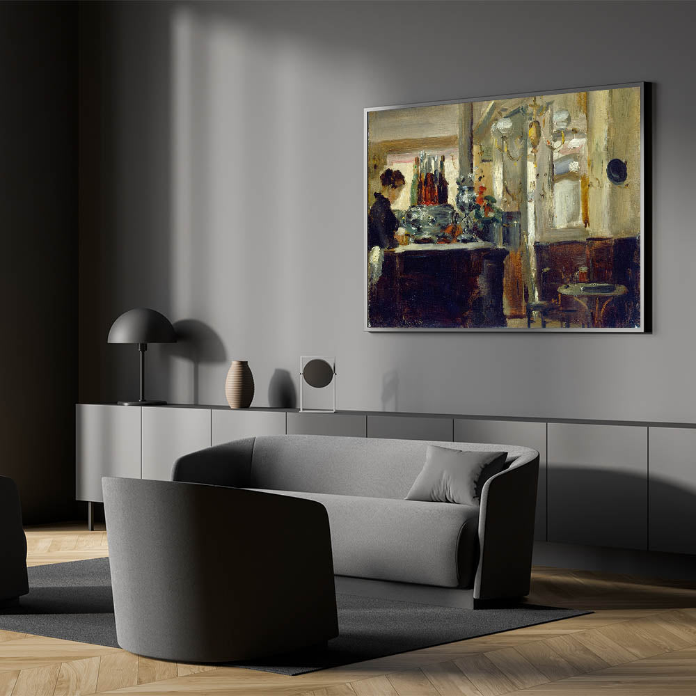 Invite the warmth and charm of a classic French café into your space with this beautiful reproduction of Édouard Manet's interior scene. Painted with soft, expressive brushstrokes, this work captures the quiet moments of café life in 19th-century Paris. The attention to detail in the bottles, the bar, and the warm lighting evoke a sense of comfort and intimacy, transporting you to a peaceful corner of the French capital.