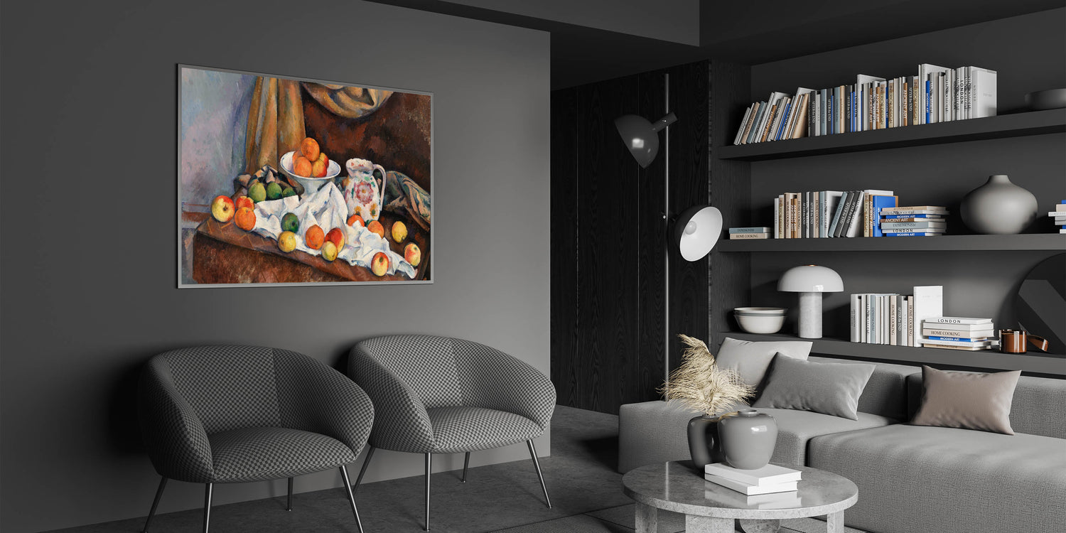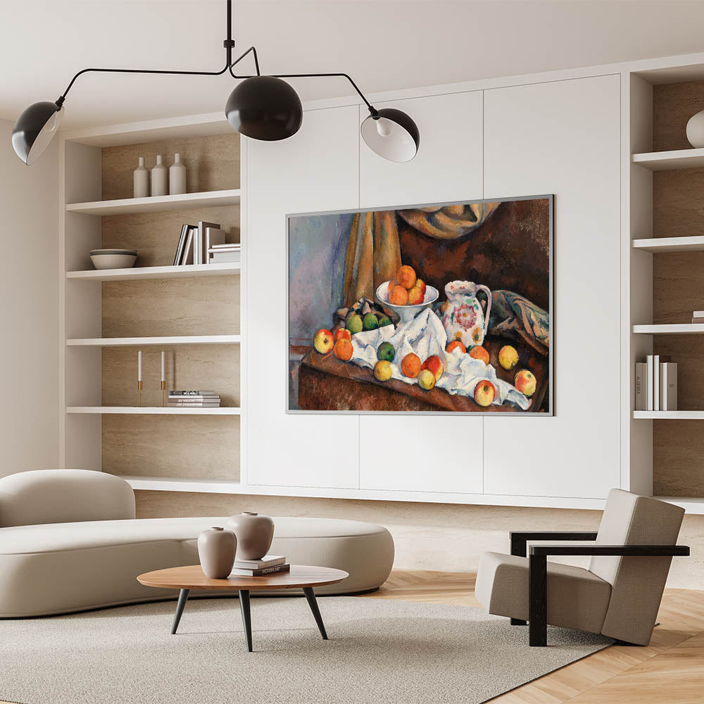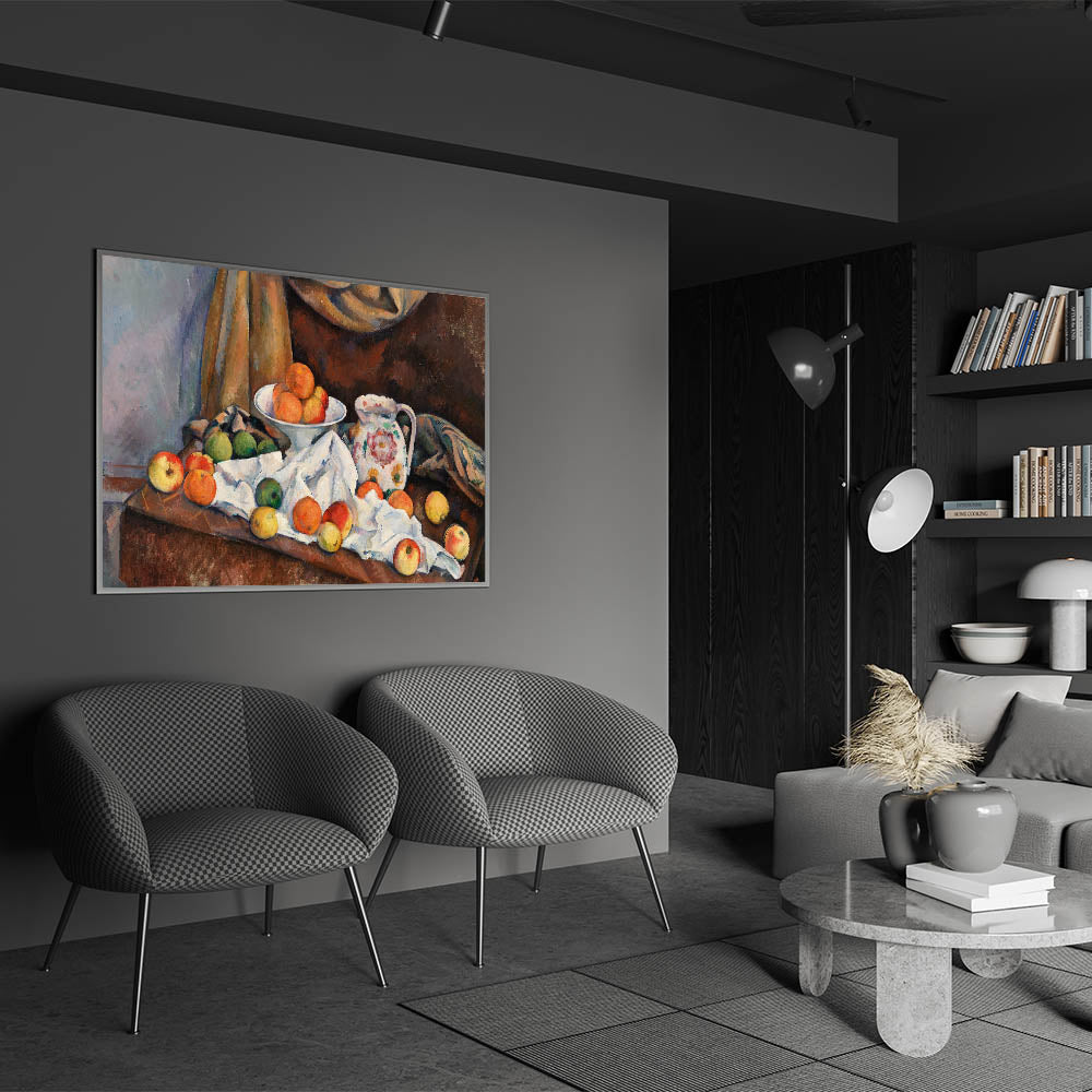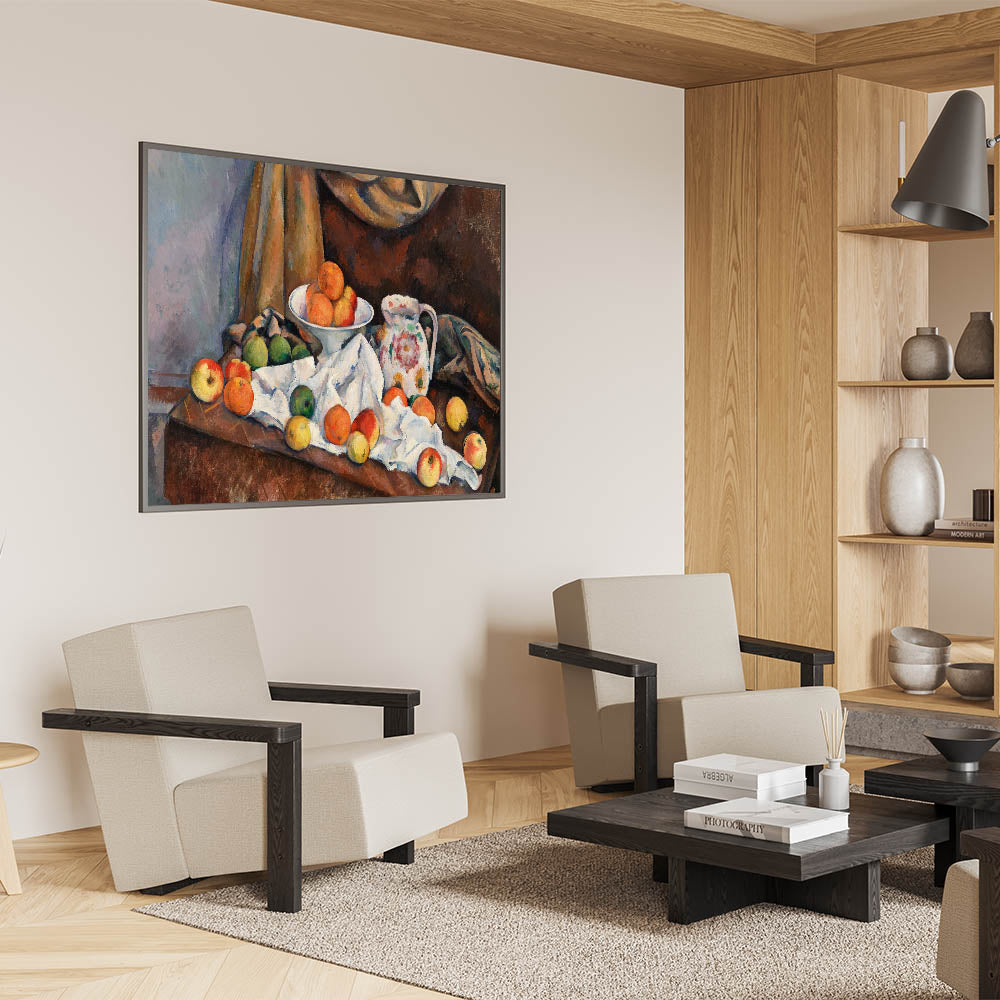 Bring a touch of timeless elegance to your space with this beautiful reproduction of Paul Cezanne’s classic still life. Featuring a vibrant arrangement of apples and citrus fruits on a draped tablecloth, this work showcases Cezanne’s mastery of color and form. The rich, warm hues contrast against the cool, folded fabric, creating a harmonious composition that adds sophistication and warmth to any room.