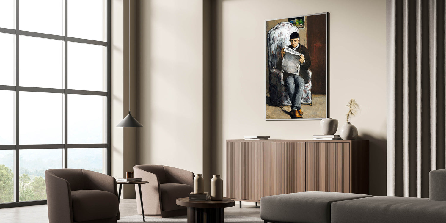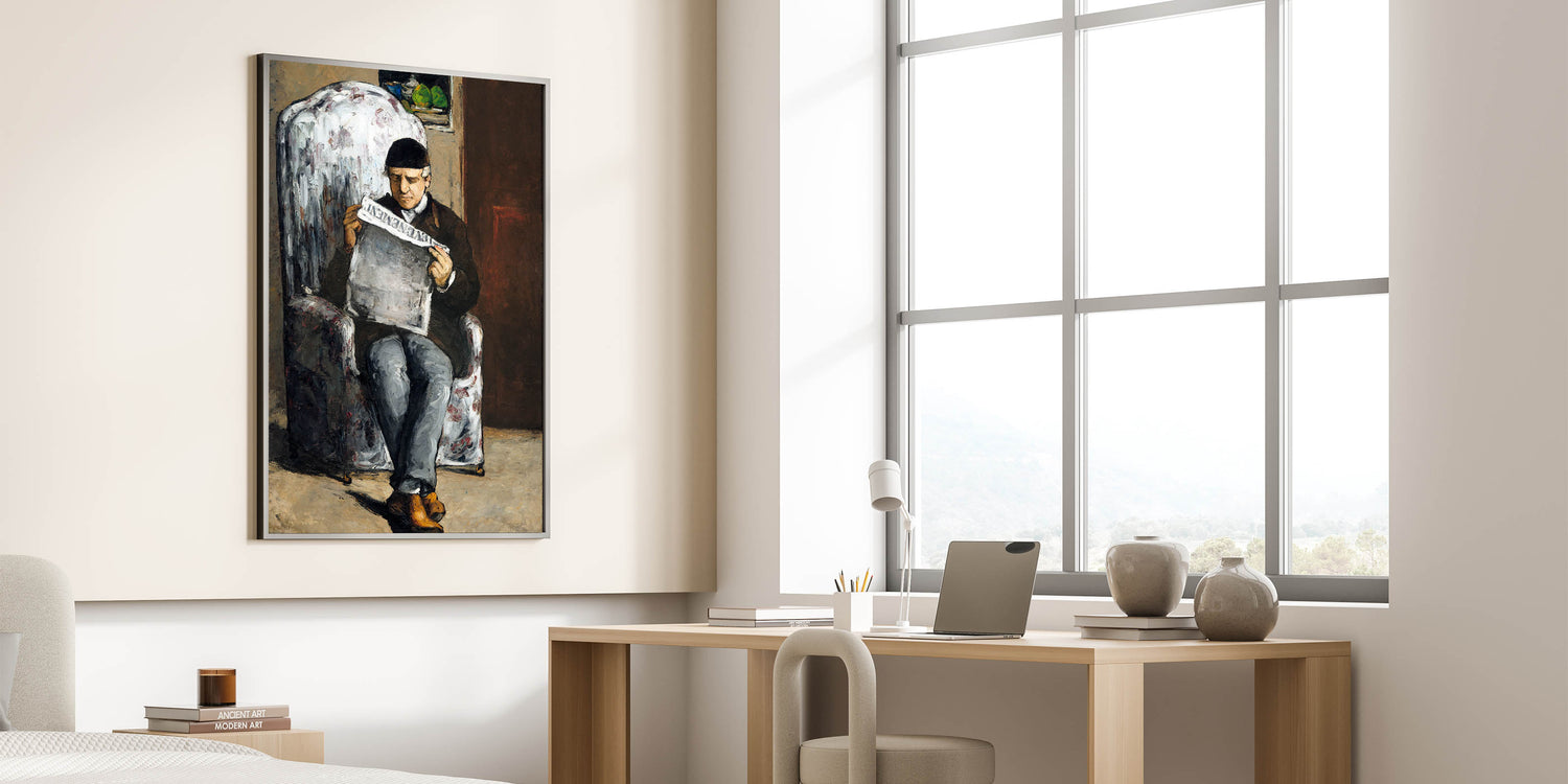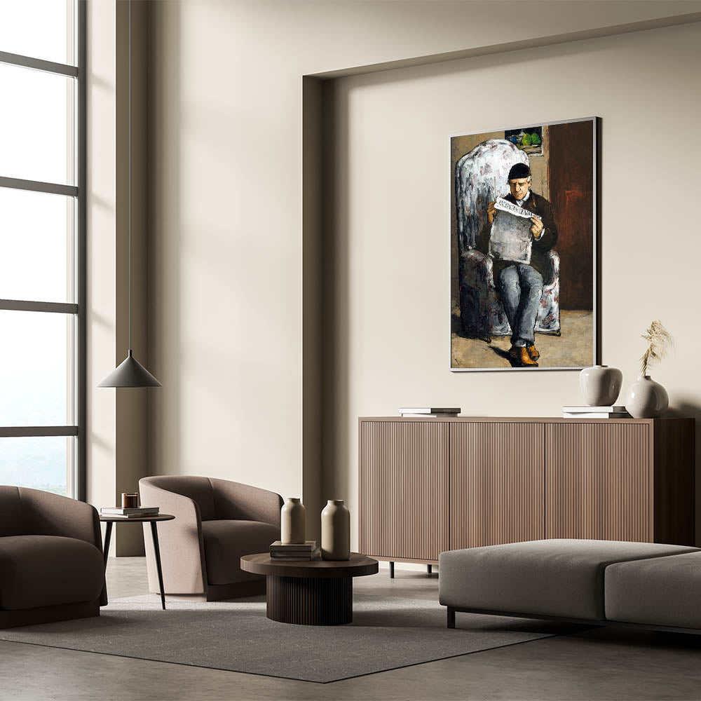 Add depth and character to your space with this stunning reproduction of Paul Cezanne’s portrait of a man reading a newspaper. A master of Post-Impressionism, Cezanne captures a quiet, contemplative moment through bold brushstrokes and a subtle, earthy palette. The expressive lines and detailed textures make this a striking piece of art, ideal for those who appreciate thought-provoking decor.