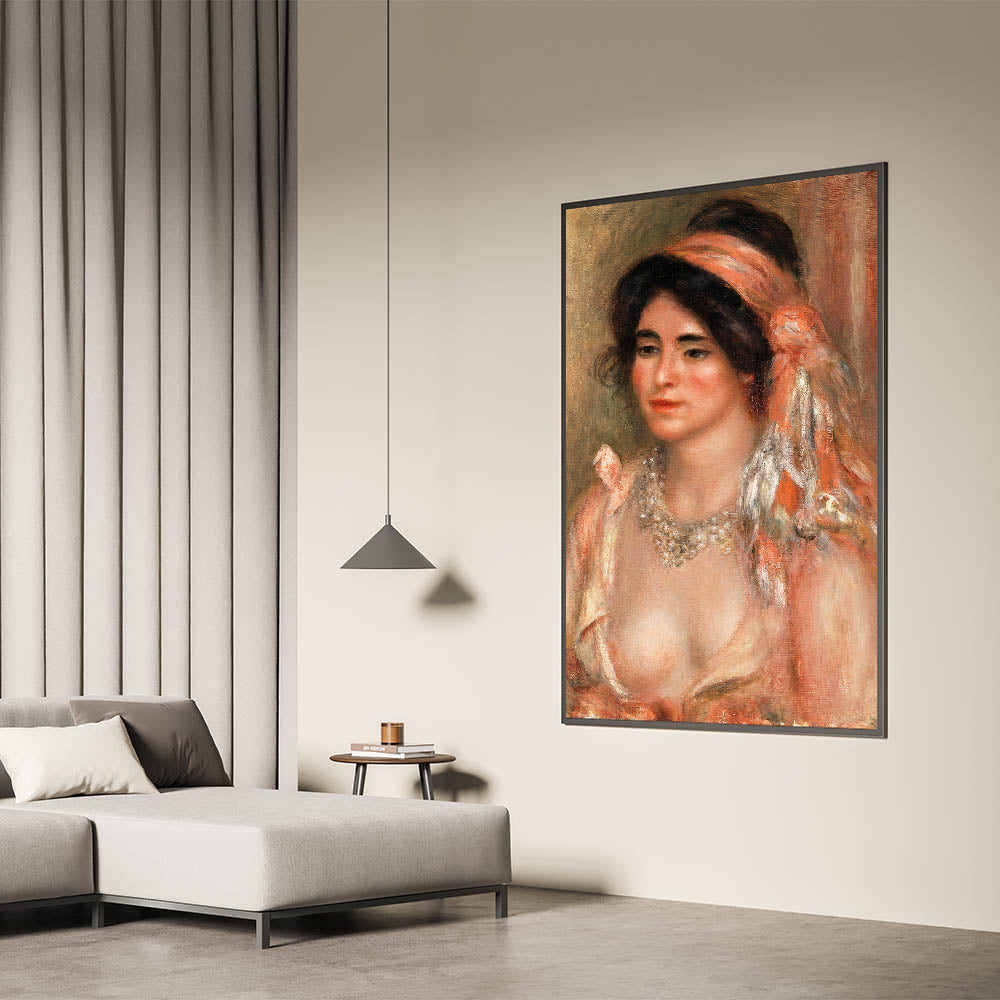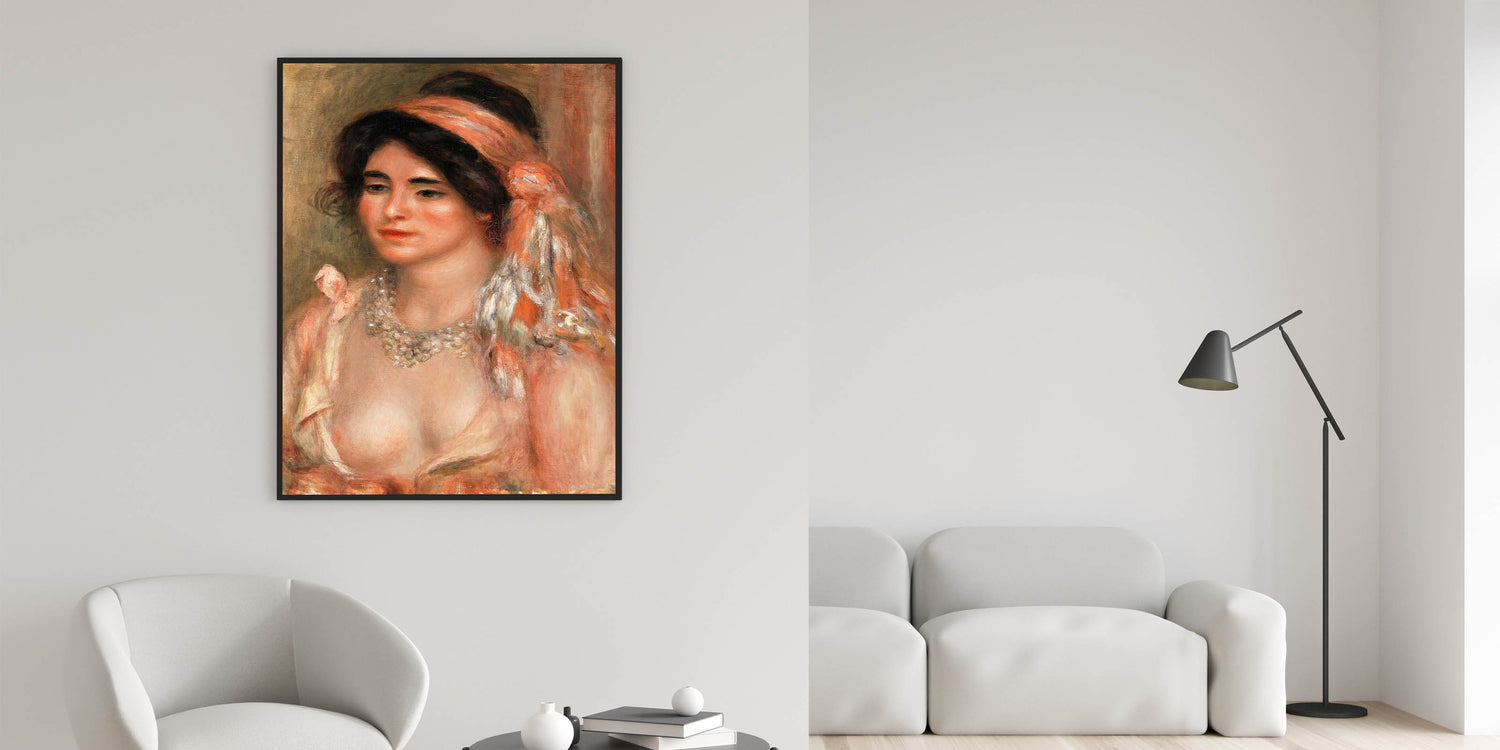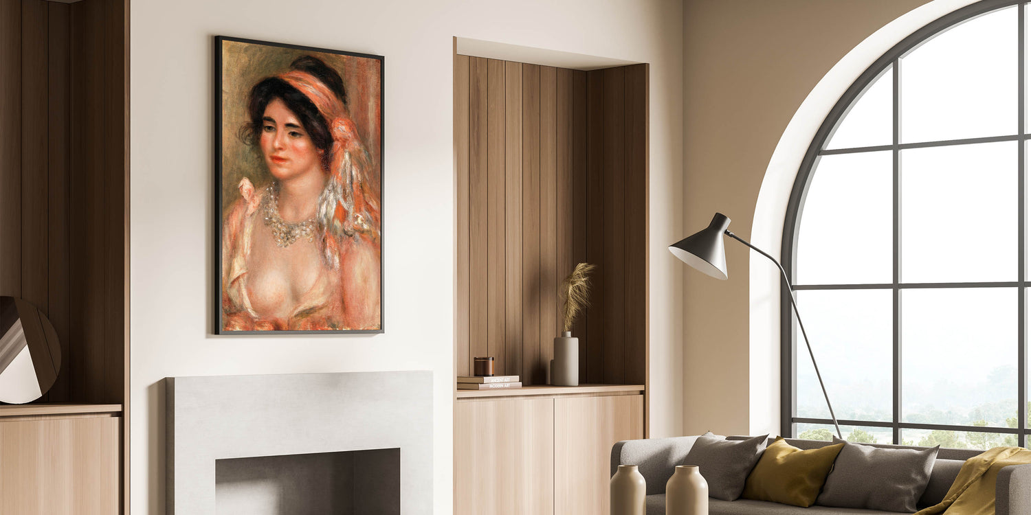 Elevate your home decor with this stunning portrait by Pierre-Auguste Renoir, one of the pioneers of French Impressionism. Known for his masterful depictions of the human form, Renoir’s captivating use of color and light is fully displayed in this exquisite piece. The softness of the subject's features, combined with the vibrant orange and pink tones, exudes a sense of elegance and tranquility that is quintessentially Renoir.