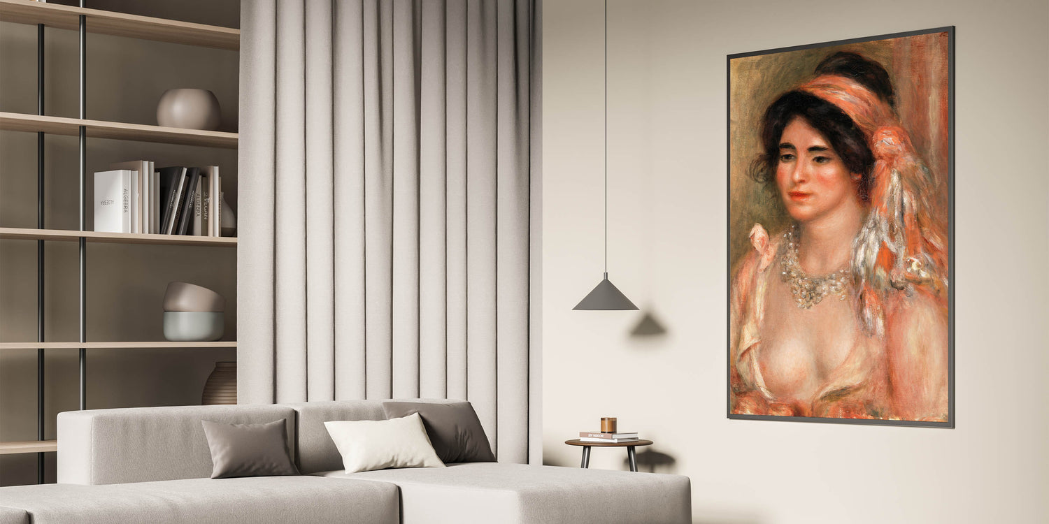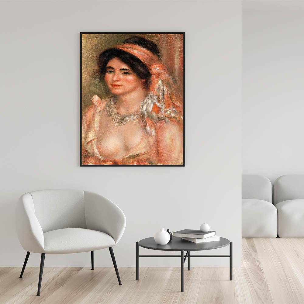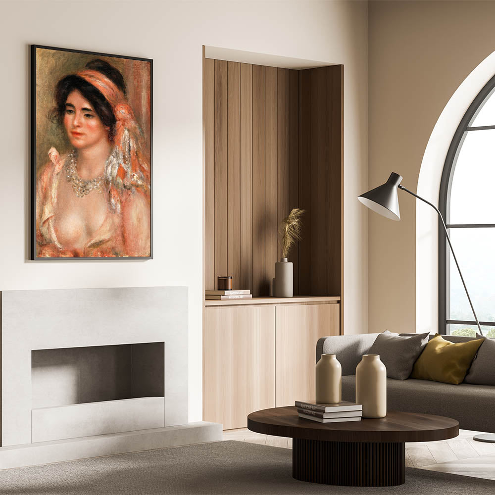 Elevate your home decor with this stunning portrait by Pierre-Auguste Renoir, one of the pioneers of French Impressionism. Known for his masterful depictions of the human form, Renoir’s captivating use of color and light is fully displayed in this exquisite piece. The softness of the subject's features, combined with the vibrant orange and pink tones, exudes a sense of elegance and tranquility that is quintessentially Renoir.