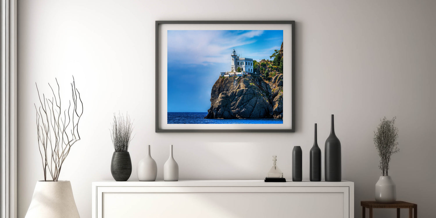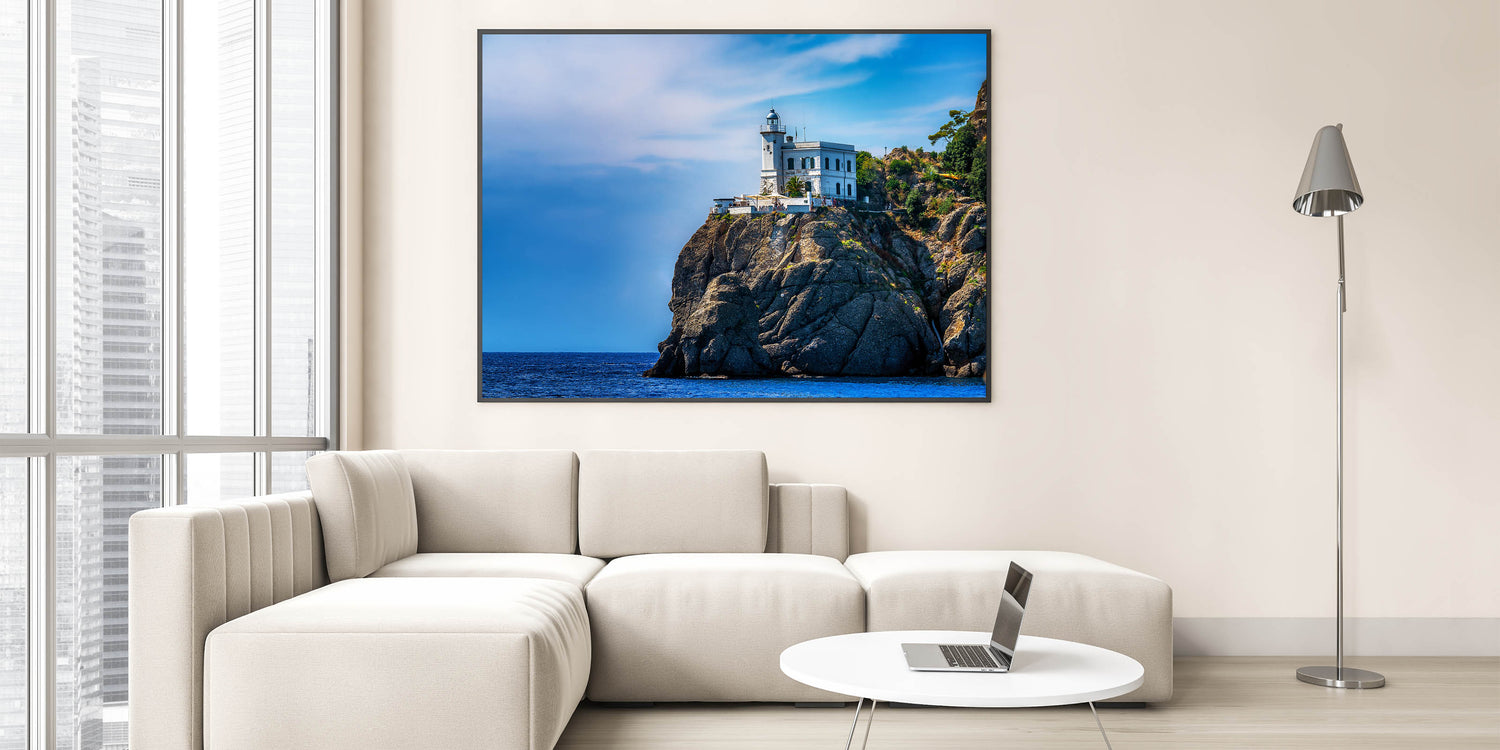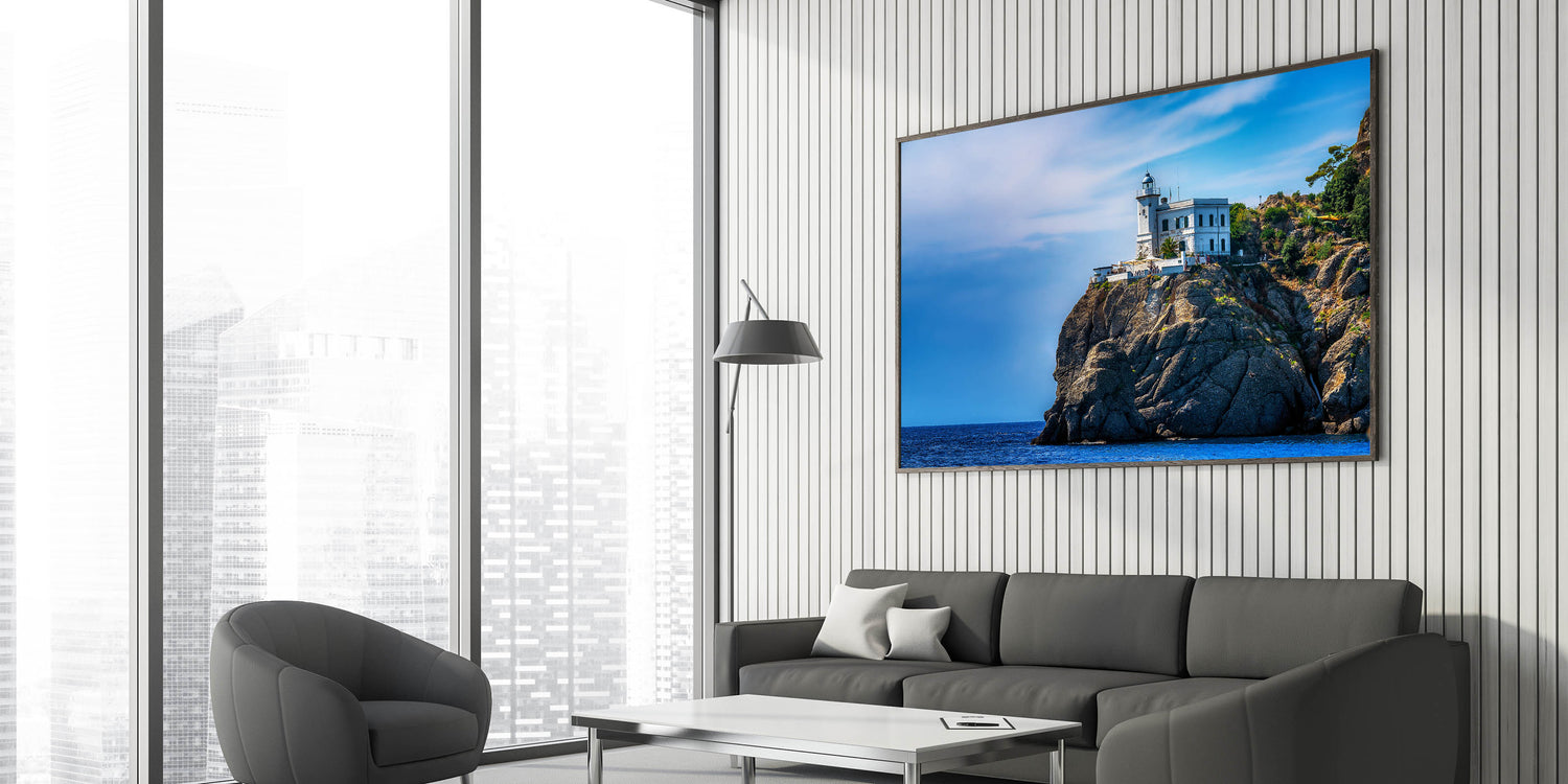 Bring the dramatic beauty of the Italian coast into your home with this stunning artwork featuring a lighthouse perched atop the rugged cliffs of Portofino. The brilliant blue sky and deep azure waters create a striking contrast with the rocky landscape, making this Portofino wall art perfect for those who love coastal decor. This Scenic Portofino canvas captures the timeless charm of the Italian Riviera, providing a serene yet powerful addition to any room.