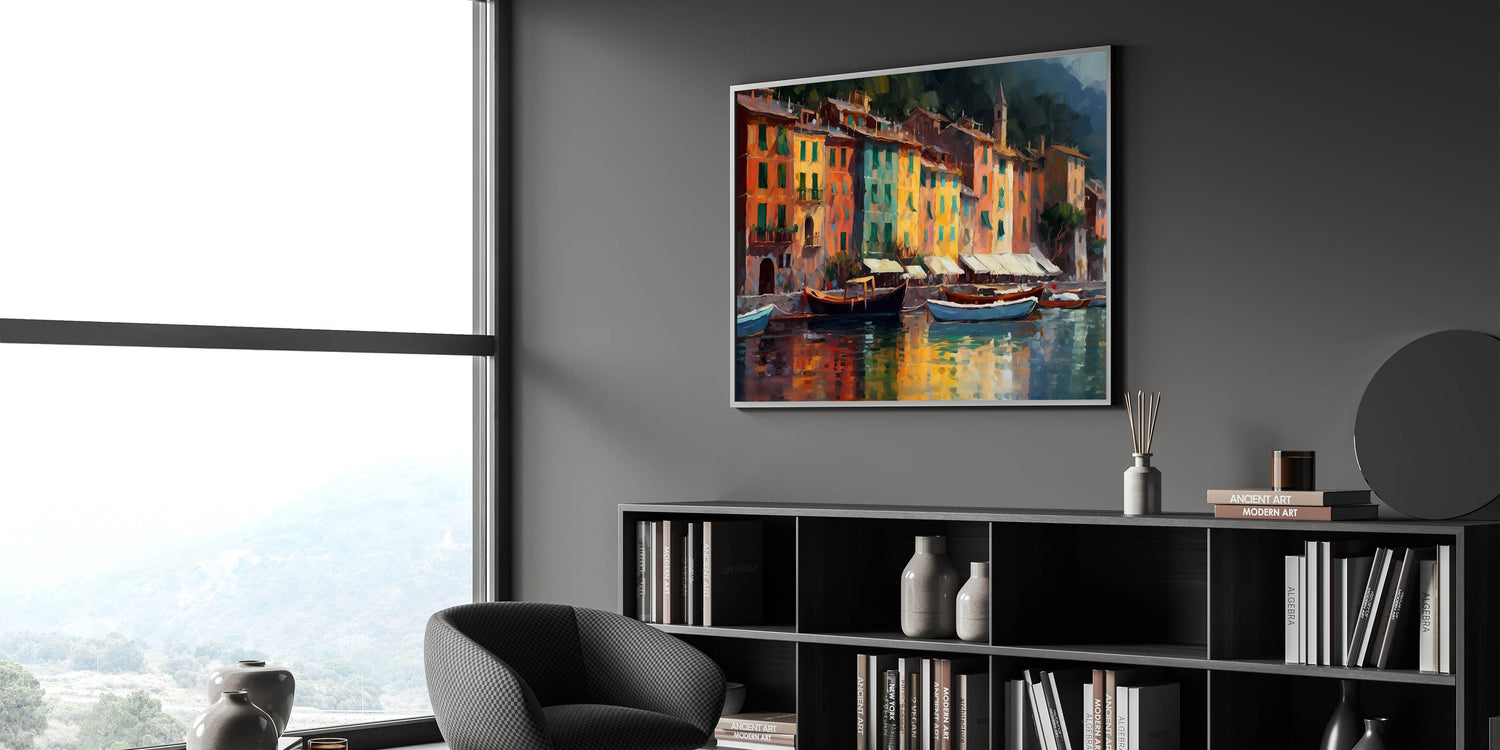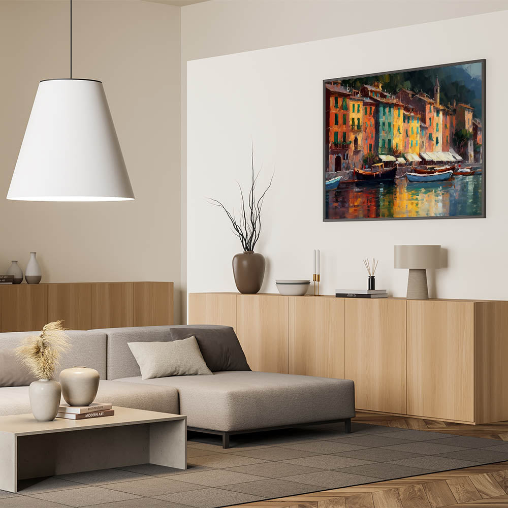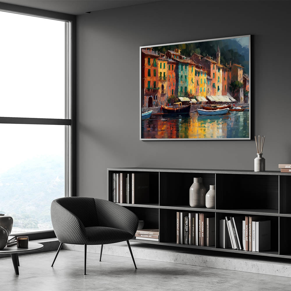 Bring the warmth and color of Portofino into your home with this beautifully detailed artwork. This scenic canvas captures the lively essence of the Italian Riviera, showcasing the brightly colored buildings and their reflections along the peaceful harbor. The rich, warm tones of this Liguria art piece make it perfect for those who love vibrant Mediterranean decor, adding a touch of Italian coastal charm to any space.