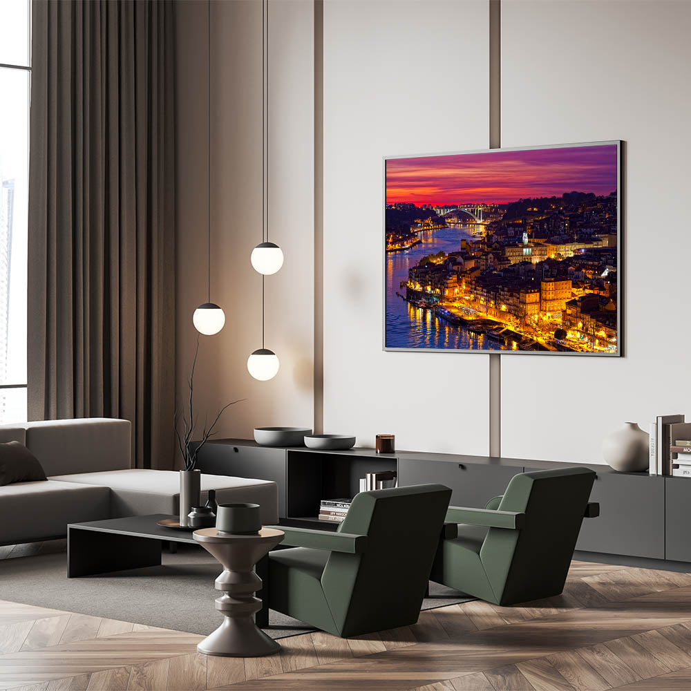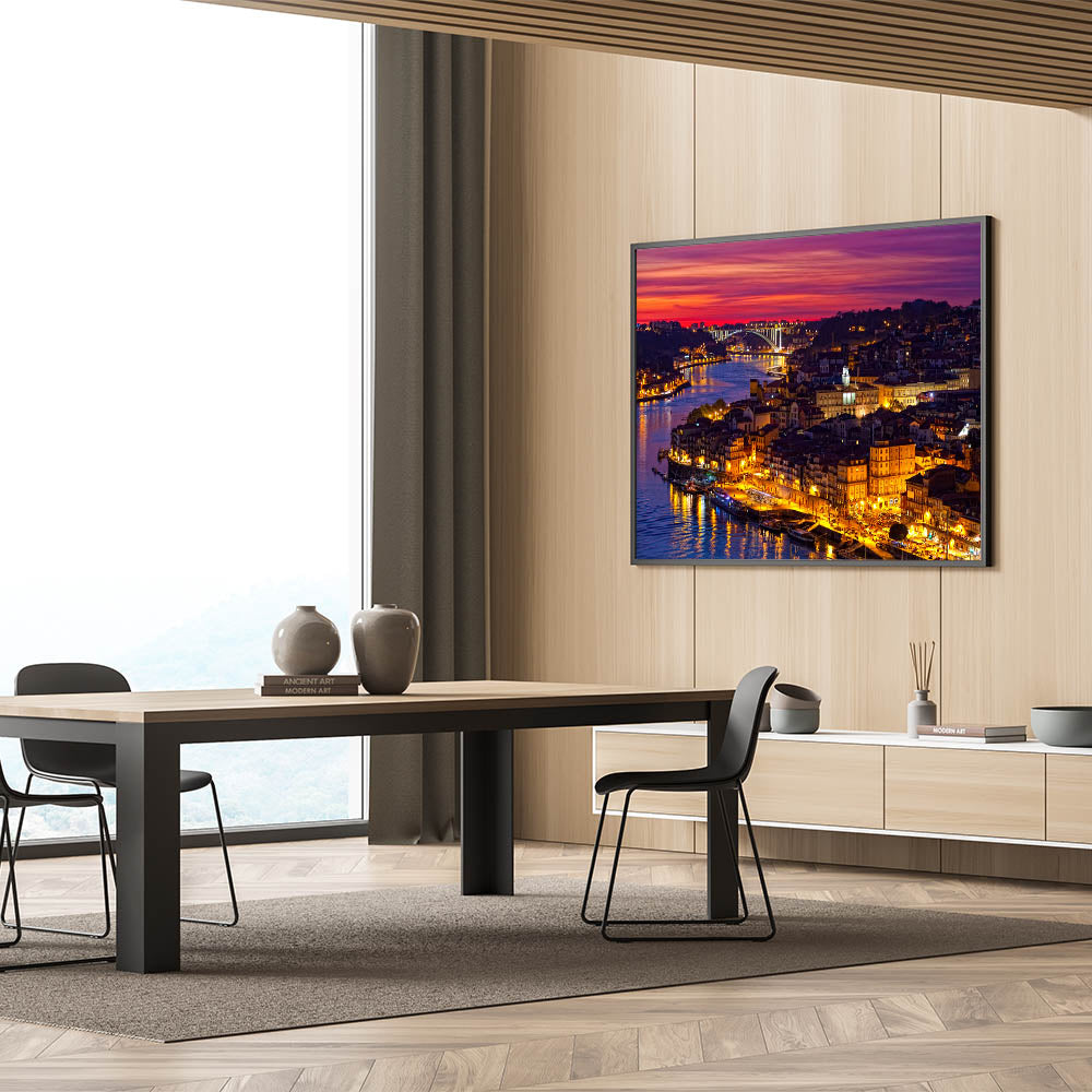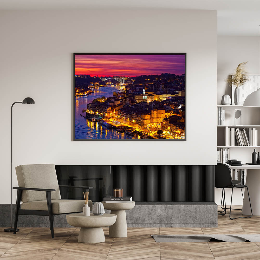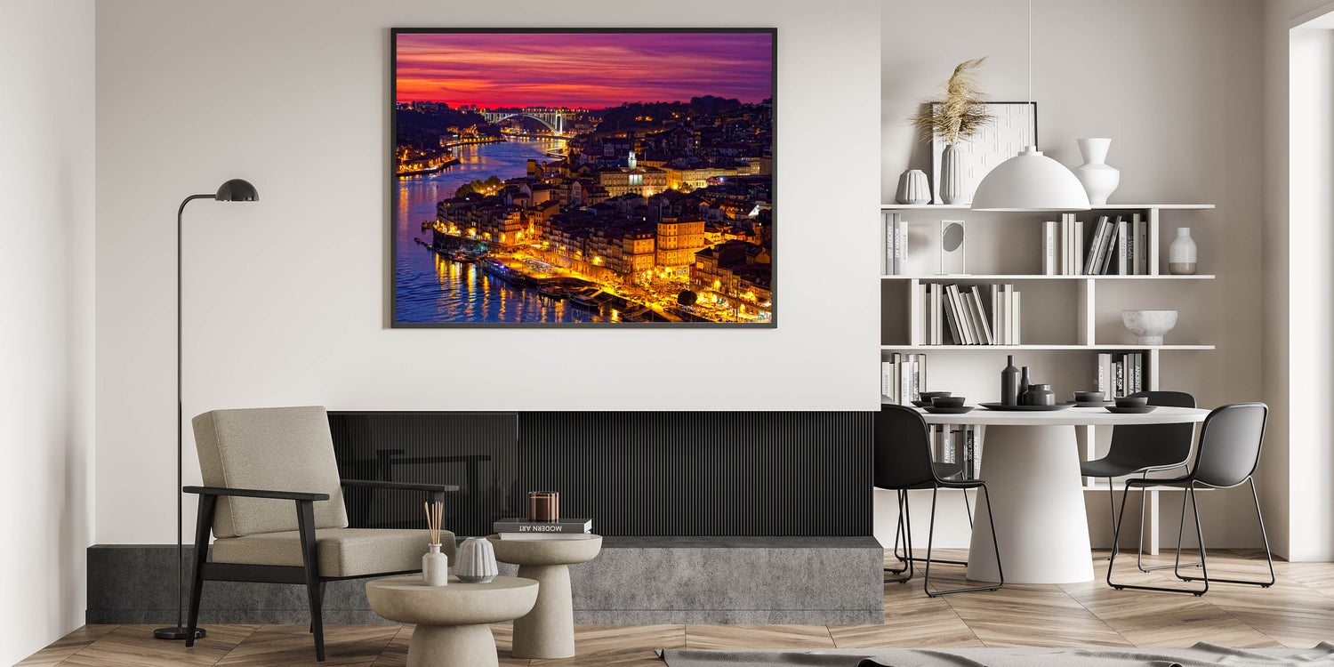 Immerse yourself in the vibrant nightlife of Porto with this stunning Porto Photography Art that captures the illuminated riverside at night. The golden glow of lights reflecting off the Douro River creates a mesmerizing contrast with the deep, purple sky, making this beautiful Porto wall decor a striking addition to any room.