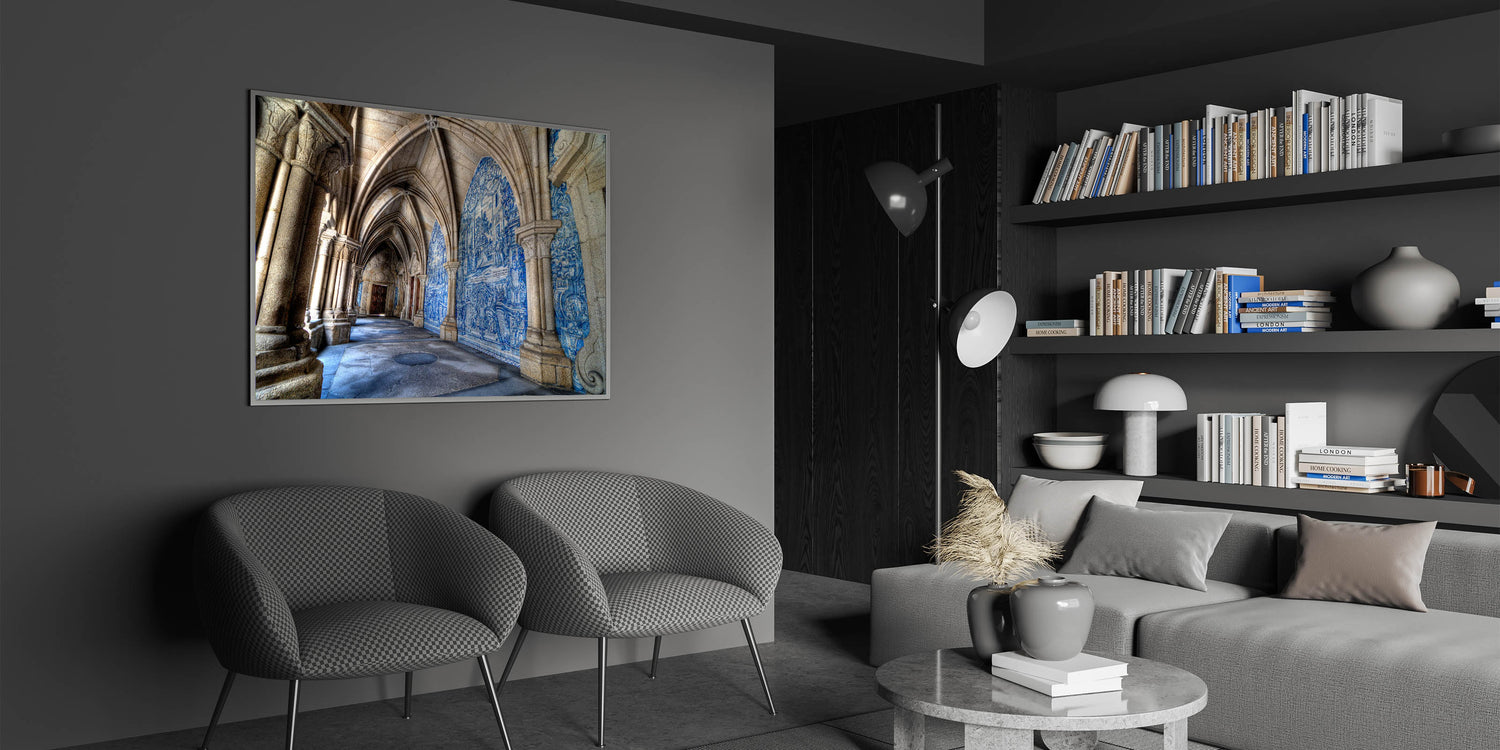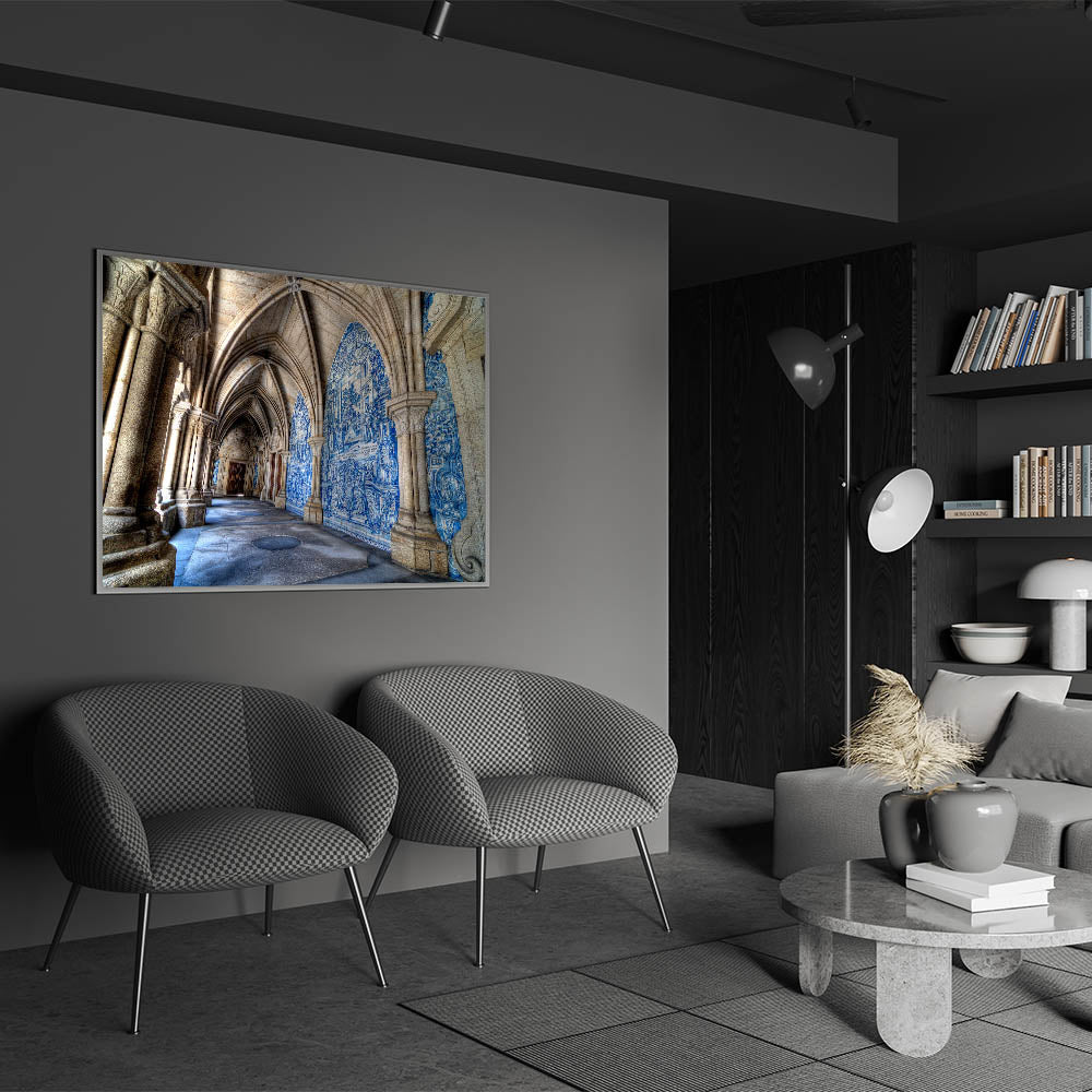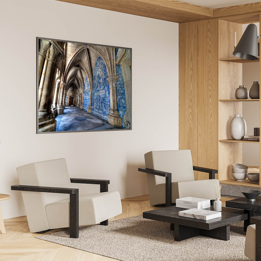 Bring a piece of Portugal’s architectural beauty to your home with this stunning Porto Wall Art featuring the intricate blue-tiled corridors of a historic Porto cathedral. This beautiful Porto wall decor captures the essence of the city's rich heritage, making it a perfect piece for anyone who admires Portuguese culture and timeless architecture.