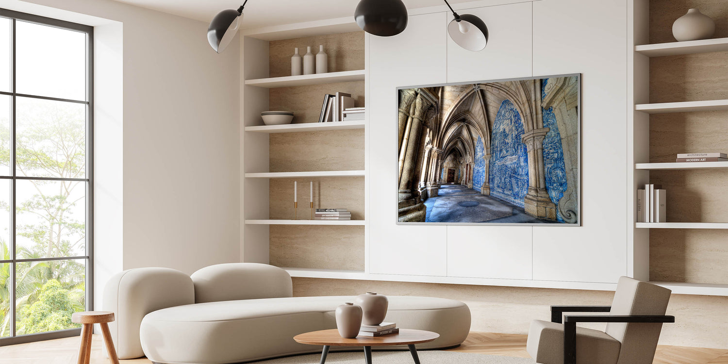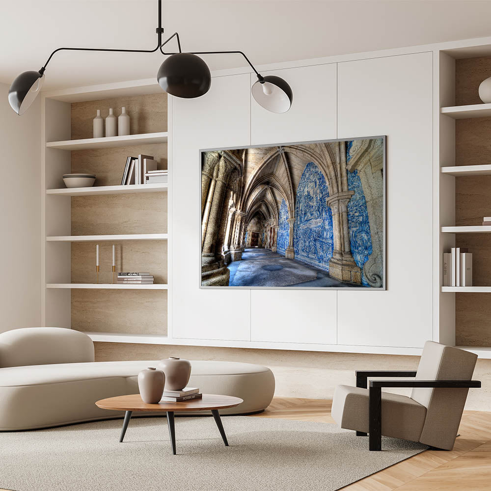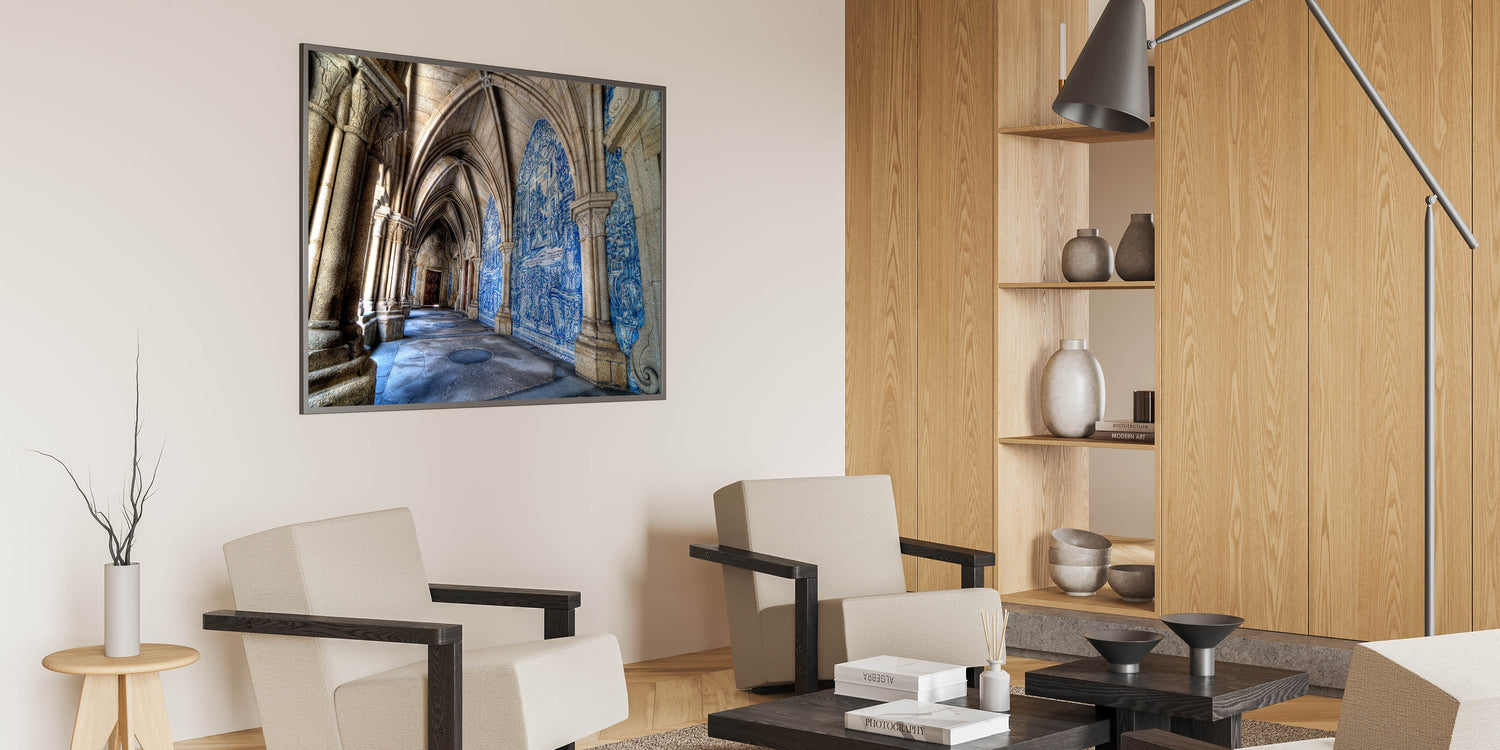Bring a piece of Portugal’s architectural beauty to your home with this stunning Porto Wall Art featuring the intricate blue-tiled corridors of a historic Porto cathedral. This beautiful Porto wall decor captures the essence of the city's rich heritage, making it a perfect piece for anyone who admires Portuguese culture and timeless architecture.
