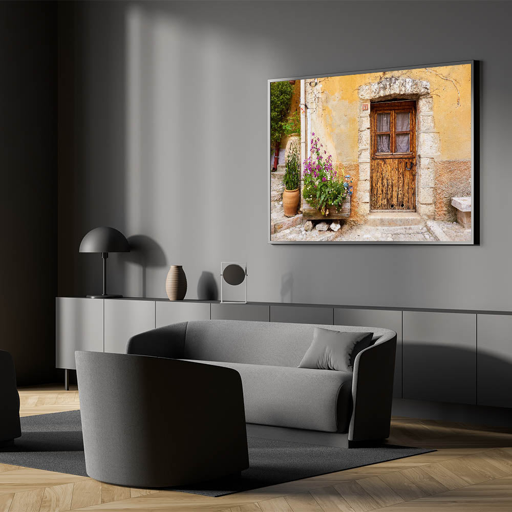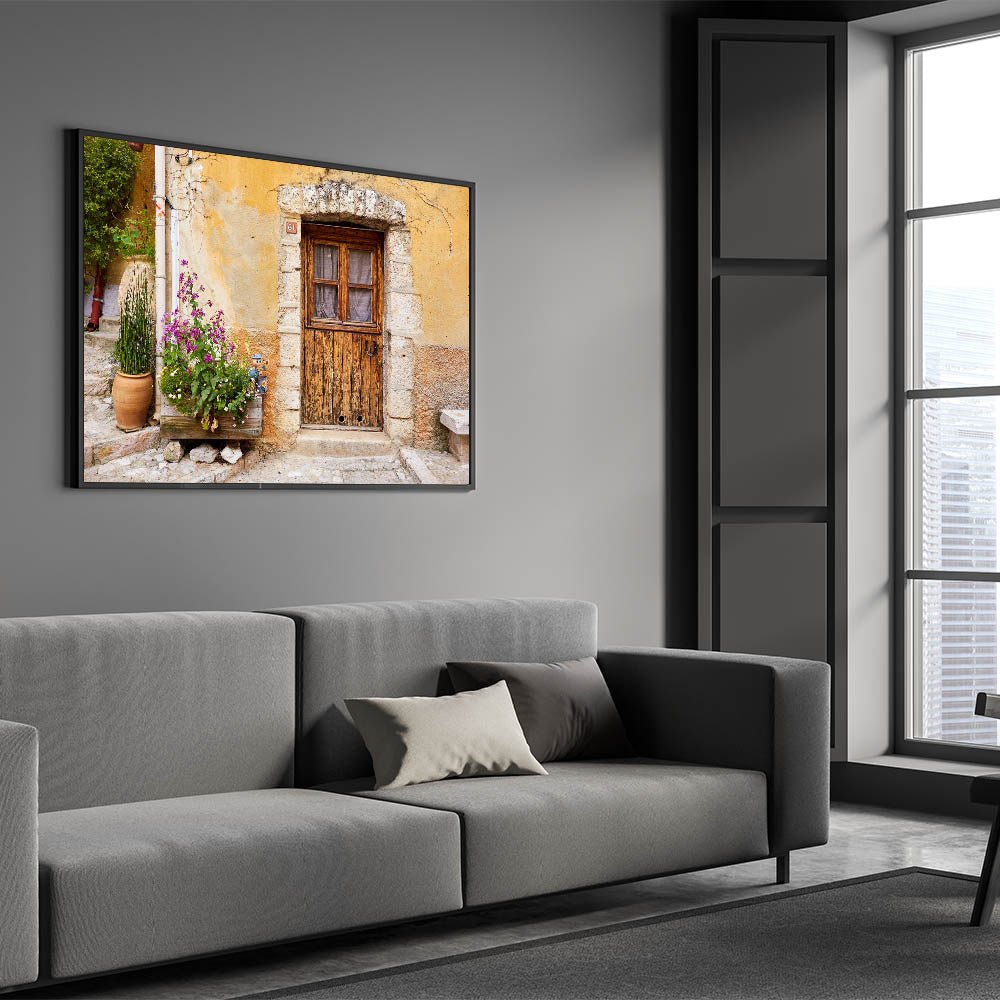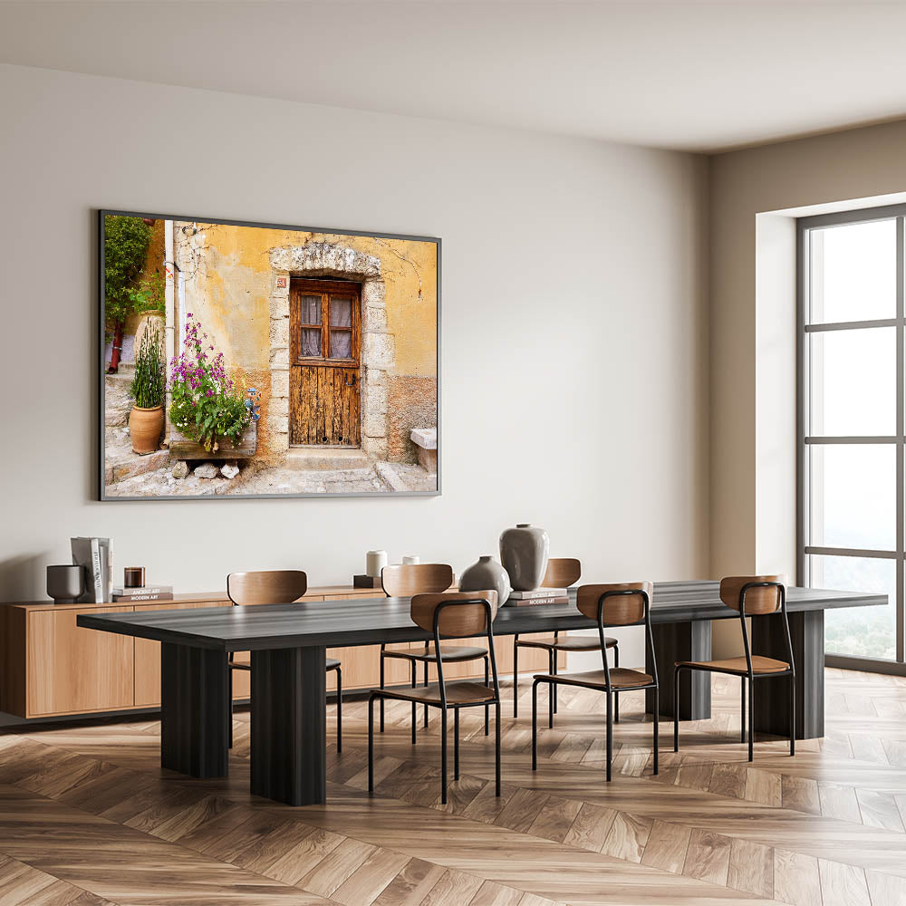Infuse your space with the rustic charm of Provence with this beautiful wall art, showcasing an aged wooden door set against a textured stone wall. The vibrant flowers planted nearby bring a touch of nature to the scene, while the weathered facade tells a story of timeless beauty. This piece is perfect for those who appreciate vintage aesthetics and the quiet elegance of French countryside life.