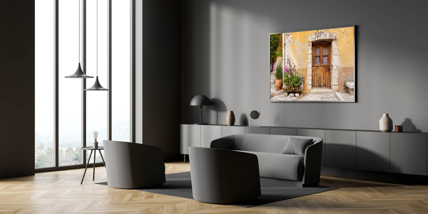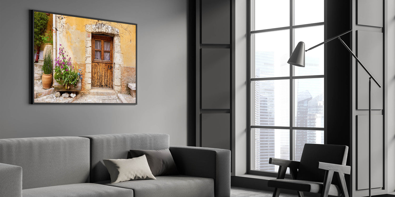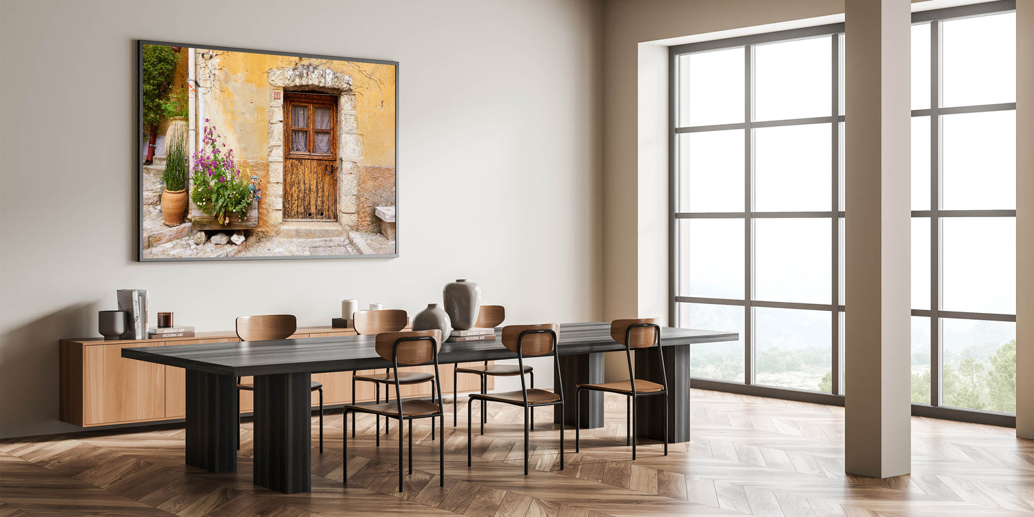 Infuse your space with the rustic charm of Provence with this beautiful wall art, showcasing an aged wooden door set against a textured stone wall. The vibrant flowers planted nearby bring a touch of nature to the scene, while the weathered facade tells a story of timeless beauty. This piece is perfect for those who appreciate vintage aesthetics and the quiet elegance of French countryside life.