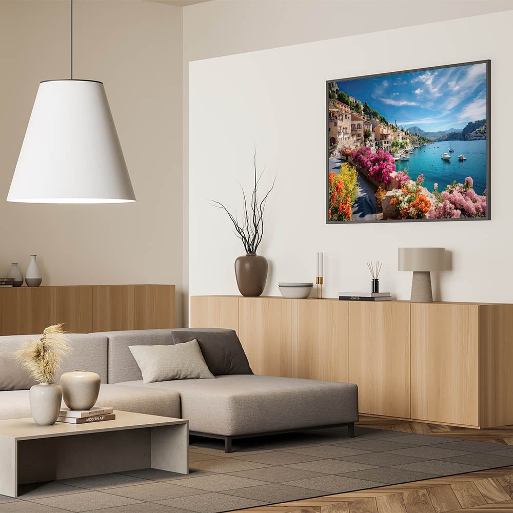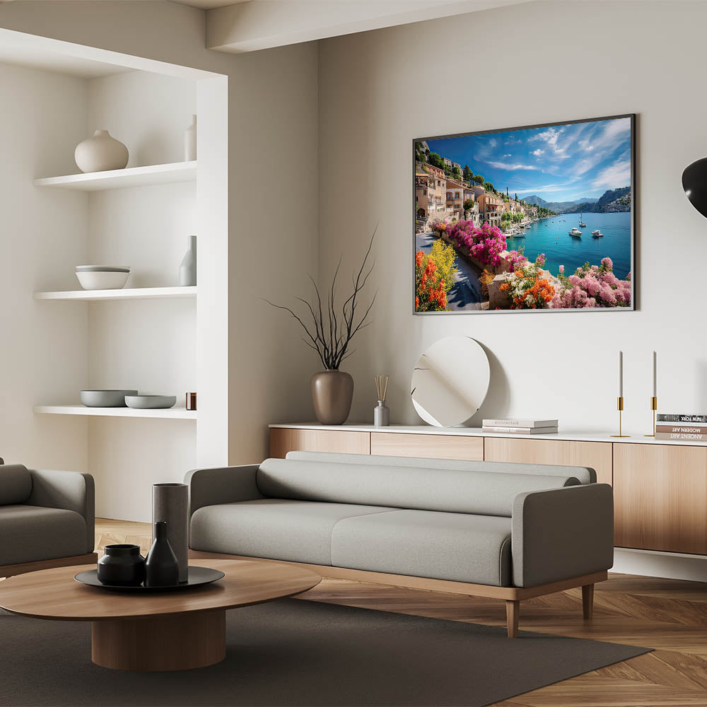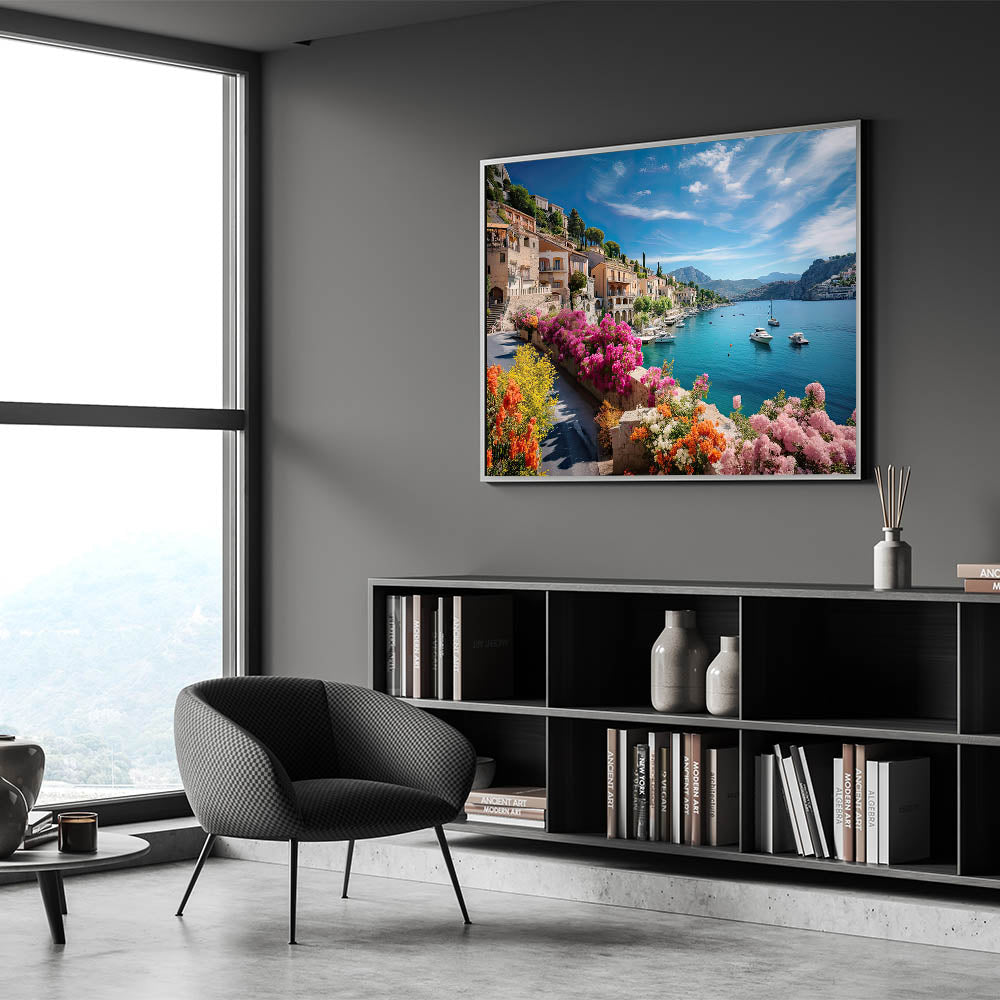 Transport yourself to the heart of Provence with this captivating wall art featuring vibrant flowers and serene waterfront homes. The beautiful blend of colorful architecture and natural scenery brings the peaceful essence of French countryside living right into your home. This Provence Landscape Print adds a touch of rustic French charm to any room, making it perfect for lovers of European elegance.