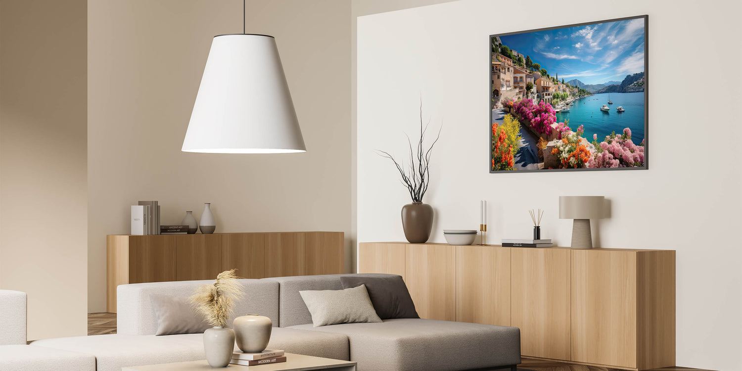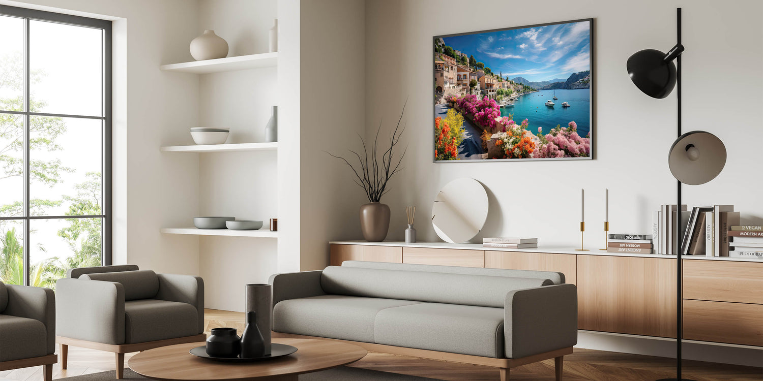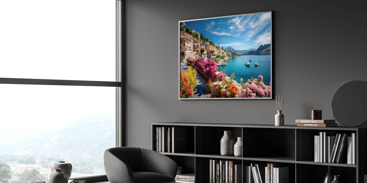 Transport yourself to the heart of Provence with this captivating wall art featuring vibrant flowers and serene waterfront homes. The beautiful blend of colorful architecture and natural scenery brings the peaceful essence of French countryside living right into your home. This Provence Landscape Print adds a touch of rustic French charm to any room, making it perfect for lovers of European elegance.