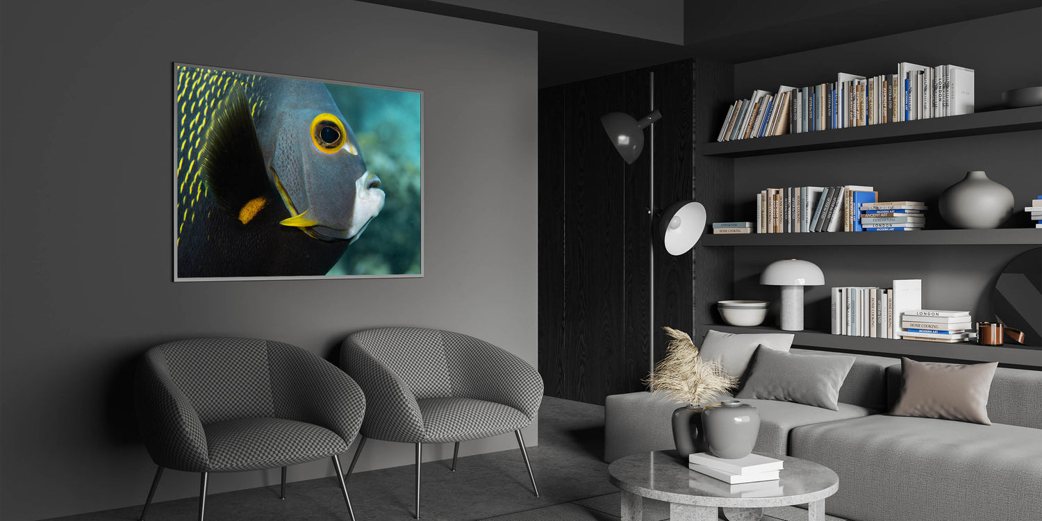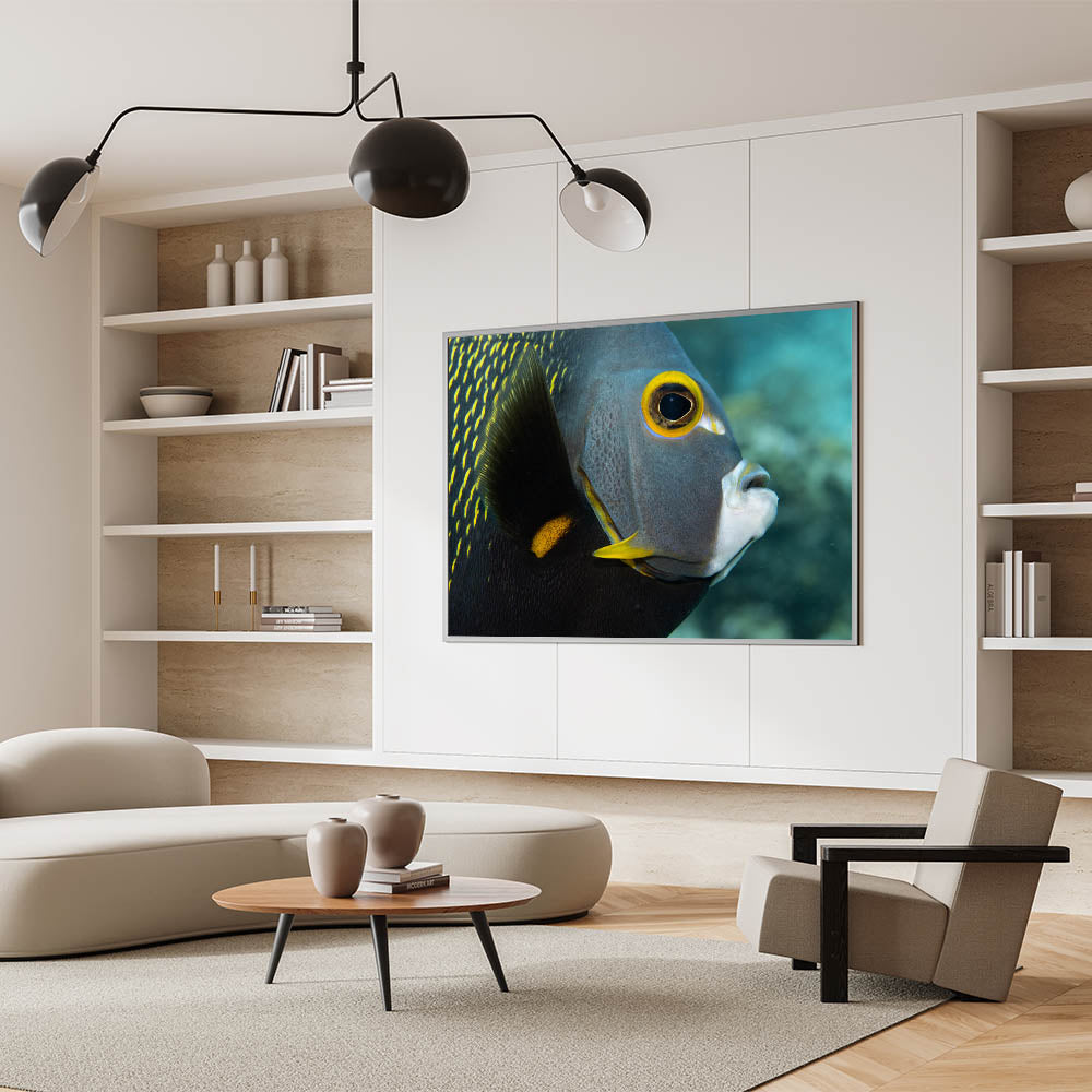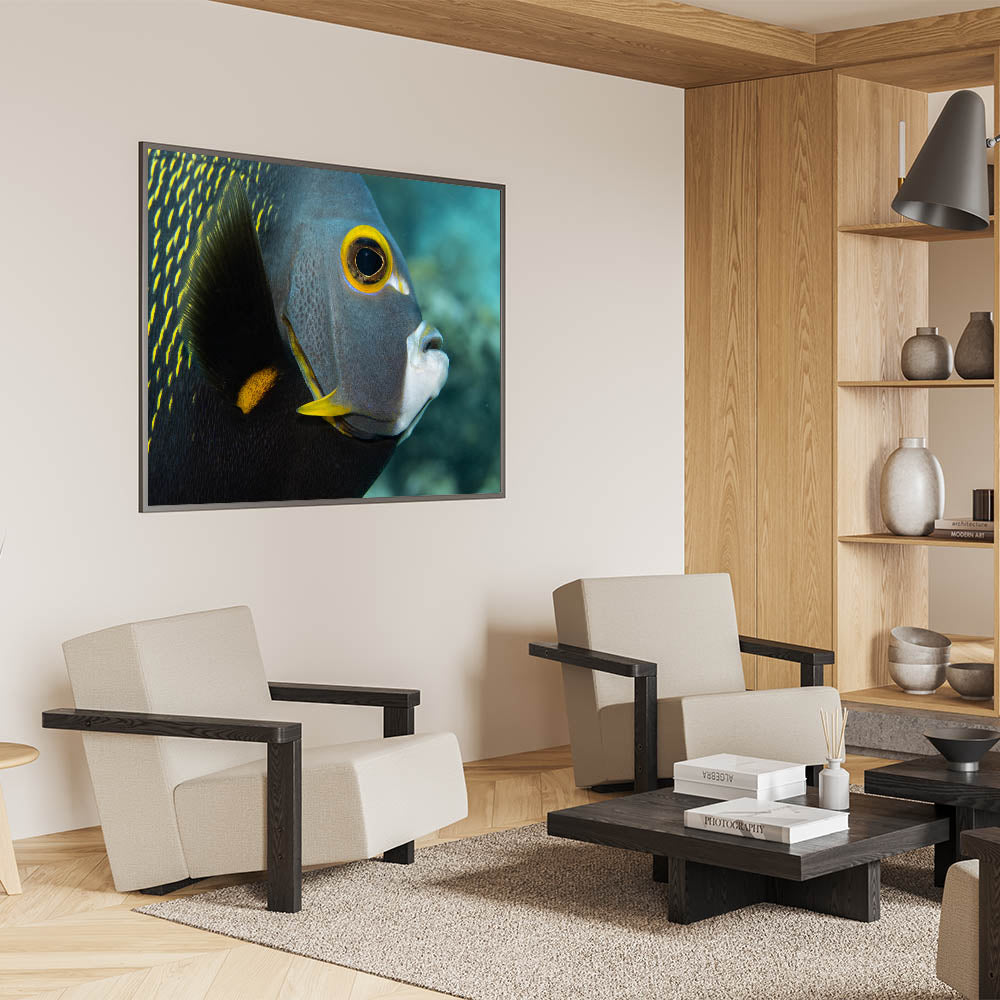 Dive into the vibrant world of Puerto Rican marine life with this stunning close-up of a tropical fish. This captivating Caribbean canvas print showcases the intricate details and vibrant colors of Puerto Rico’s underwater wildlife. The fish’s bold yellow markings stand out against its dark, textured body, creating a striking contrast that adds depth and intrigue to the piece. Perfect for lovers of aquatic and marine-inspired decor, this artwork brings the beauty of Puerto Rico's coastal life into any space.