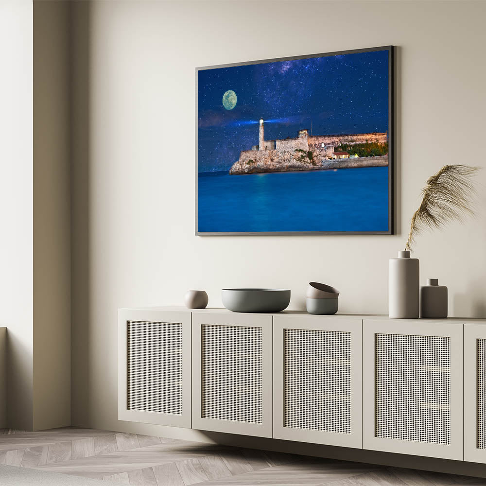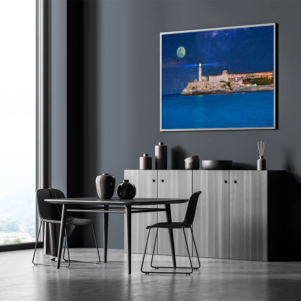 Illuminate your home with the magic of Puerto Rico Photography with this captivating night scene featuring a lighthouse under a moonlit sky. This Caribbean Islands Artwork showcases the rugged coastal beauty of Puerto Rico, enhanced by the striking contrast between the deep blue ocean and the starry night sky. The lighthouse stands tall, guiding ships with its light, adding an element of wonder and calm to your decor.